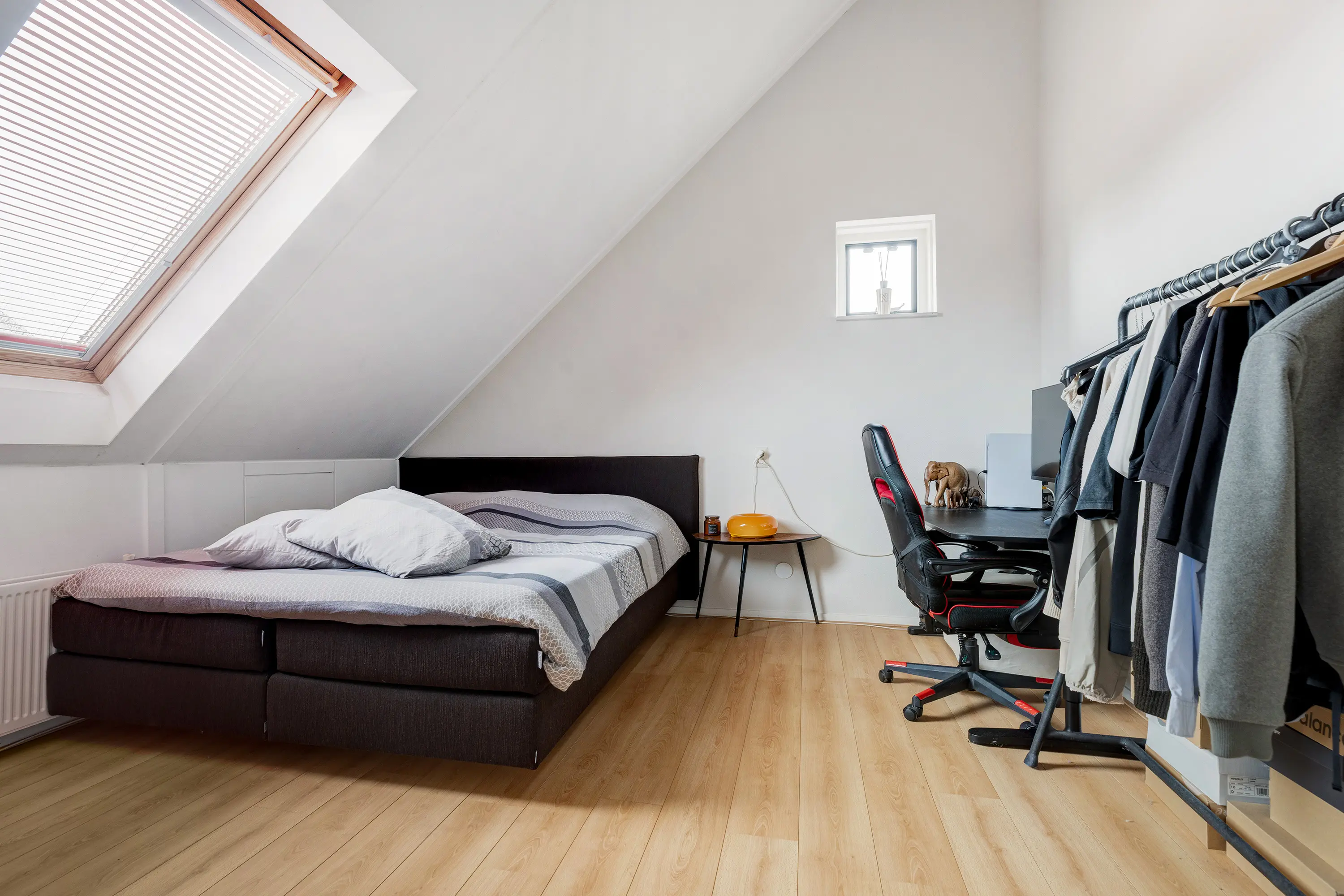 De derde slaapkamer ligt aan de achterzijde en heeft een hoge nok, een groot Velux-dakraam en een laminaatvloer, een prettige, lichte ruimte die ook uitstekend dienst kan doen als werkkamer of hobbyruimte.