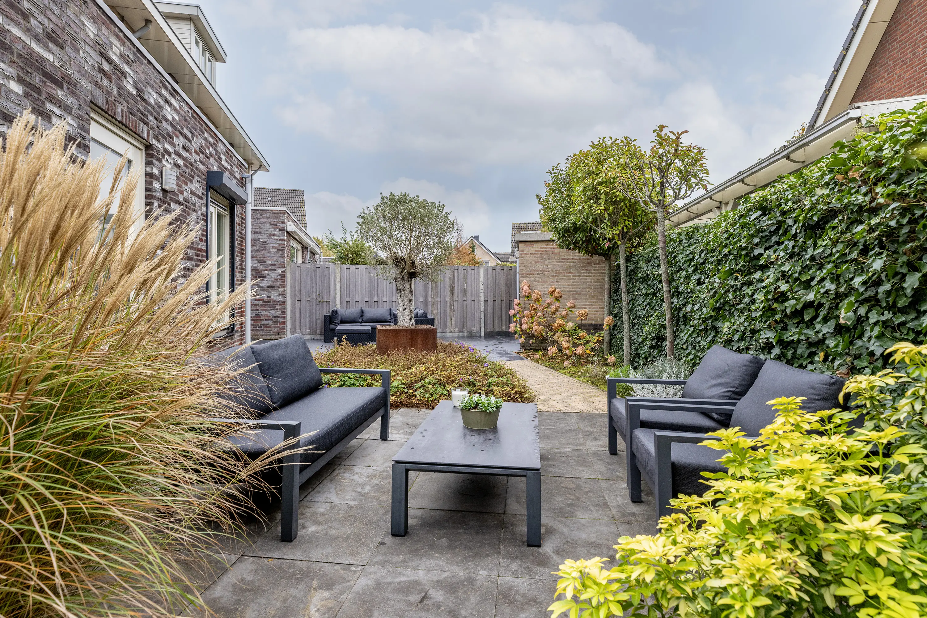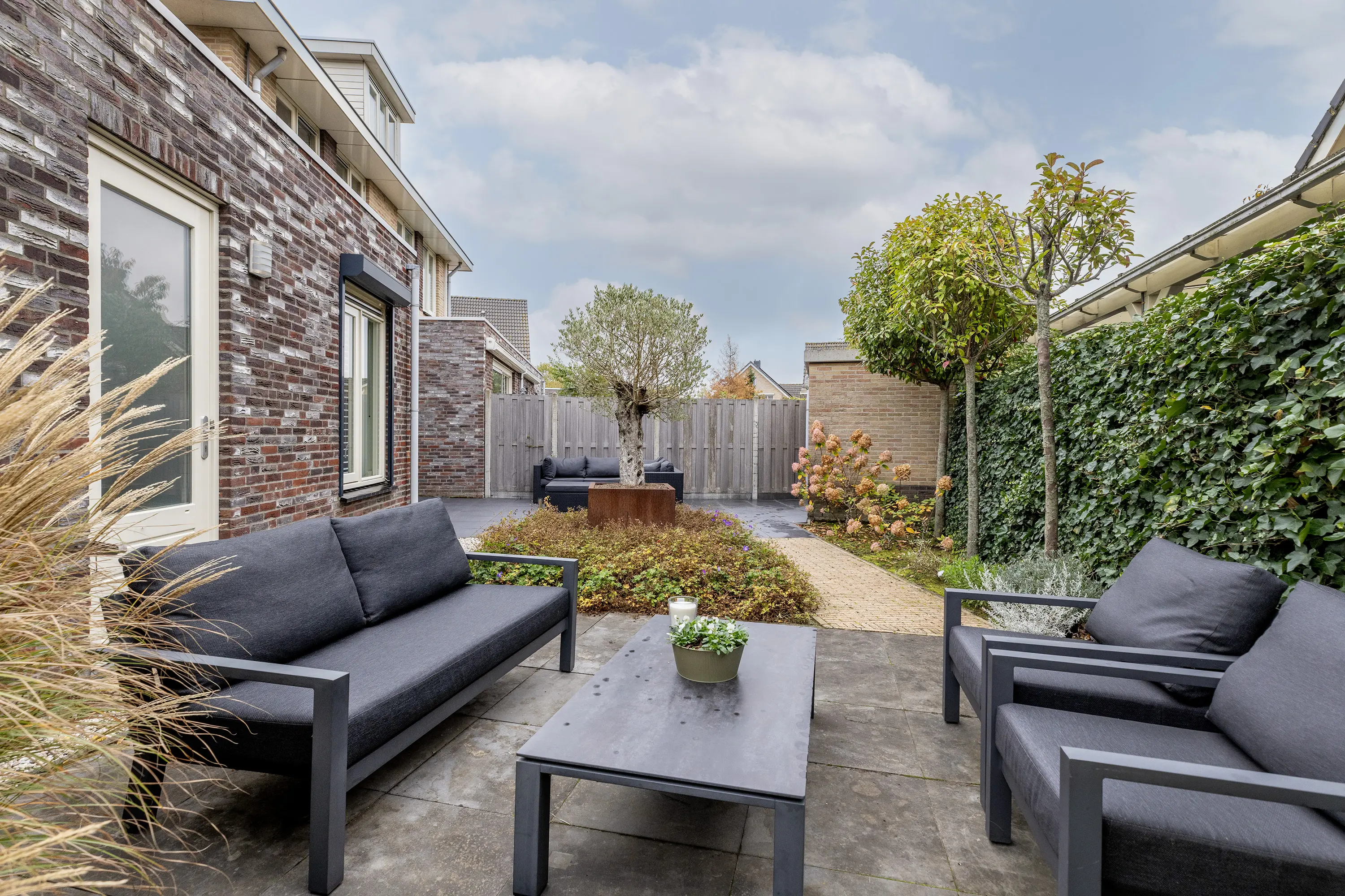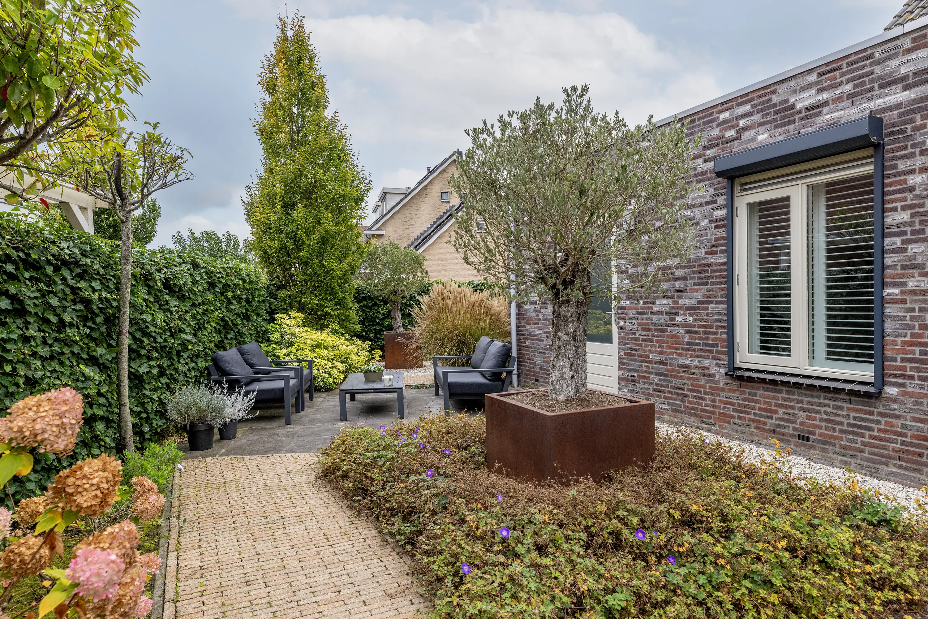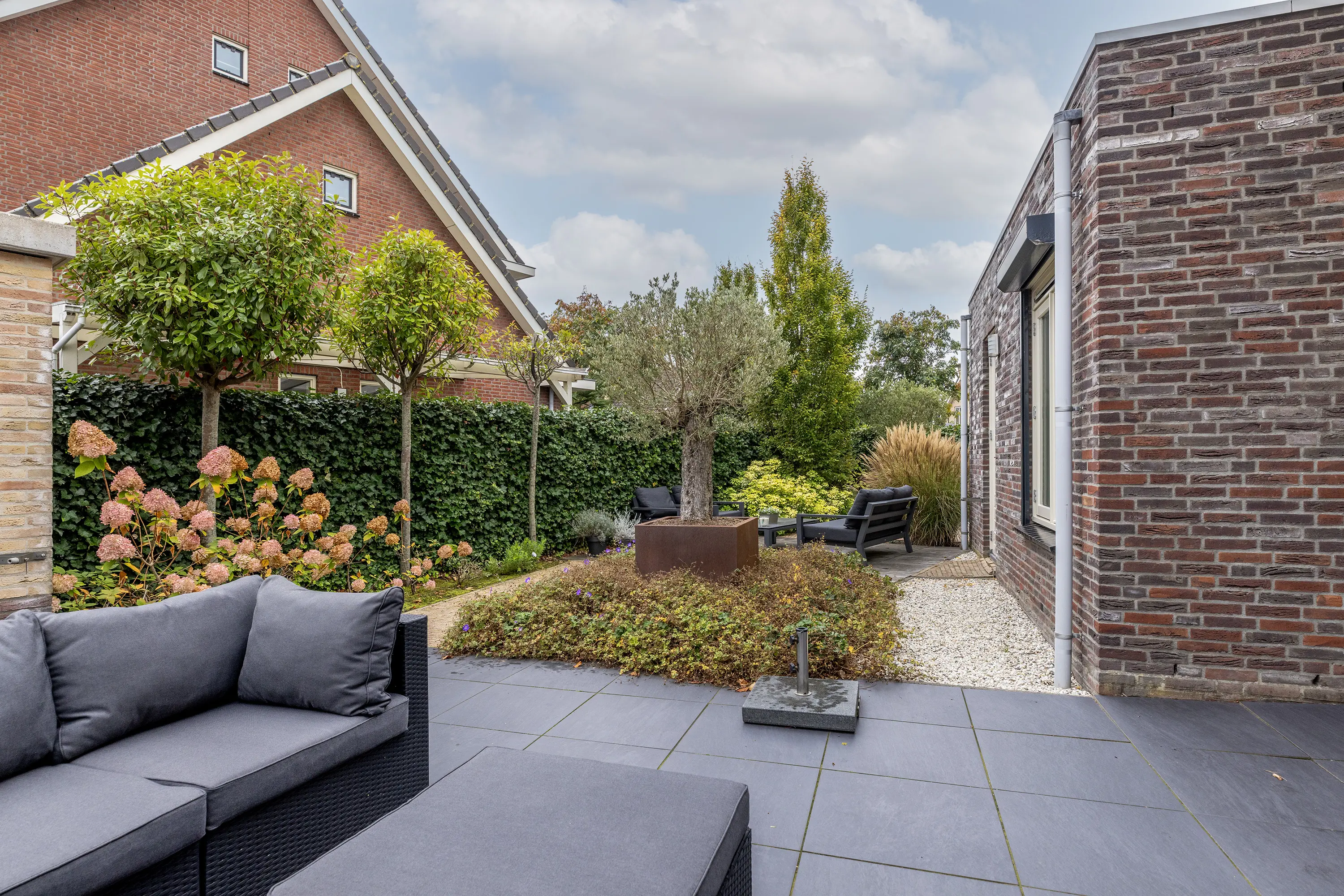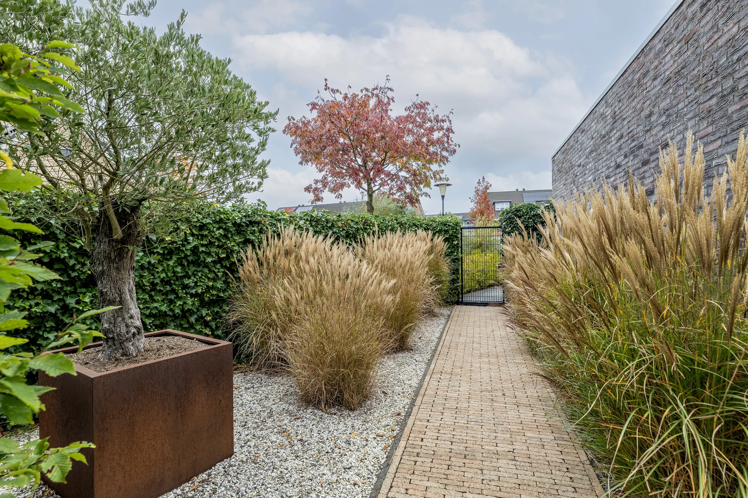 De achtertuin op het zuiden is fraai aangelegd met veel groen, siergrassen en twee robuuste cortenstalen bakken met olijfbomen. Meerdere terrassen bieden heerlijke plekken om van de zon te genieten. De brede zijtuin is afgesloten met een poort en biedt extra privacy.