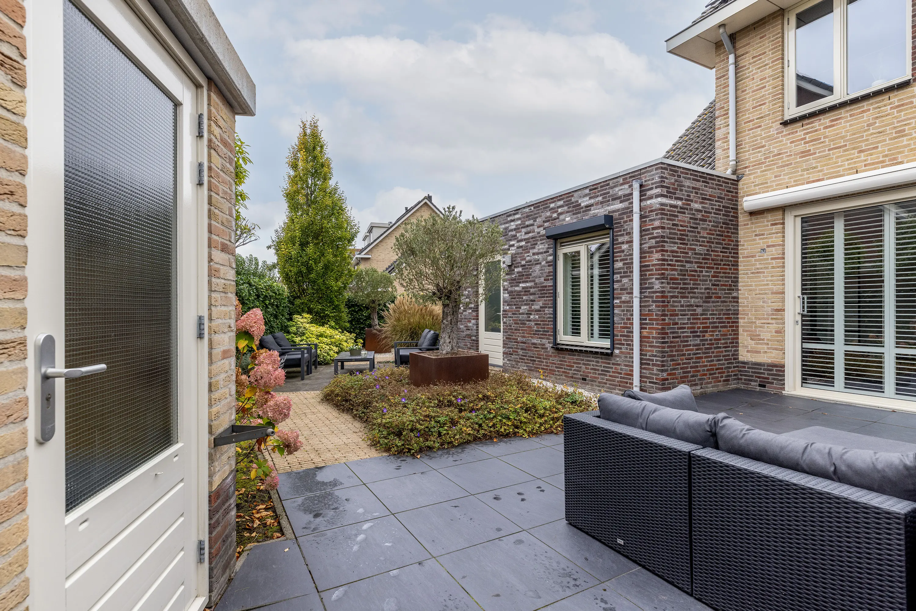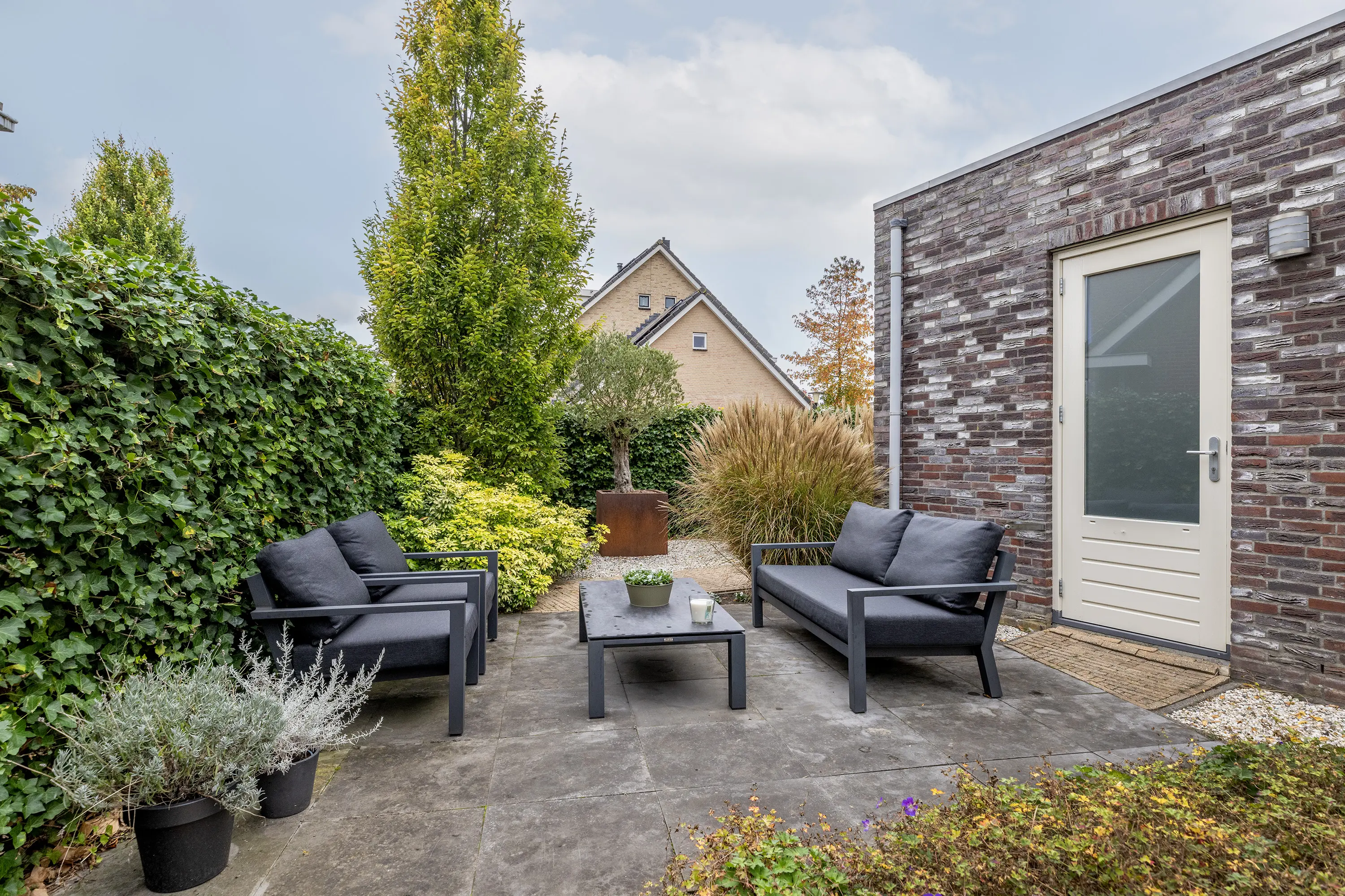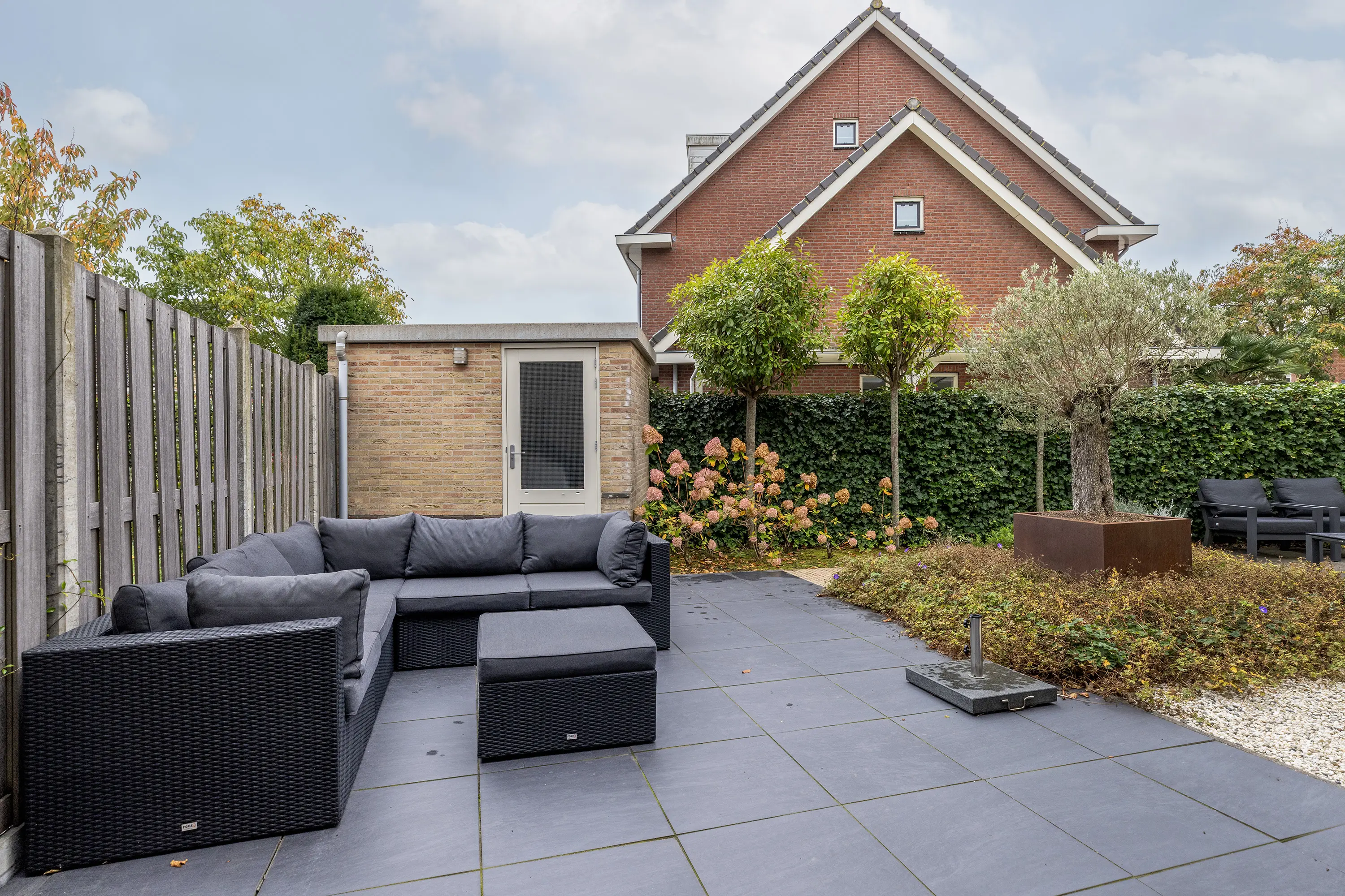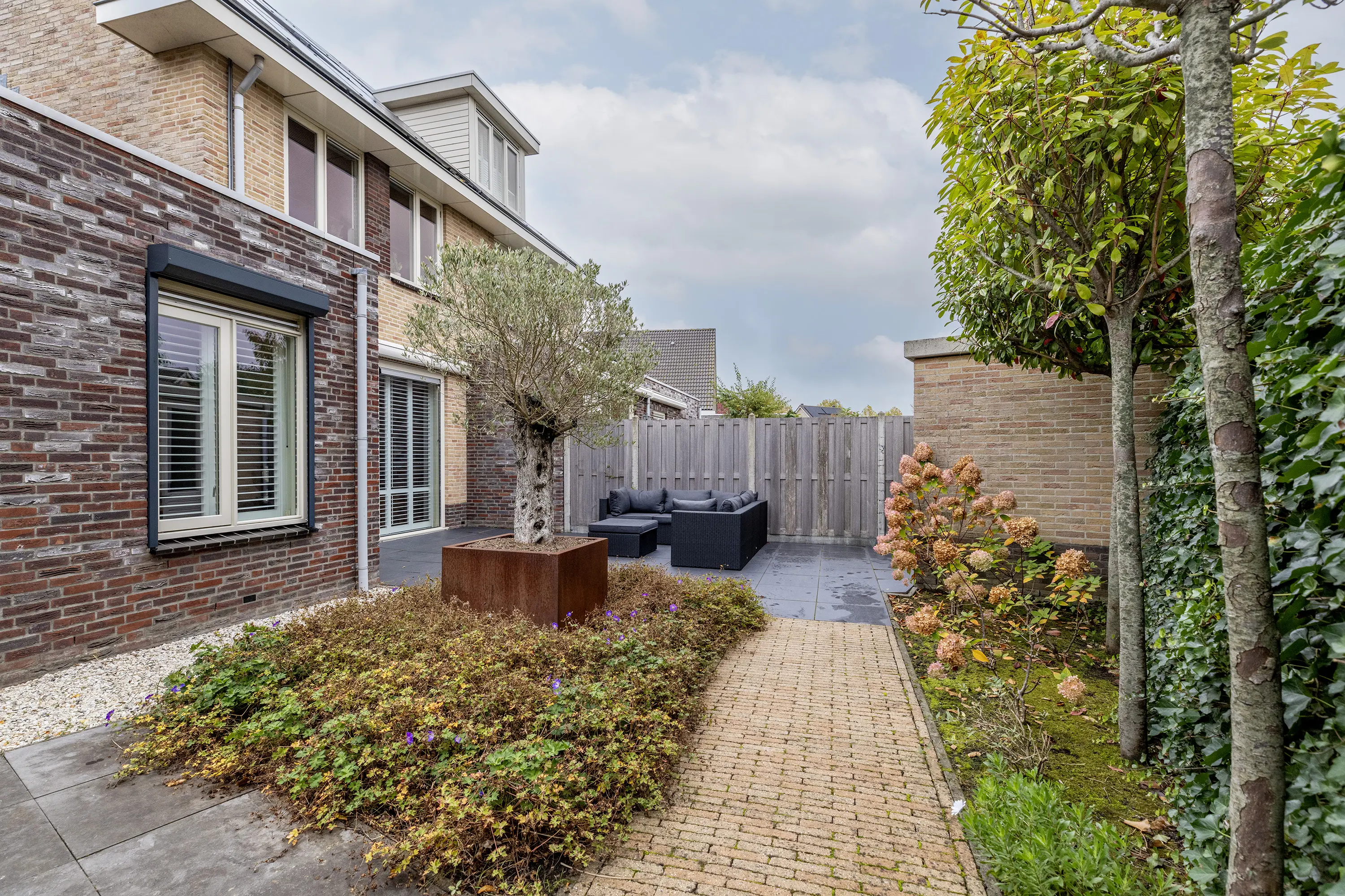 De achtertuin op het zuiden is fraai aangelegd met veel groen, siergrassen en twee robuuste cortenstalen bakken met olijfbomen. Meerdere terrassen bieden heerlijke plekken om van de zon te genieten. De brede zijtuin is afgesloten met een poort en biedt extra privacy.