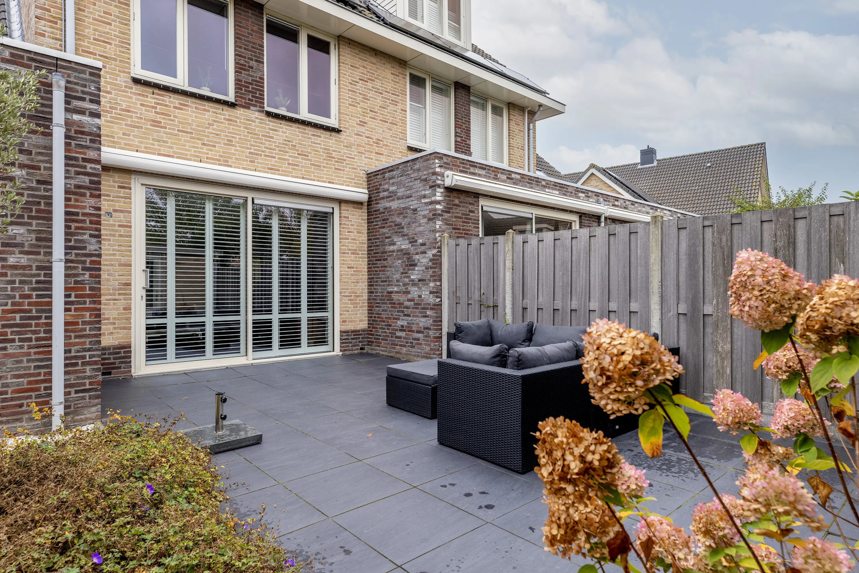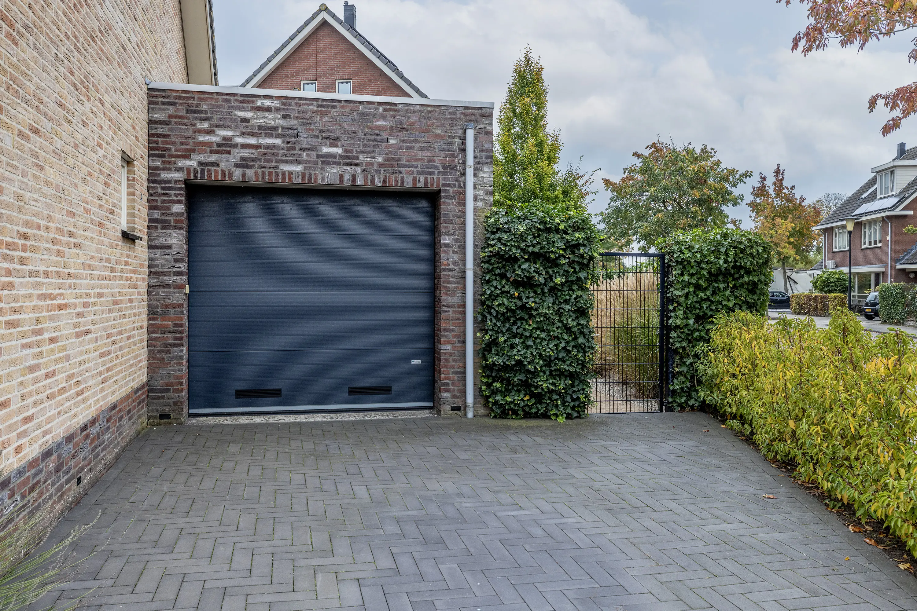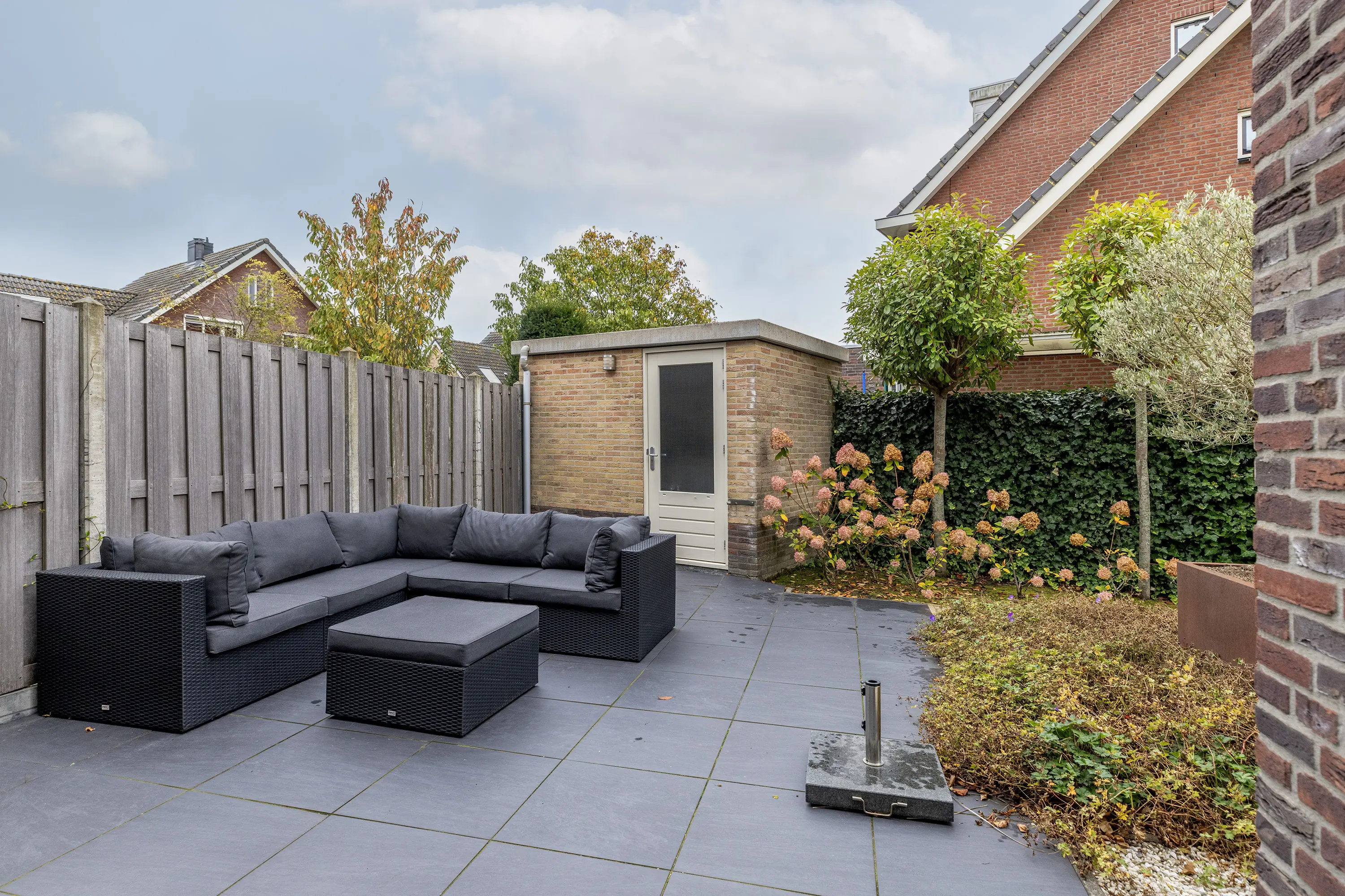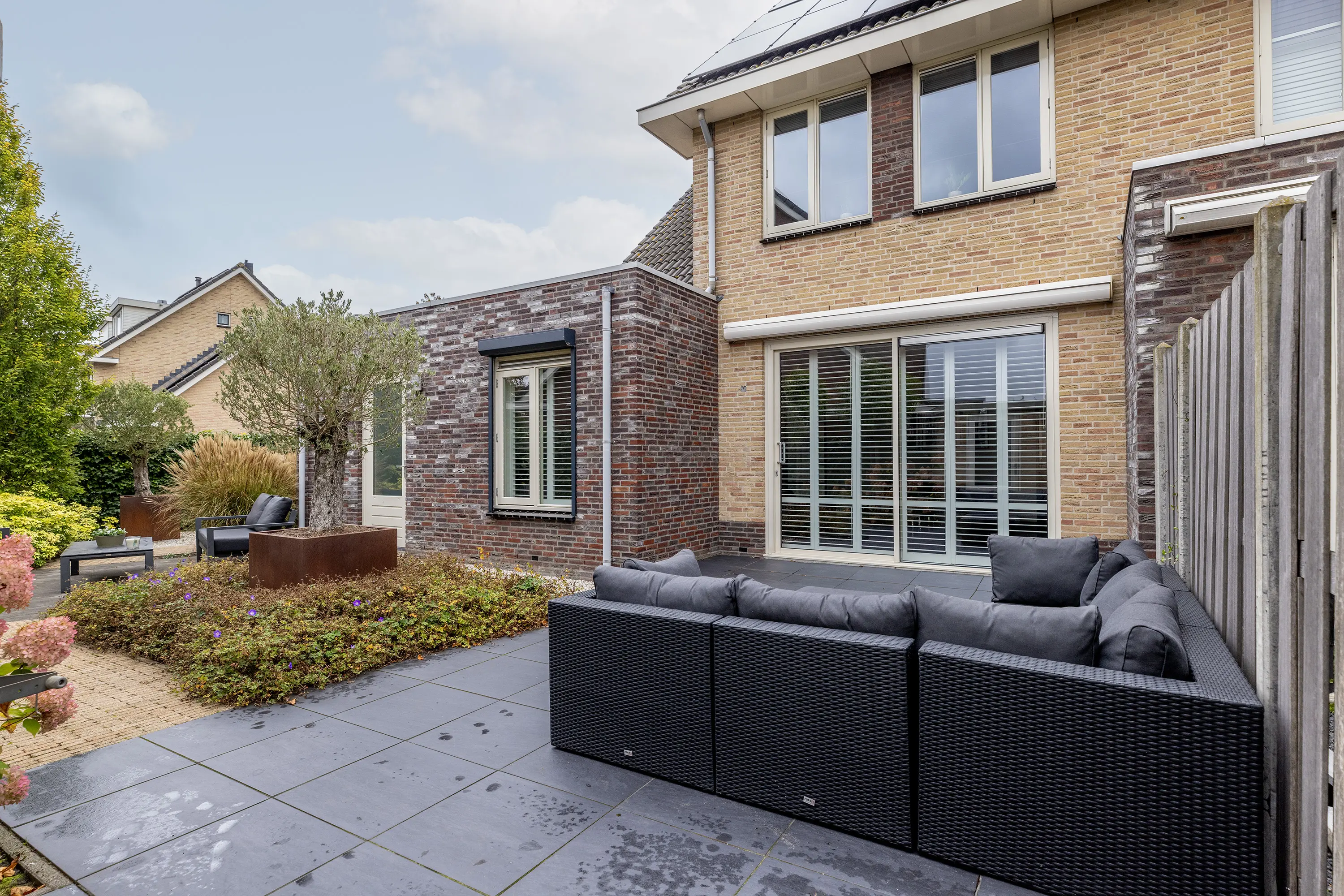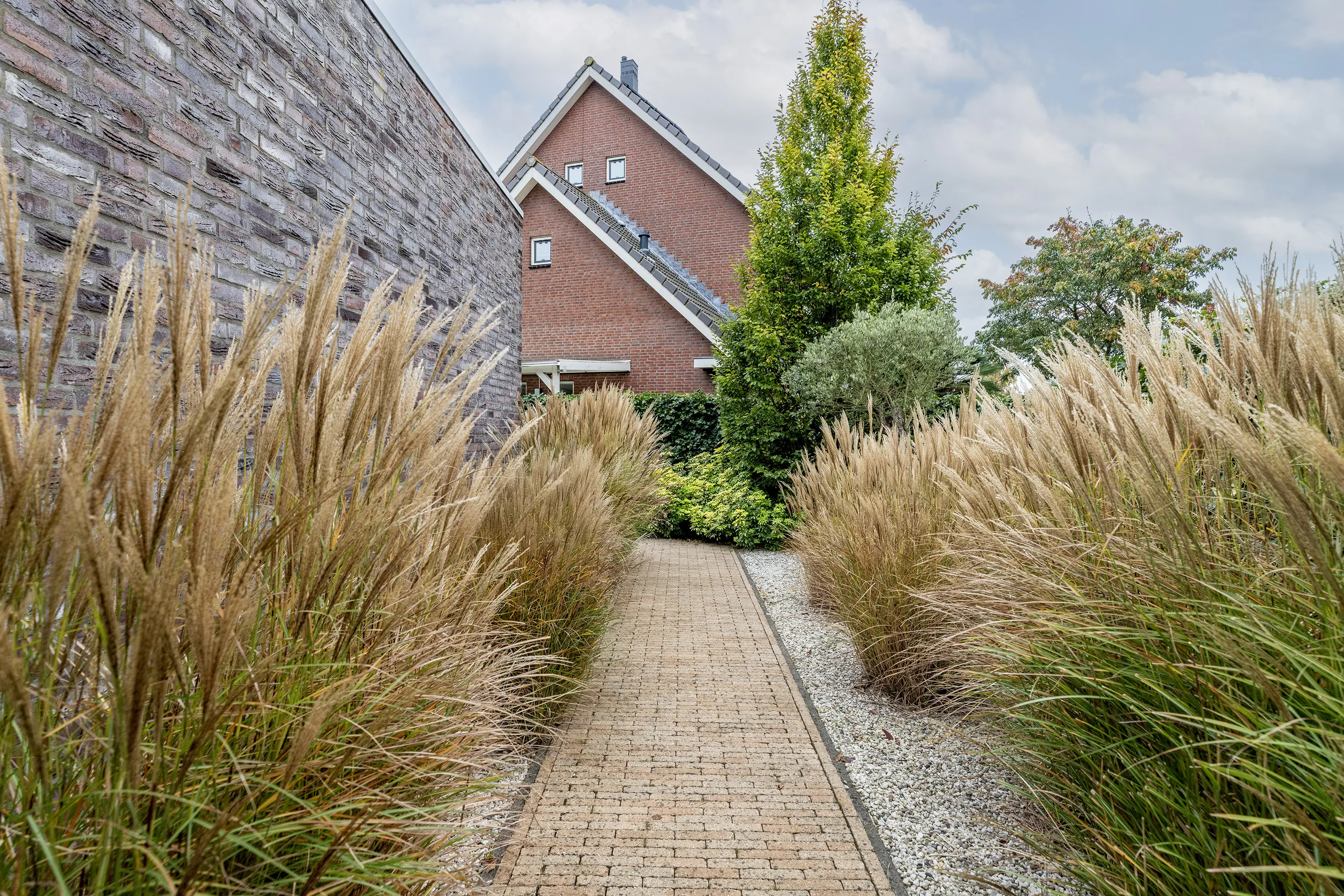 De achtertuin op het zuiden is fraai aangelegd met veel groen, siergrassen en twee robuuste cortenstalen bakken met olijfbomen. Meerdere terrassen bieden heerlijke plekken om van de zon te genieten. De brede zijtuin is afgesloten met een poort en biedt extra privacy.