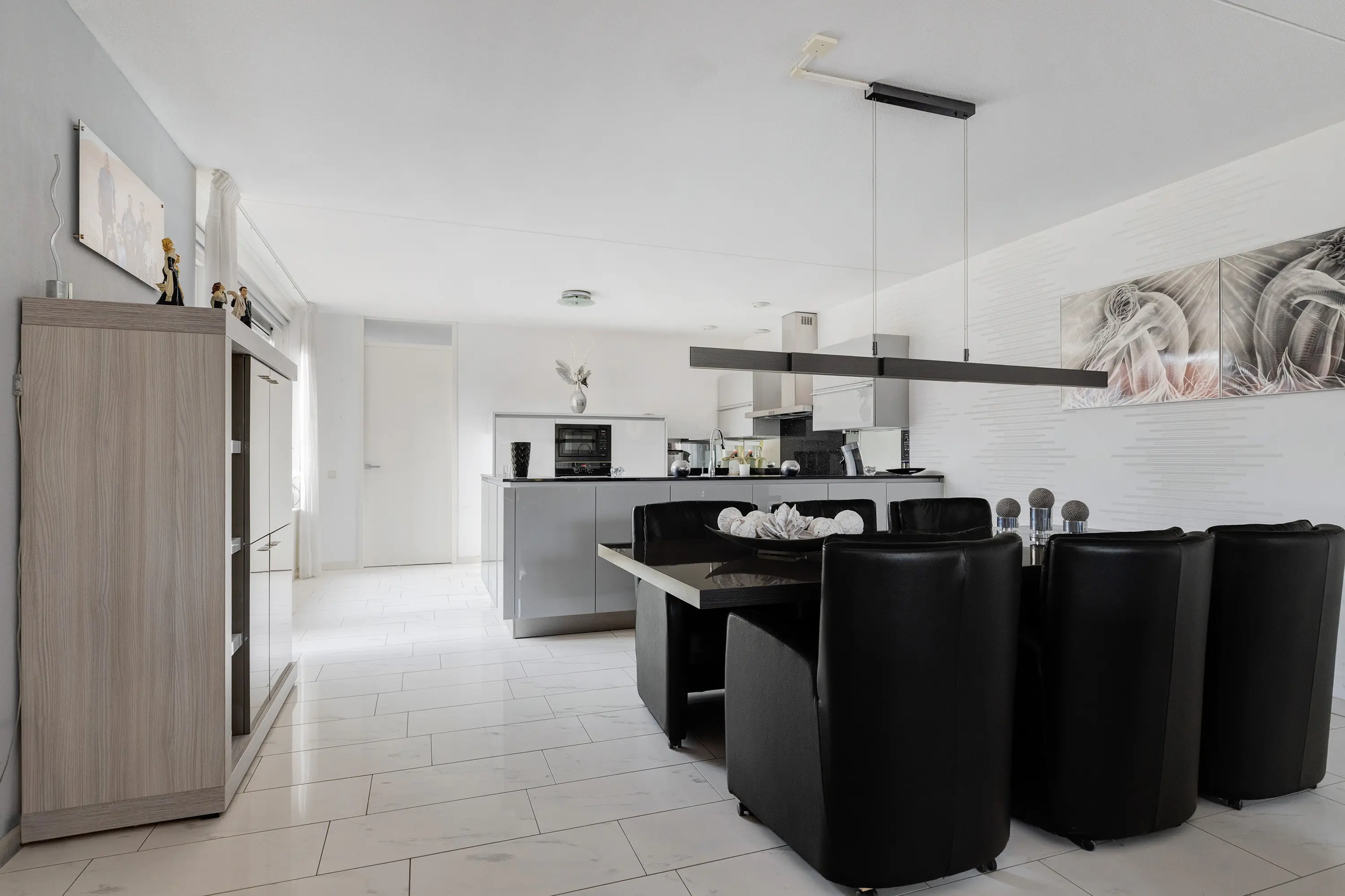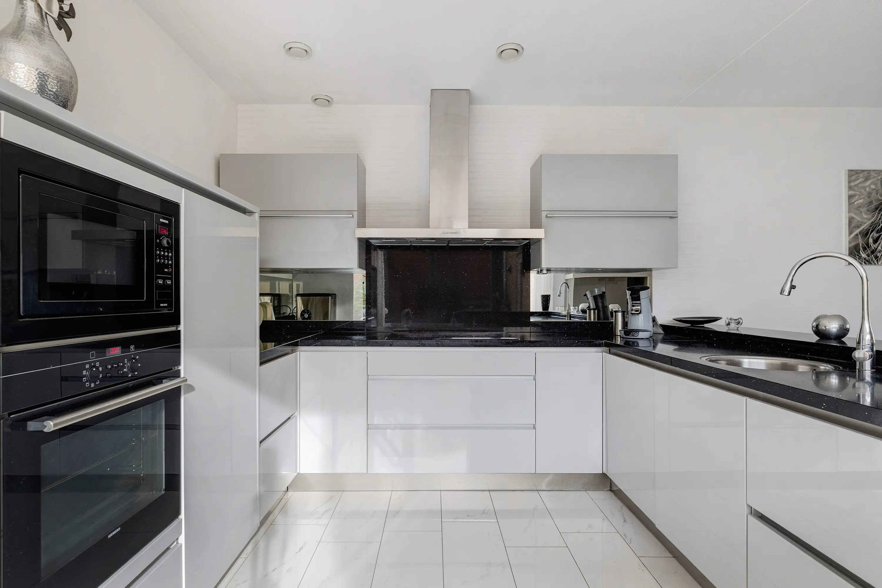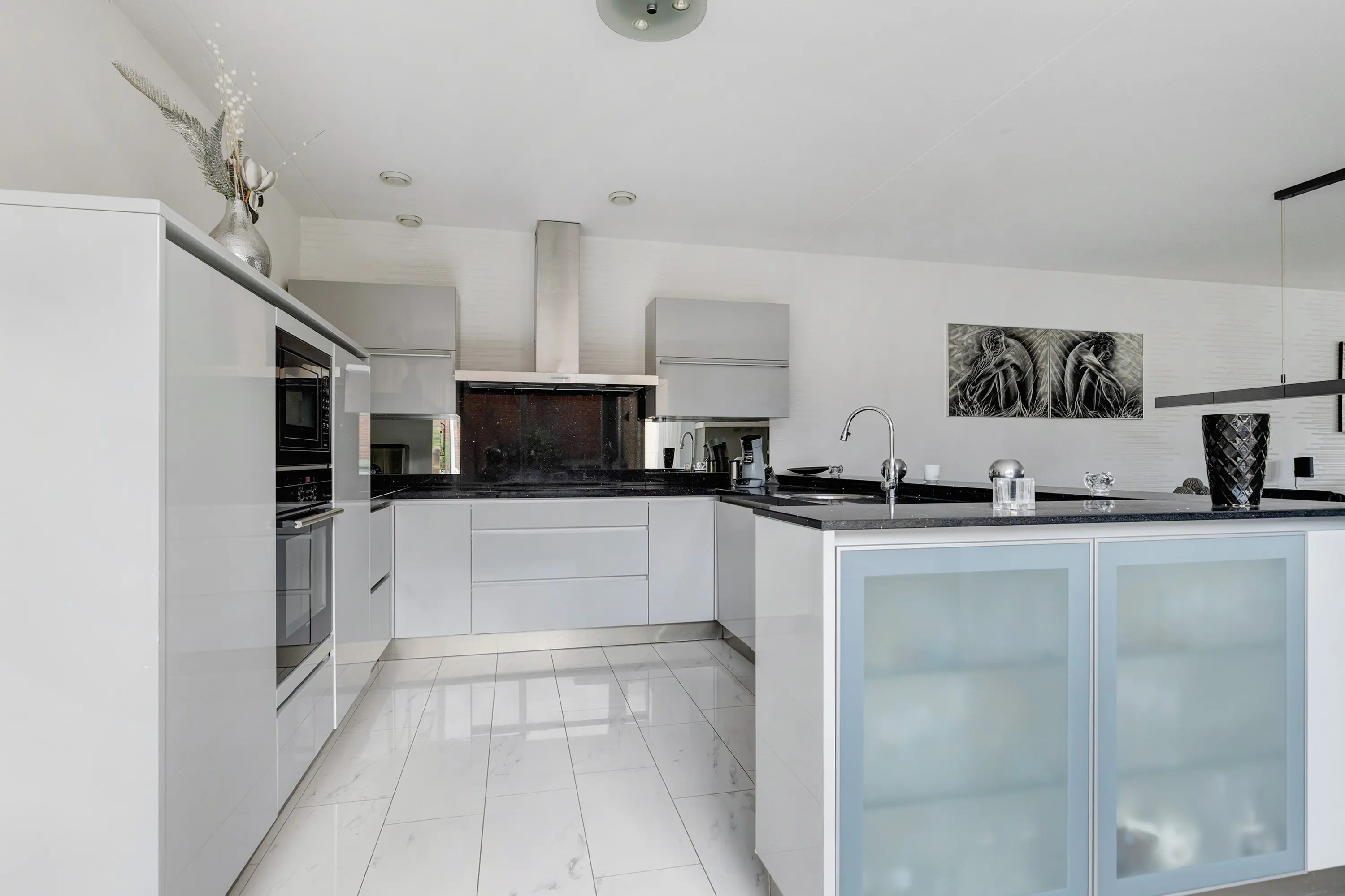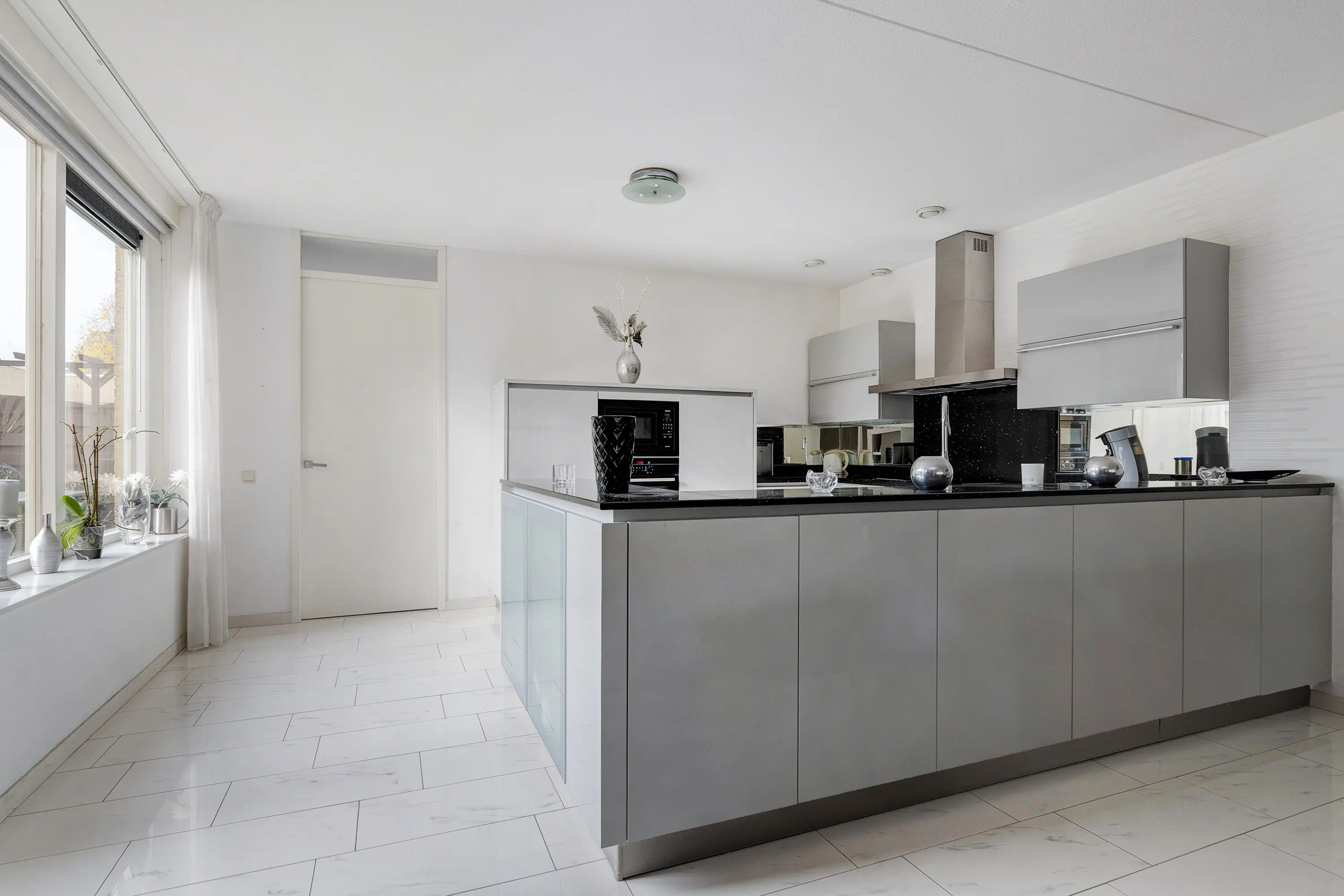 De open keuken vormt het hart van het huis. Uitgevoerd in hoogglans lichtgrijs met een donker werkblad en opgesteld in een praktische U-vorm, biedt de keuken veel werk- en kastruimte. De inbouwapparatuur bestaat uit een inductiekookplaat met RVS afzuigkap, vaatwasser, koelkast, vriezer, oven en magnetron. De grote ramen geven uitzicht op de zonnige patiotuin, waardoor koken hier echt een plezier wordt.