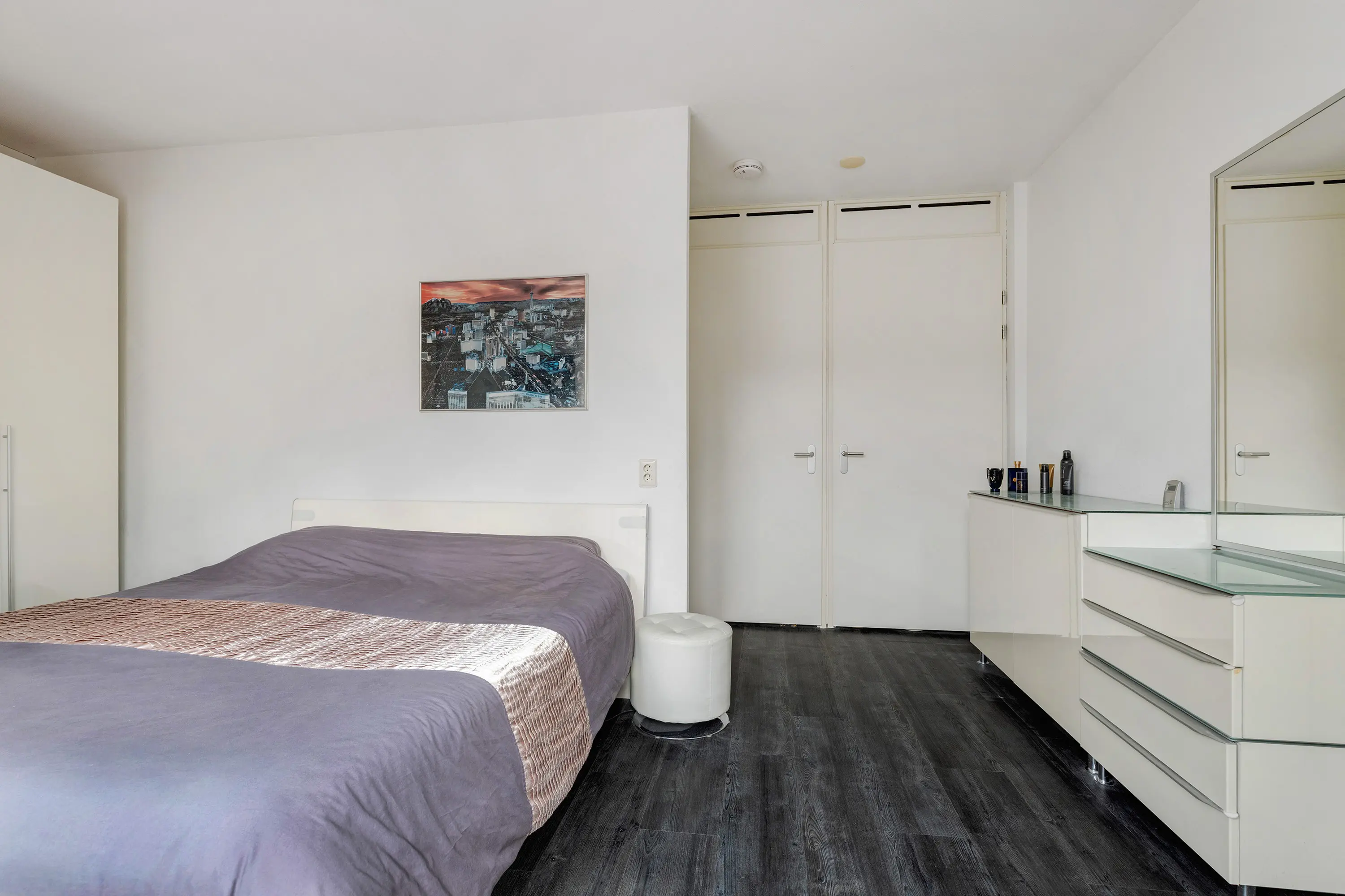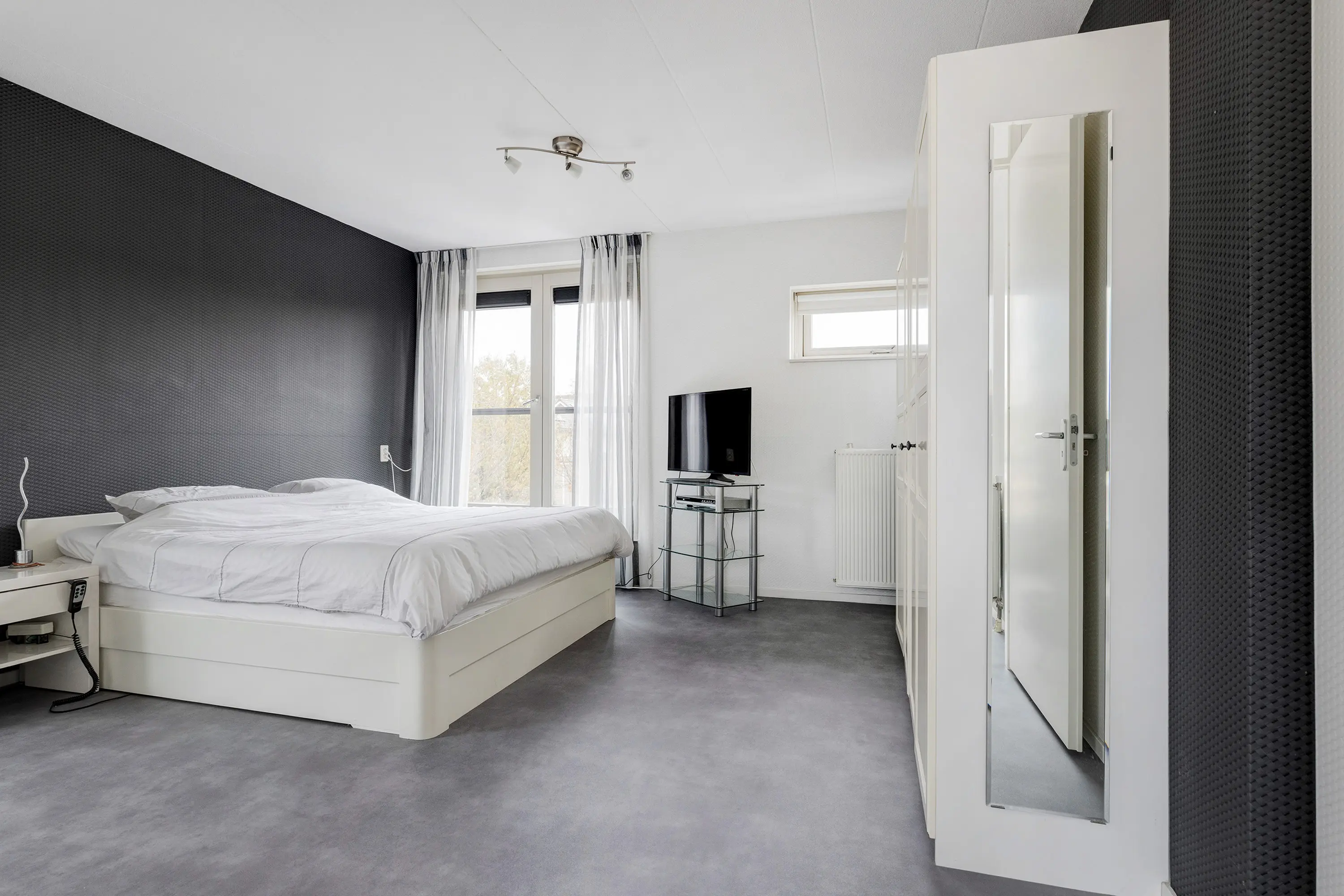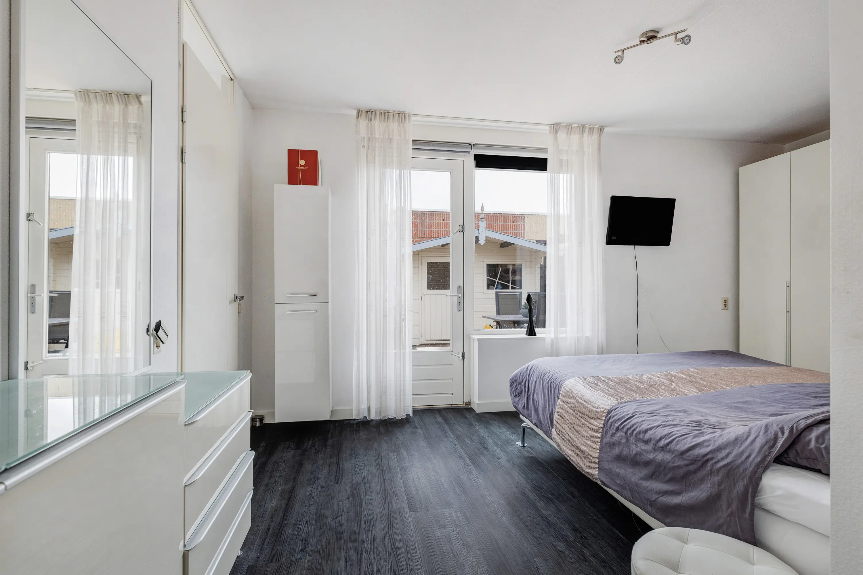 Vanuit de keuken is er toegang tot de master bedroom met vaste kastenwand met de opstelplaats voor CV-ketel en zonneboiler en directe toegang tot de luxe badkamer. Deze is voorzien van een ligbad, douchecabine met jetstreams, hangend toilet en een modern wastafelmeubel.