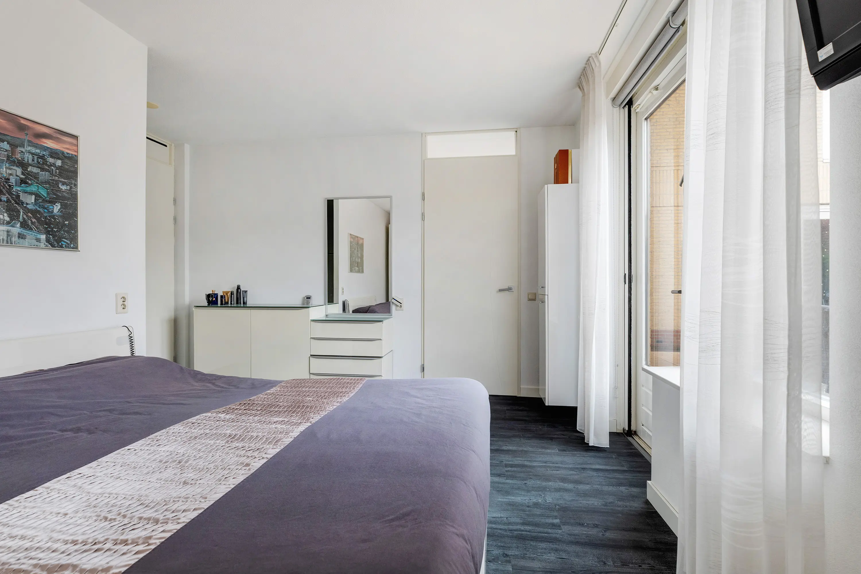 Via de hal bereikt u de trap naar de eerste verdieping. Hier bevindt zich een royale tweede slaapkamer (voorheen 2 slaapkamers), voorzien van twee openslaande deuren – één naar het dak en één naar het charmante Franse balkon.