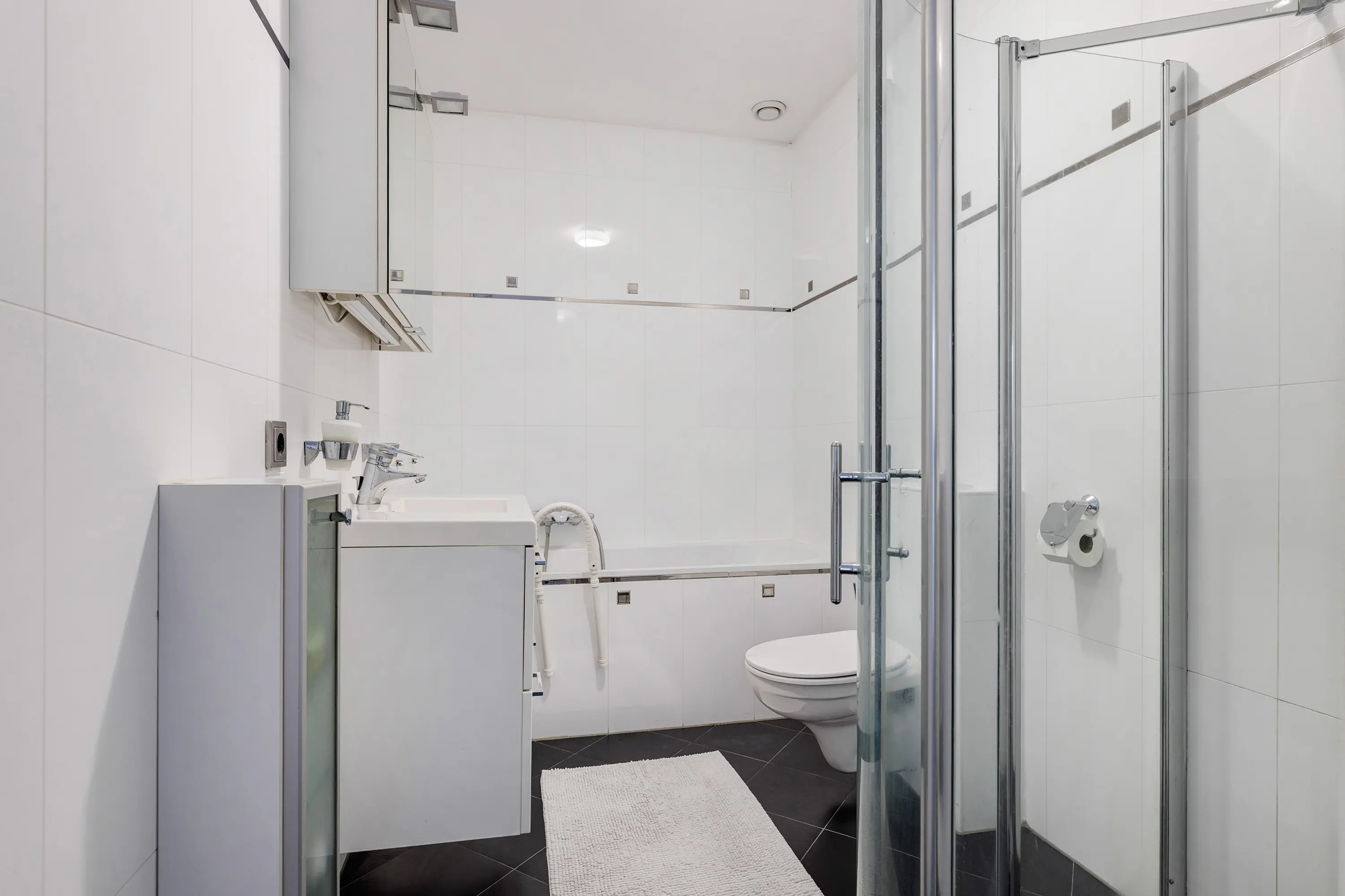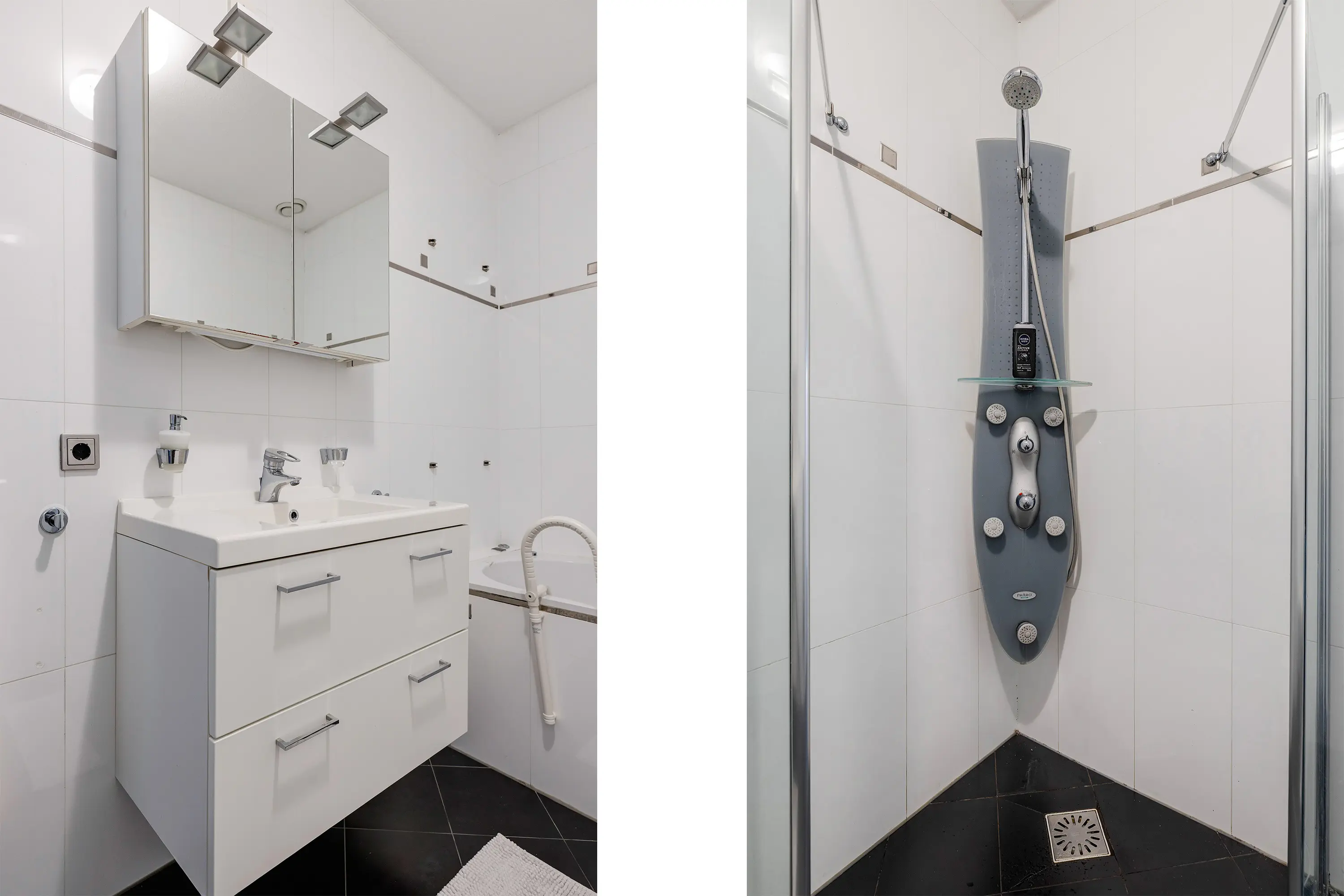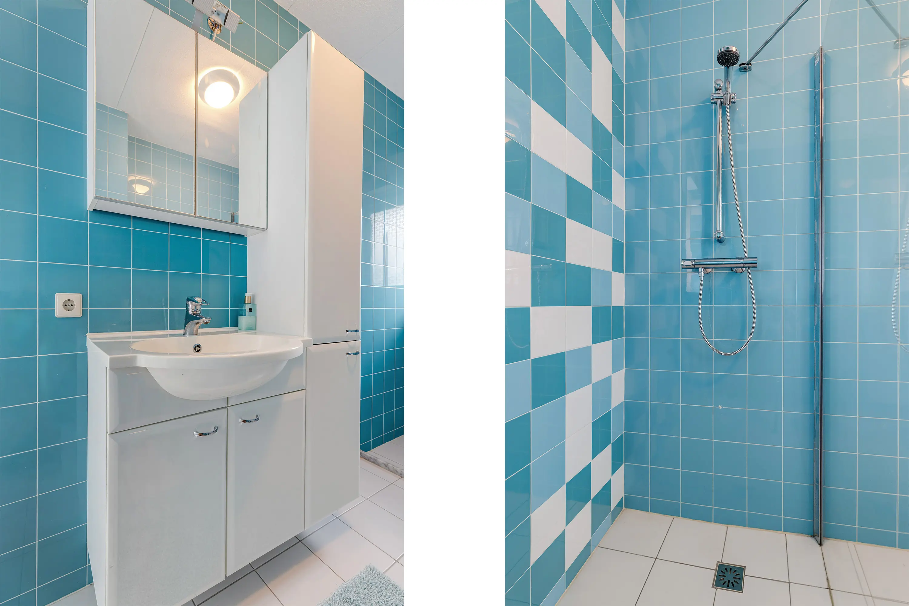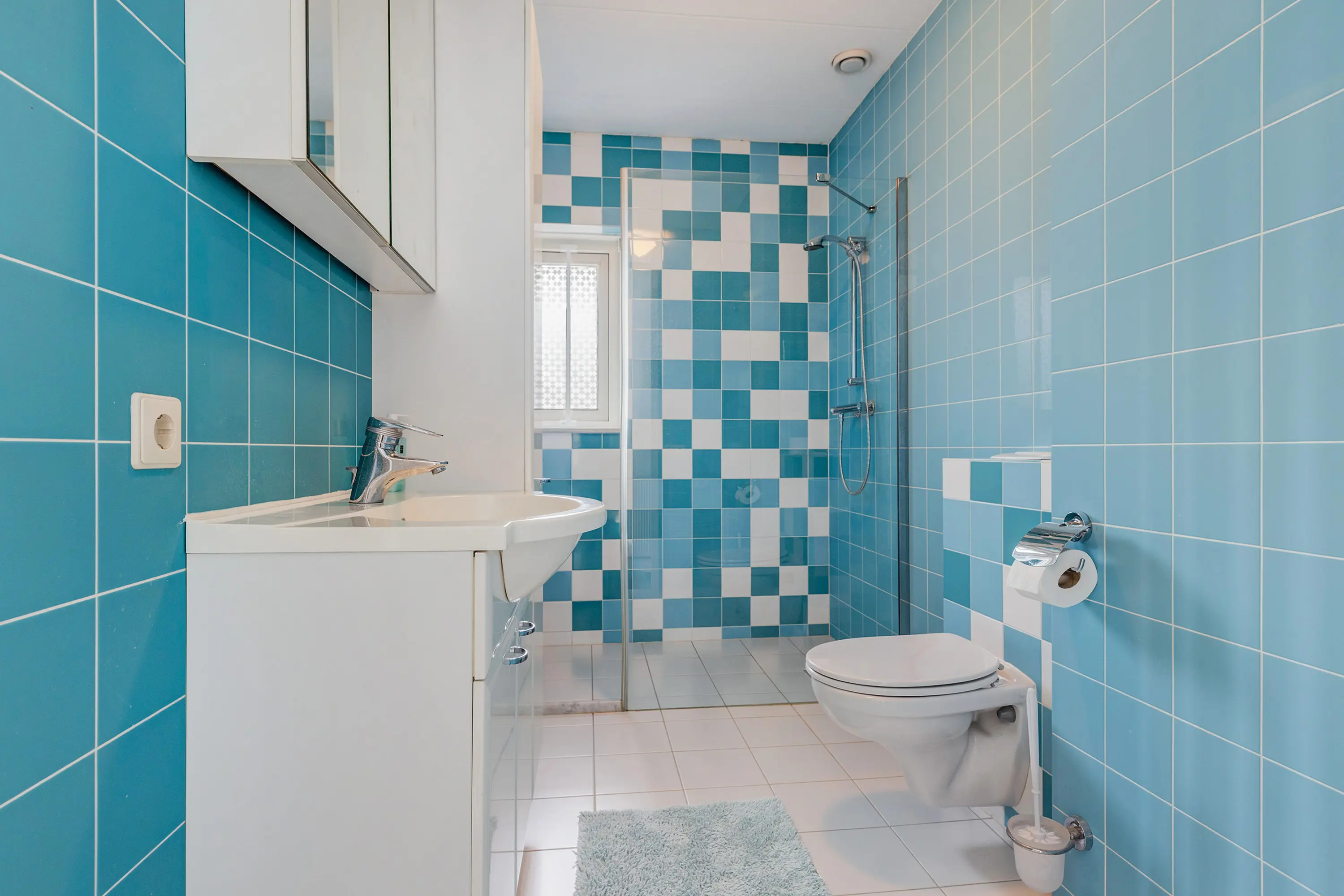 Daarnaast is er een tweede badkamer, compleet uitgerust met inloopdouche met glazen douchewand, een derde hangend toilet en een modern wastafelmeubel met spiegelkast. De ruimte is volledig betegeld in een blauwe kleurstelling.