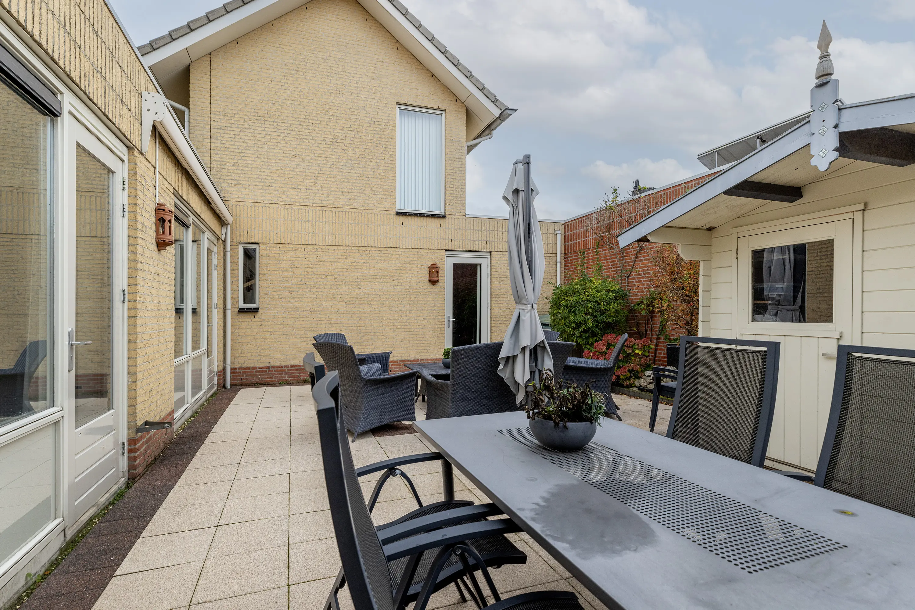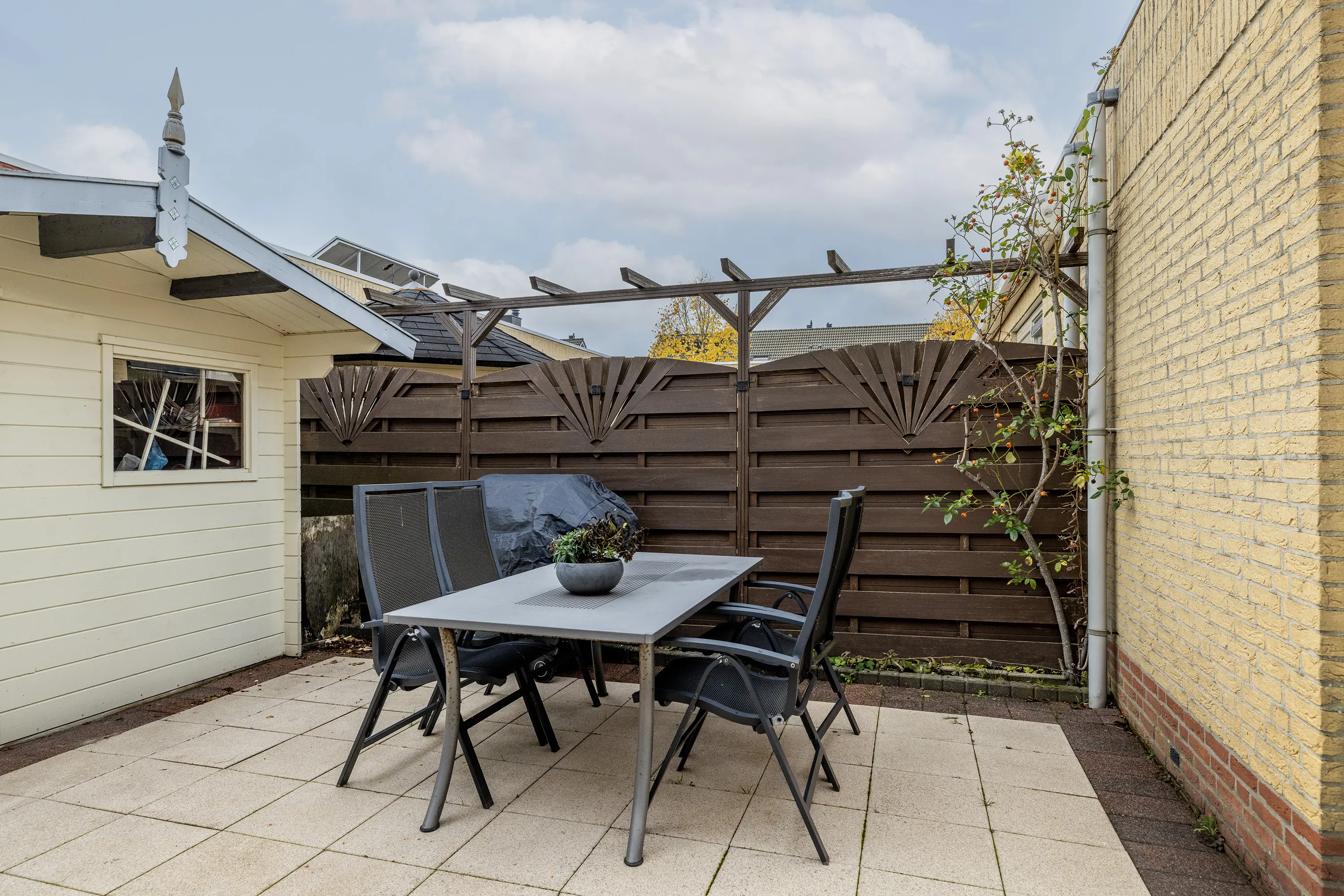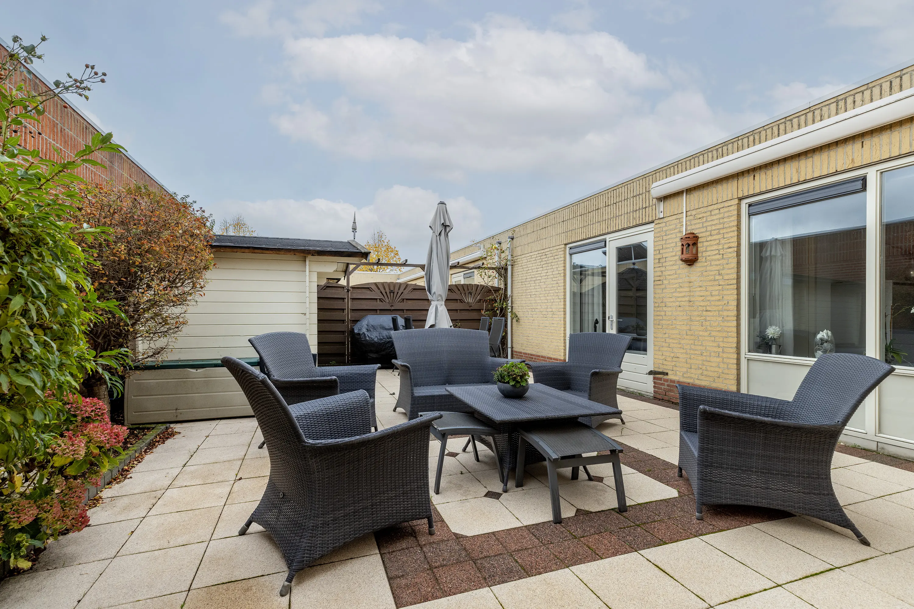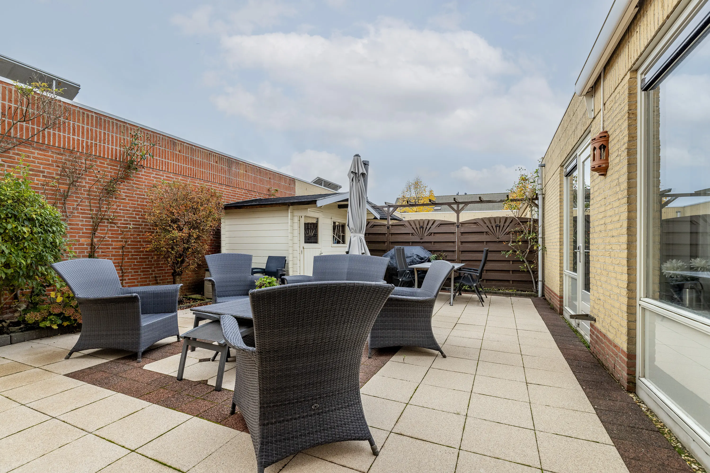De patiotuin is een waar verlengstuk van de woonkamer – ruim, zonnig en gelegen op het westen. Hier geniet u in alle privacy van de middag- en avondzon. De tuin is onderhoudsvriendelijk ingericht met sierbestrating, vaste plantenborders, een houten berging en een elektrisch zonnescherm.