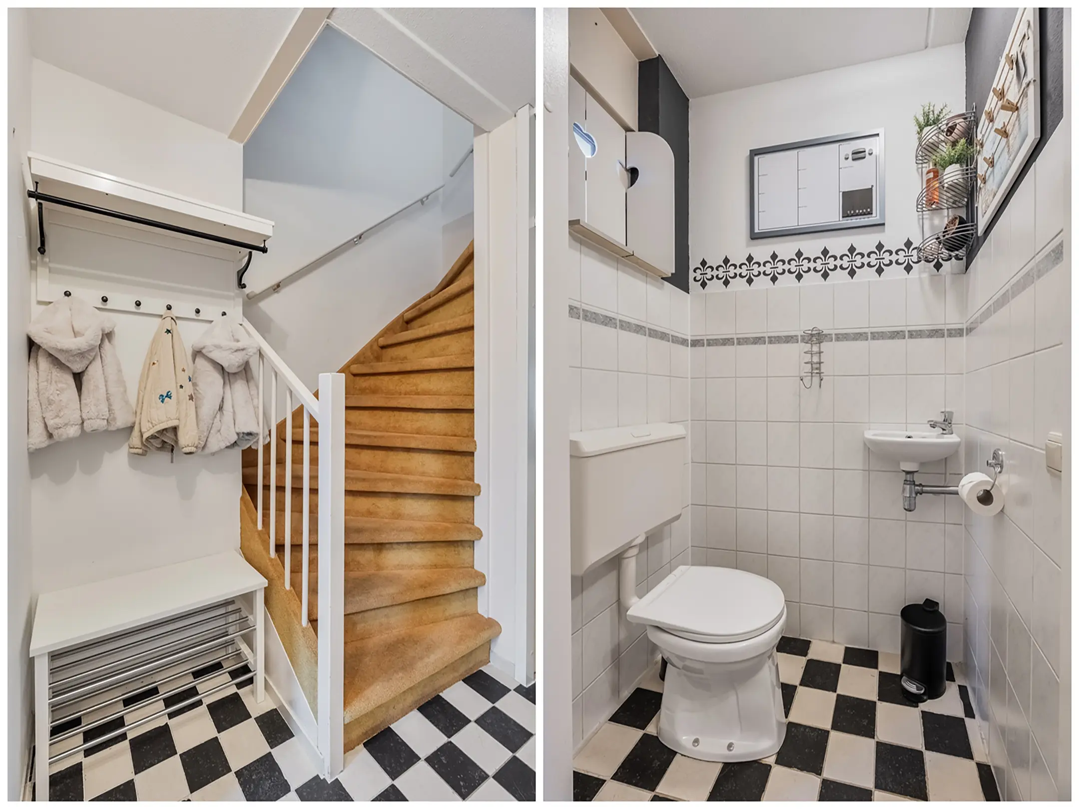 Entree, ruime hal met meterkast en trap naar de 1e verdieping, toiletruimte voorzien van een duoblok toilet en fonteintje. De toiletruimte is gedeeltelijk betegeld.
