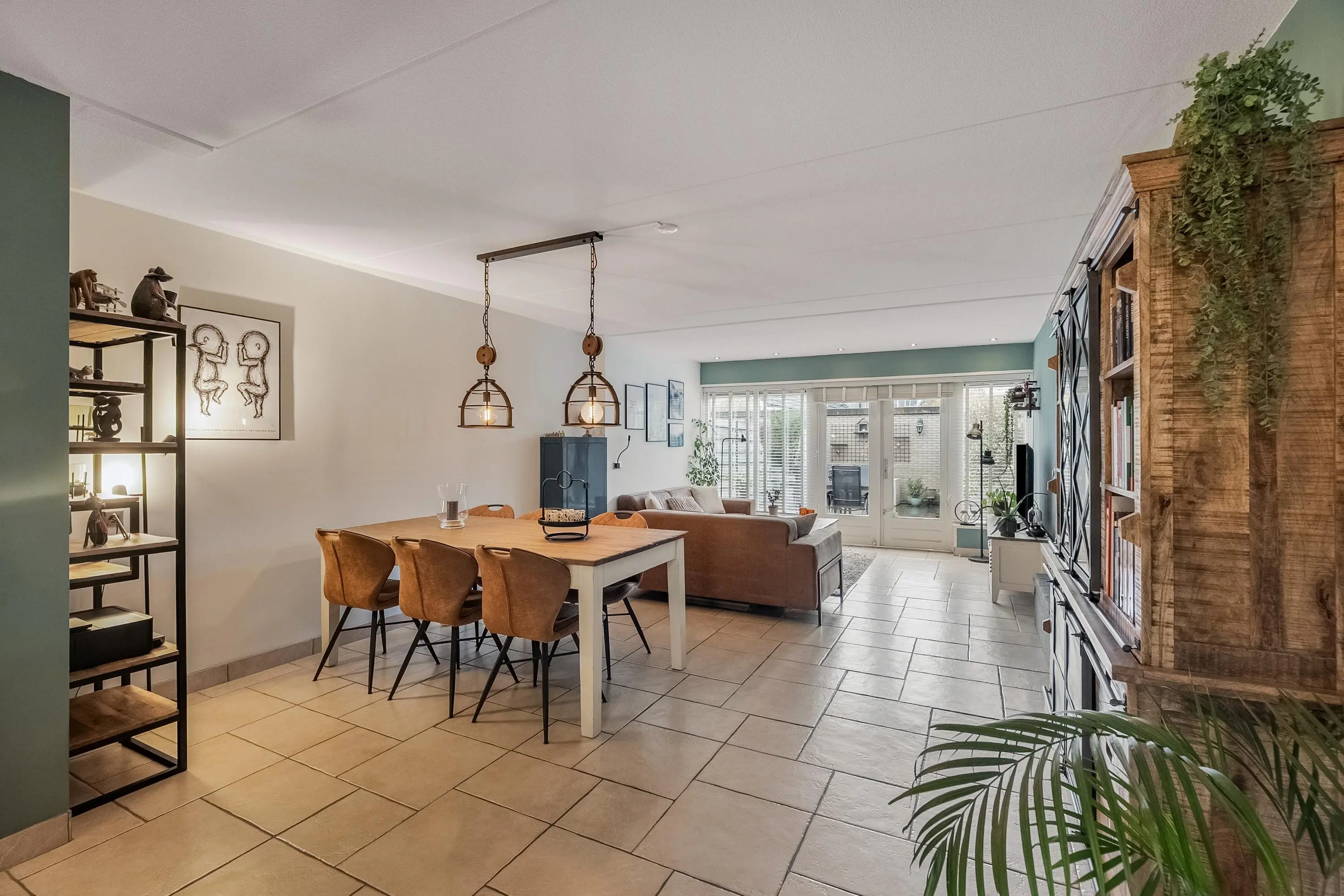 Uitgebouwde tuingerichte woonkamer (ca. 36 m2) voorzien van een lichte tegelvloer met vloerverwarming en grote raampartijen die zorgen voor een aangename, lichte leefruimte. De vloerverwarming op de begane grond zorgt bovendien voor een aangenaam binnenklimaat, het hele jaar door. De woonkamer is verder voorzien van een trap-/voorraadkast. Middels openslaande deuren heeft u toegang tot de achtertuin. Met de openslaande deuren open vloeien binnen en buiten letterlijk in elkaar over.