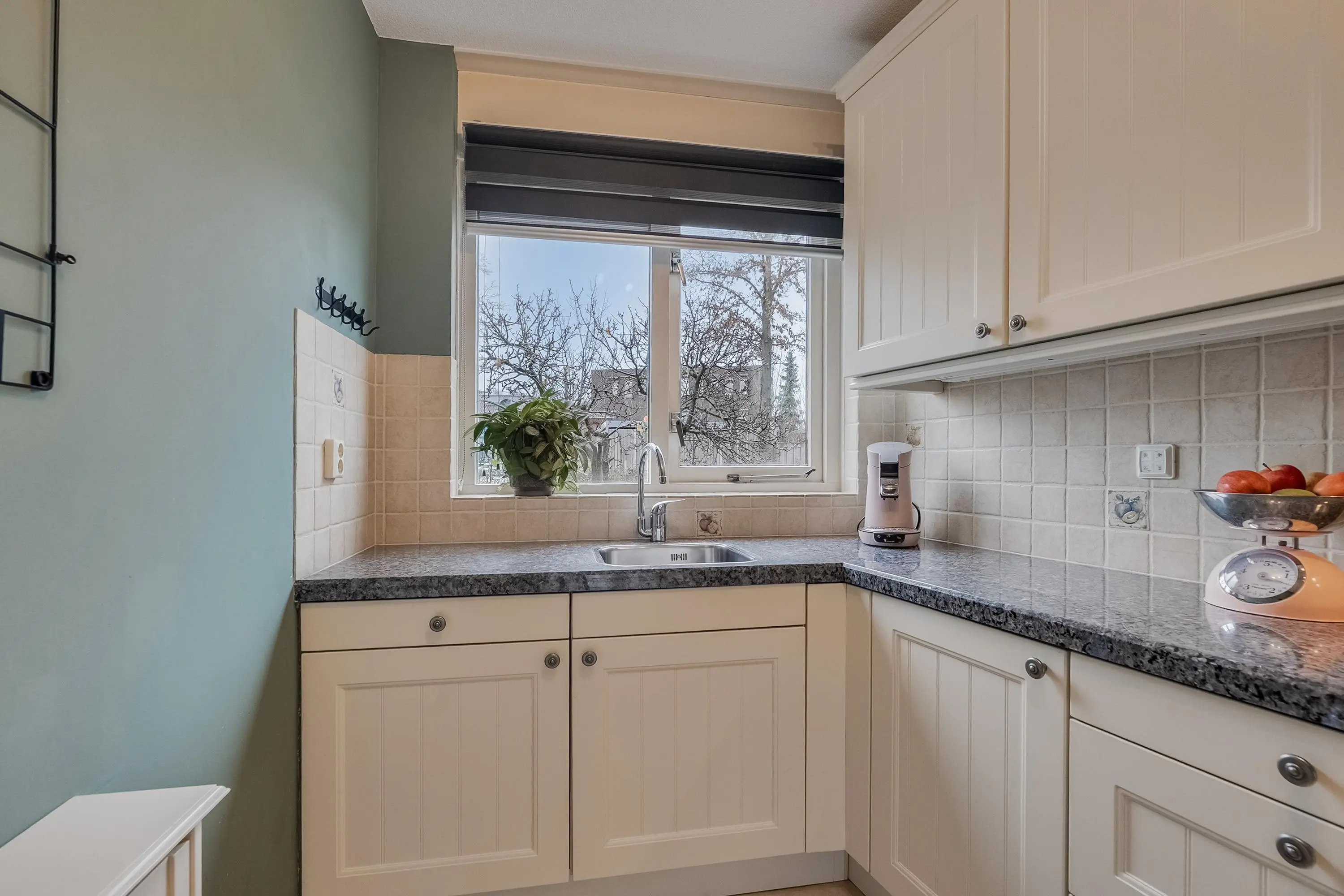 De woning beschikt aan de voorzijde over een moderne keuken (ca. 7 m2) met inbouwapparatuur. De keuken is uitgevoerd in een L-opstelling en voorzien van een koelkast, vrieskast, 4-pits gaskookplaat, afzuigkap, oven en een vaatwasser. Tevens is de keuken voorzien van een enkele spoelbak en voldoende kastruimte. Het geheel is uitgevoerd in lichte kleuren en afgewerkt met een natuursteen aanrechtblad en tegelvloer met vloerverwarming.