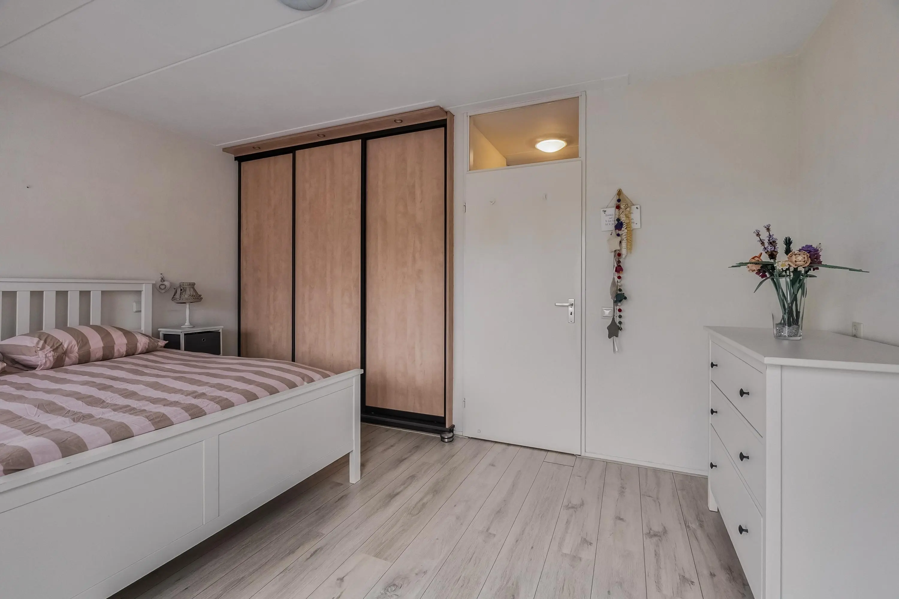 Slaapkamer 1 (ca. 18 m2) is gelegen aan de achterzijde van de woning en beschikt over een 3-deuren schuifkastenwand met verlichting, een elektrisch bedienbaar rolluik met afstandsbediening, een dakkapel met hor en een dakraam.