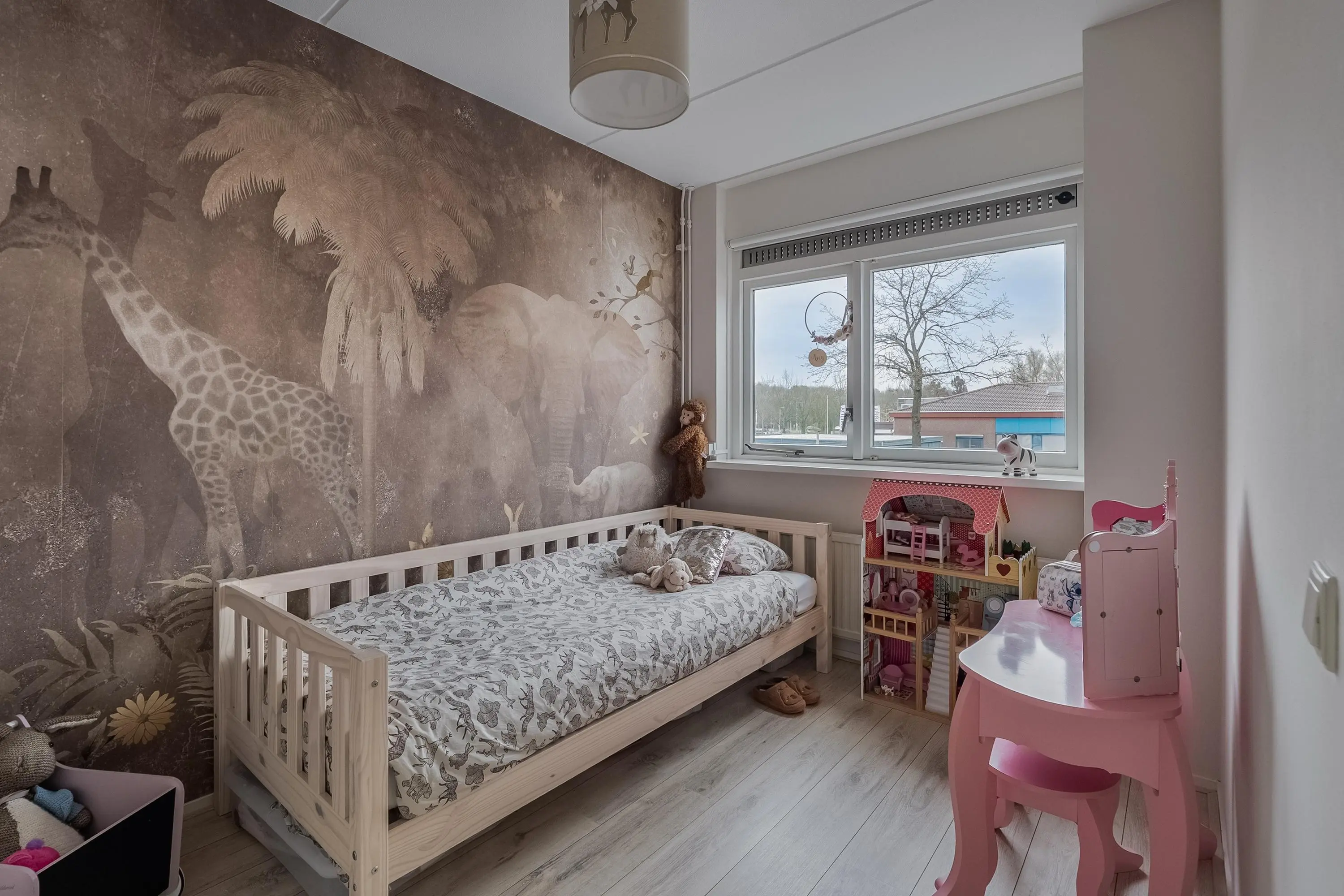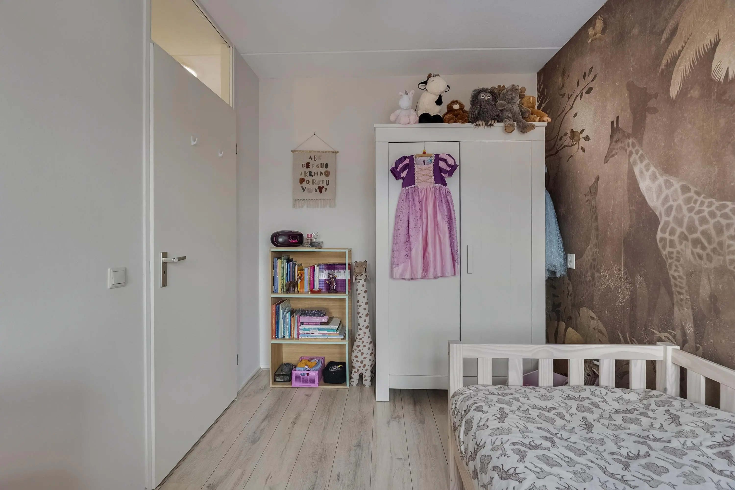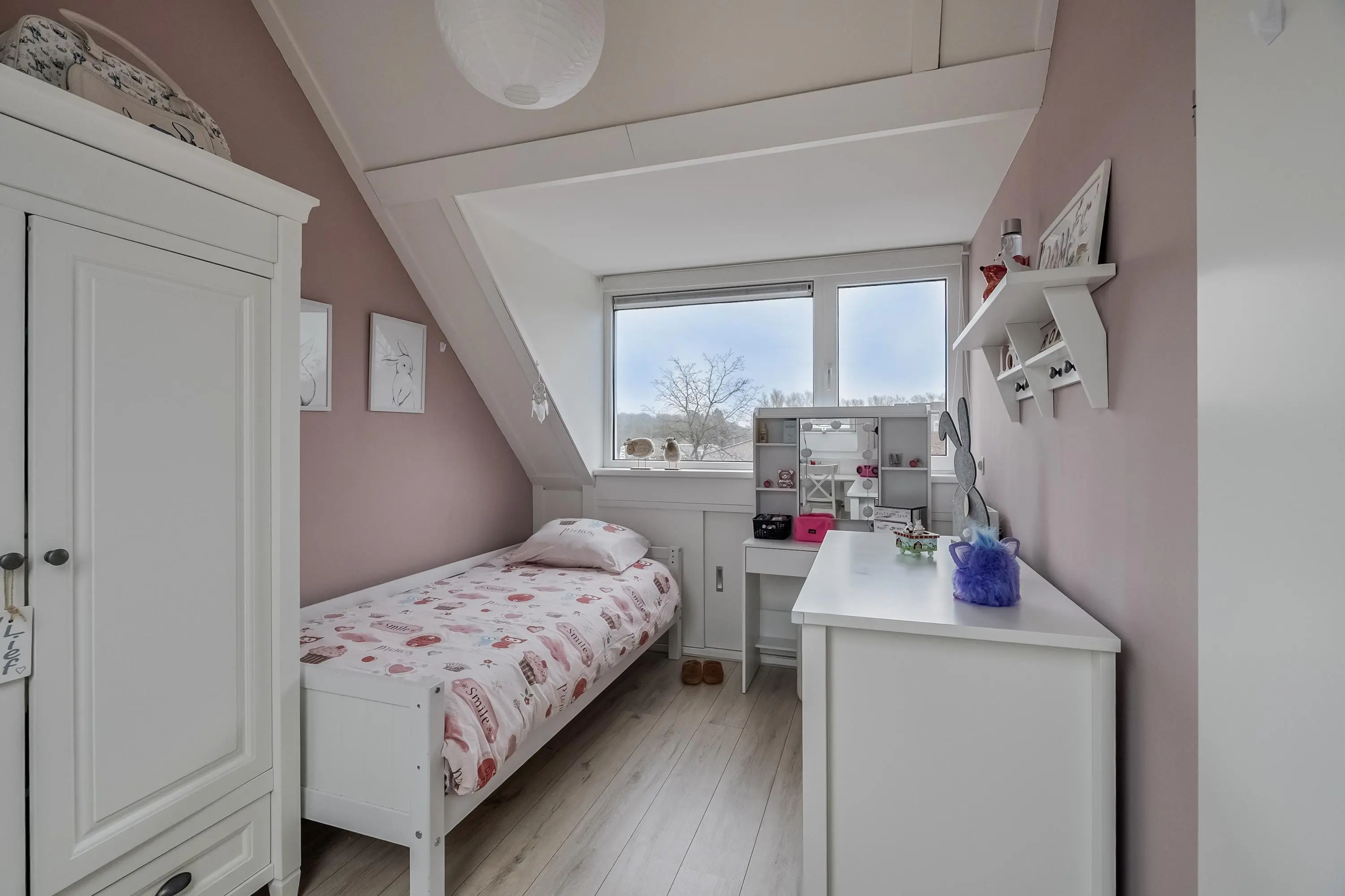 Slaapkamer 3 (ca. 11 m2) beschikt over een kunststof dakkapel met elektrisch bedienbaar rolluik en hor, een Velux dakraam met verduisterend gordijn, een lichte laminaatvloer en bergruimte achter het knieschot aan beide kanten. Deze slaapkamer is verrassend ruimtelijk dankzij de dakkapel en het dakraam, waardoor er natuurlijke lichtinval is en de ruimte optimaal wordt benut.