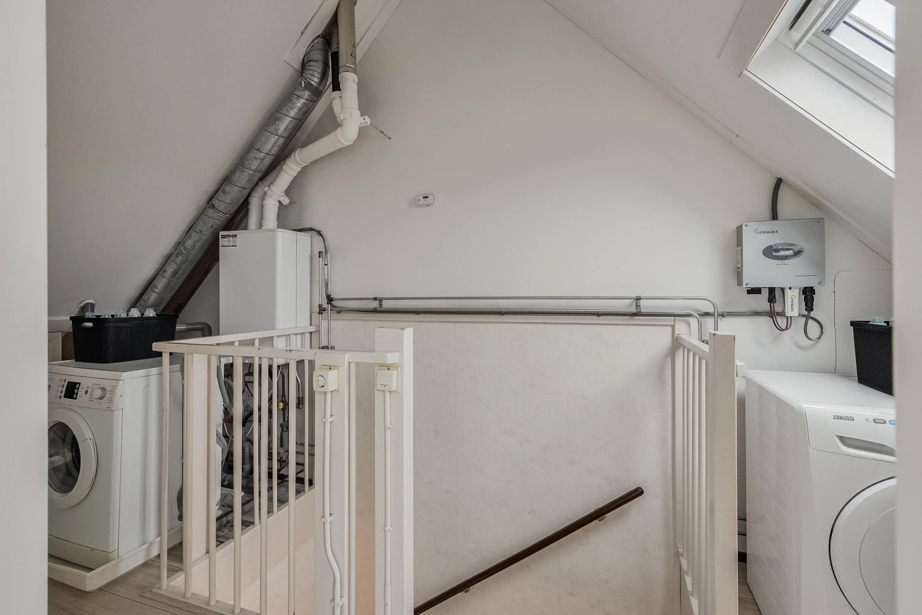 Voorzolder met de omvormer voor de 6 zonnepanelen, stelplaats voor de HR C.V. combiketel (intergas 2022), mechanische ventilatie, wasmachine- en drogeraansluiting en aan beide kanten bergruimte achter het knieschot. Het Velux dakraam zorgt voor voldoende natuurlijke lichtinval.