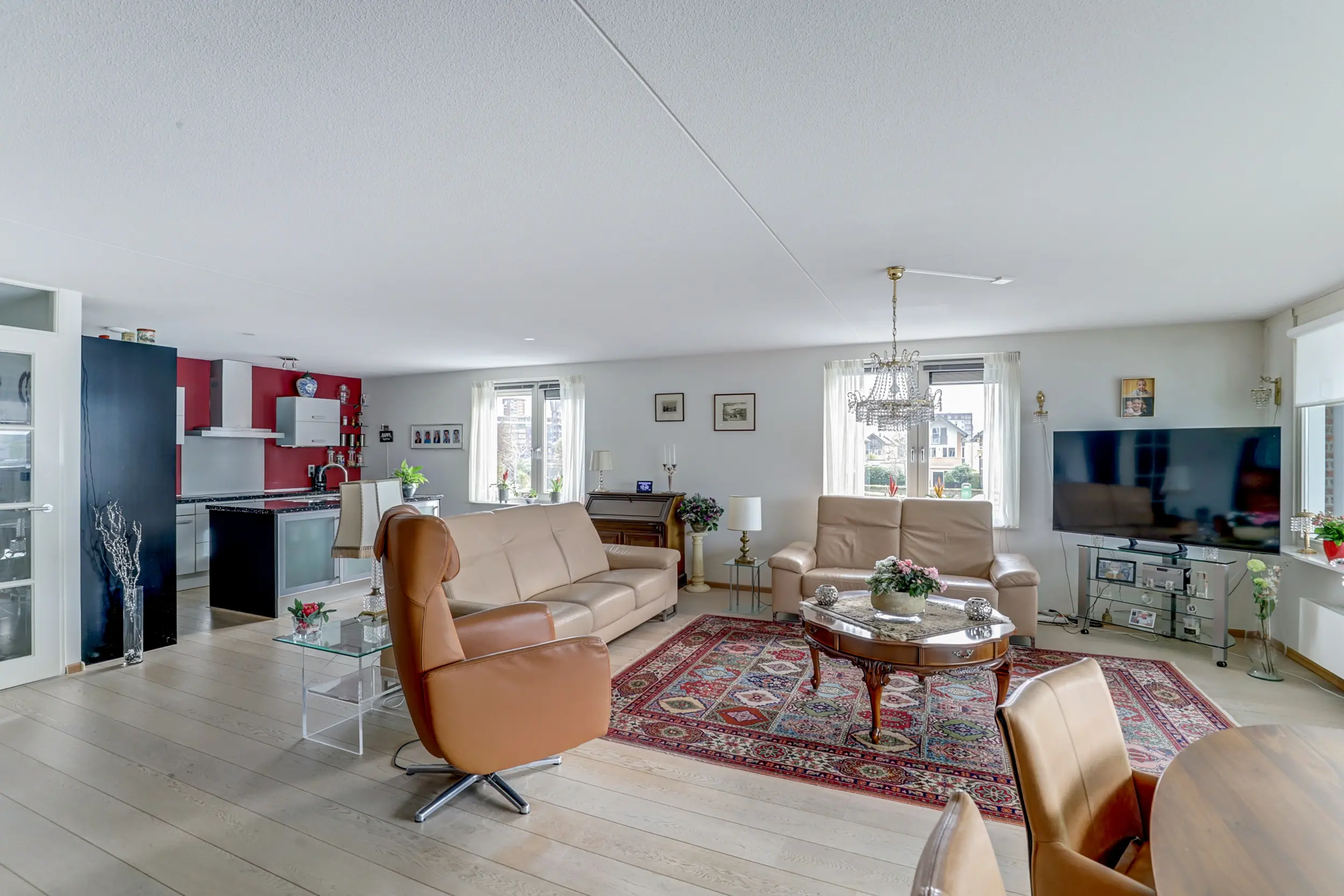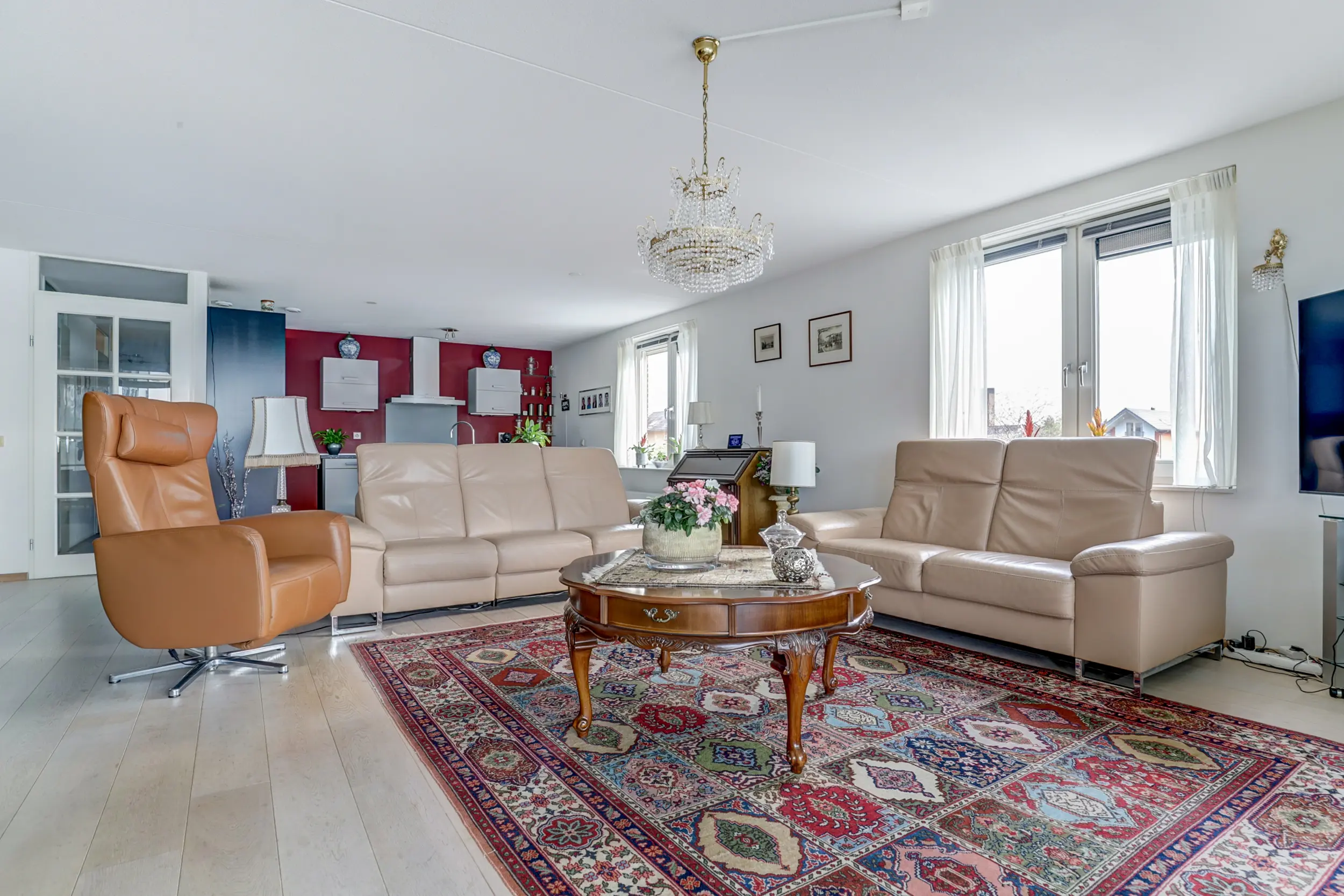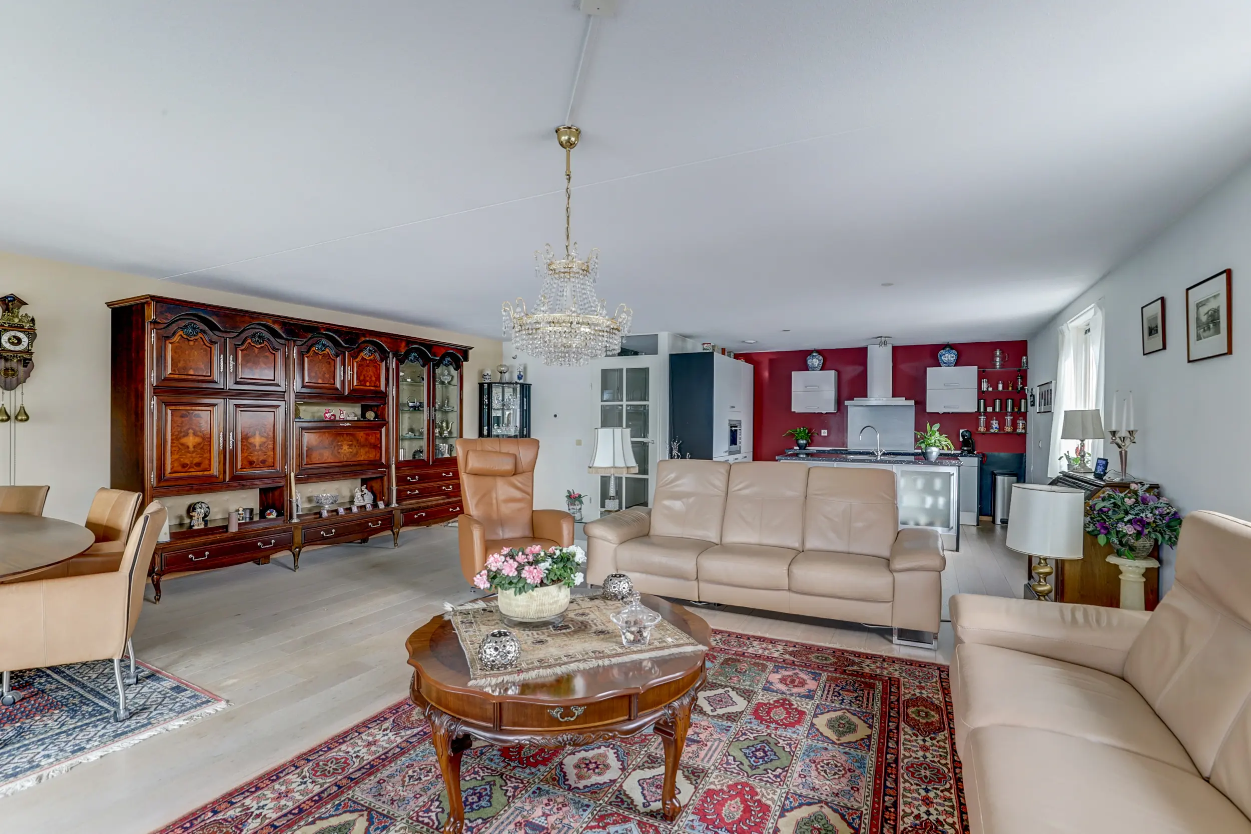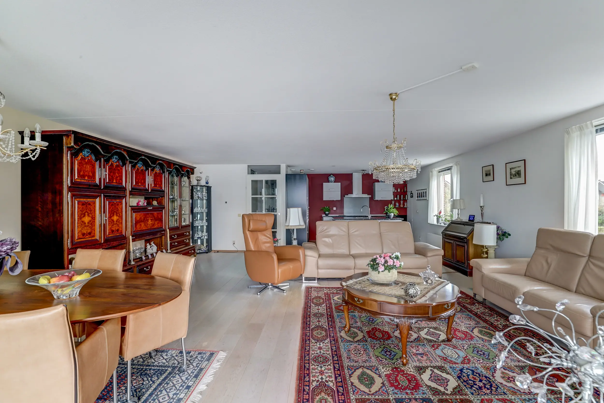 Terug in de woonkamer valt op hoe groot de ruimte is. Deze is op meerdere manieren in te delen: er is voldoende plek voor een grote eethoek en een gezellige zithoek om te lezen, tv te kijken of met vrienden een gezellige avond te beleven.