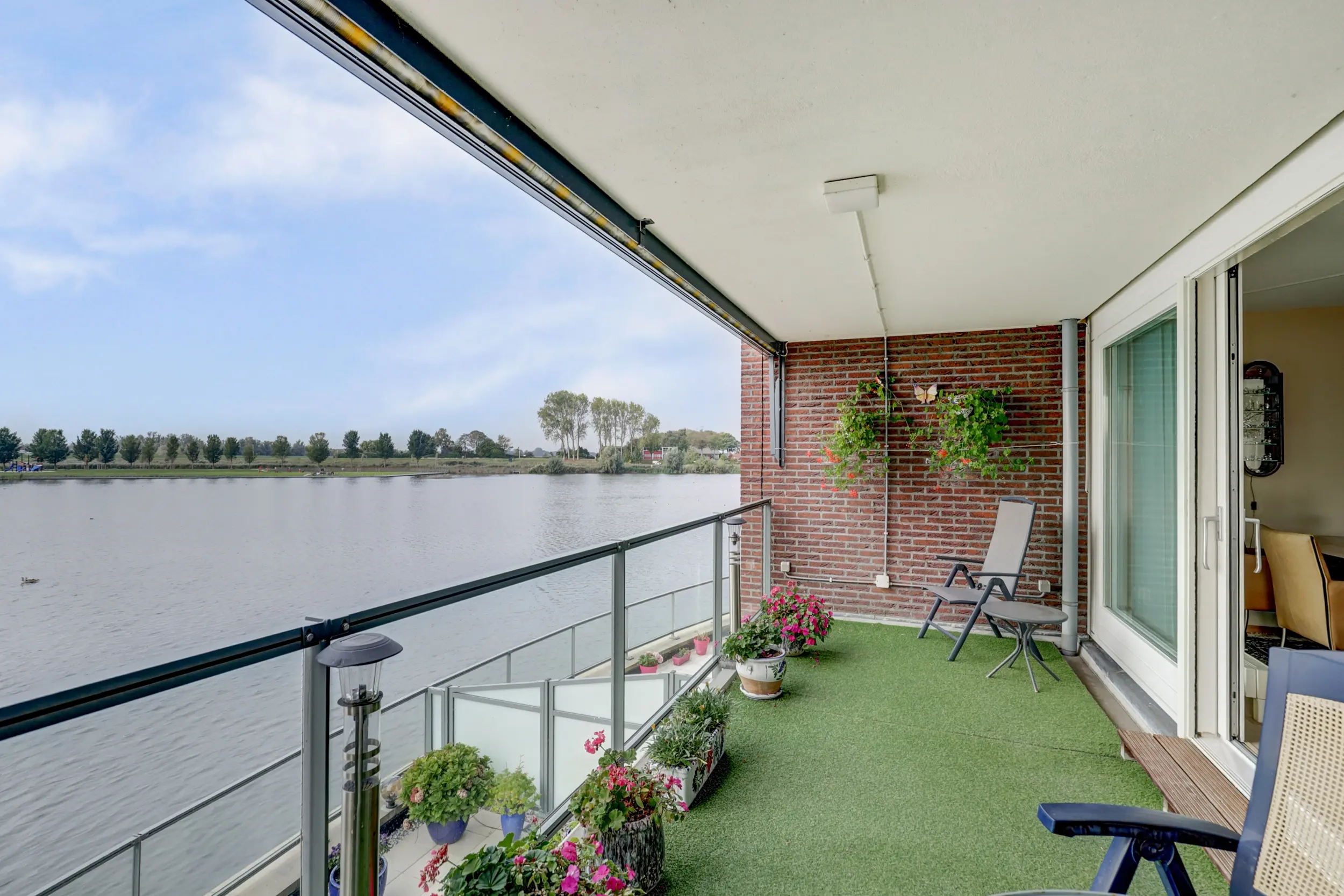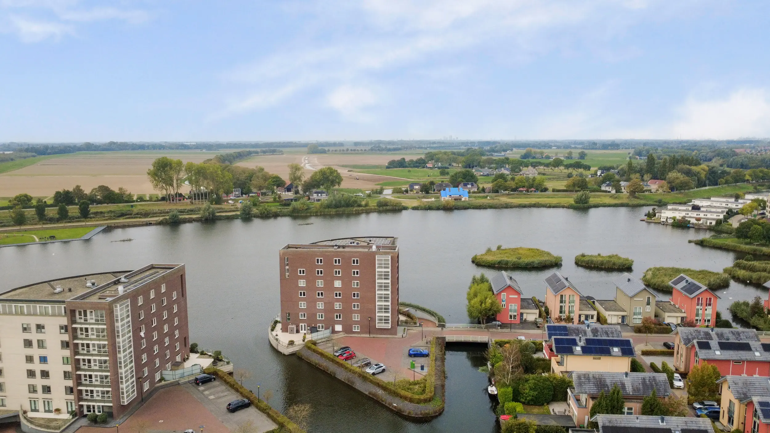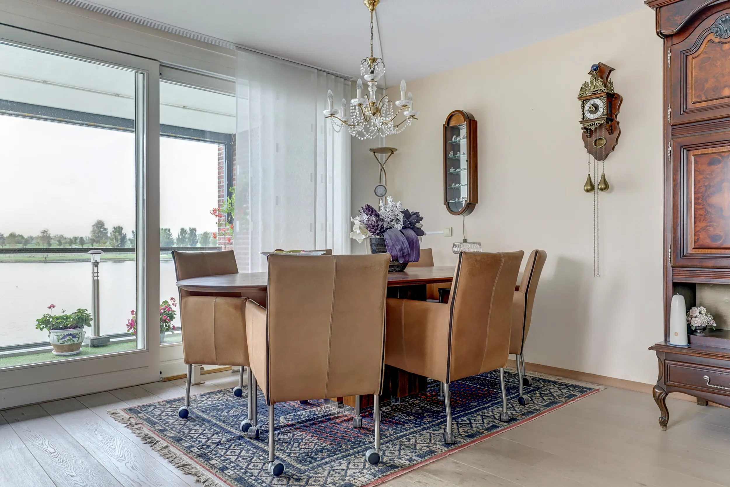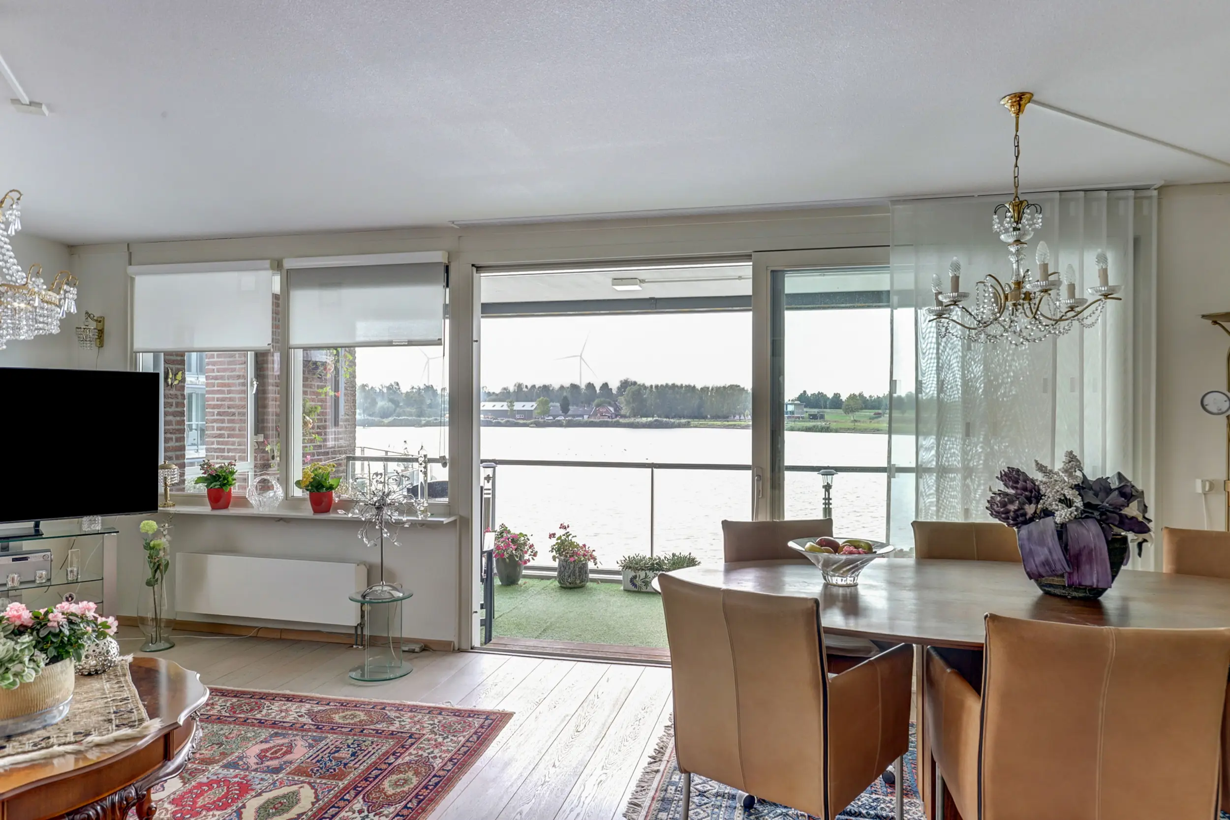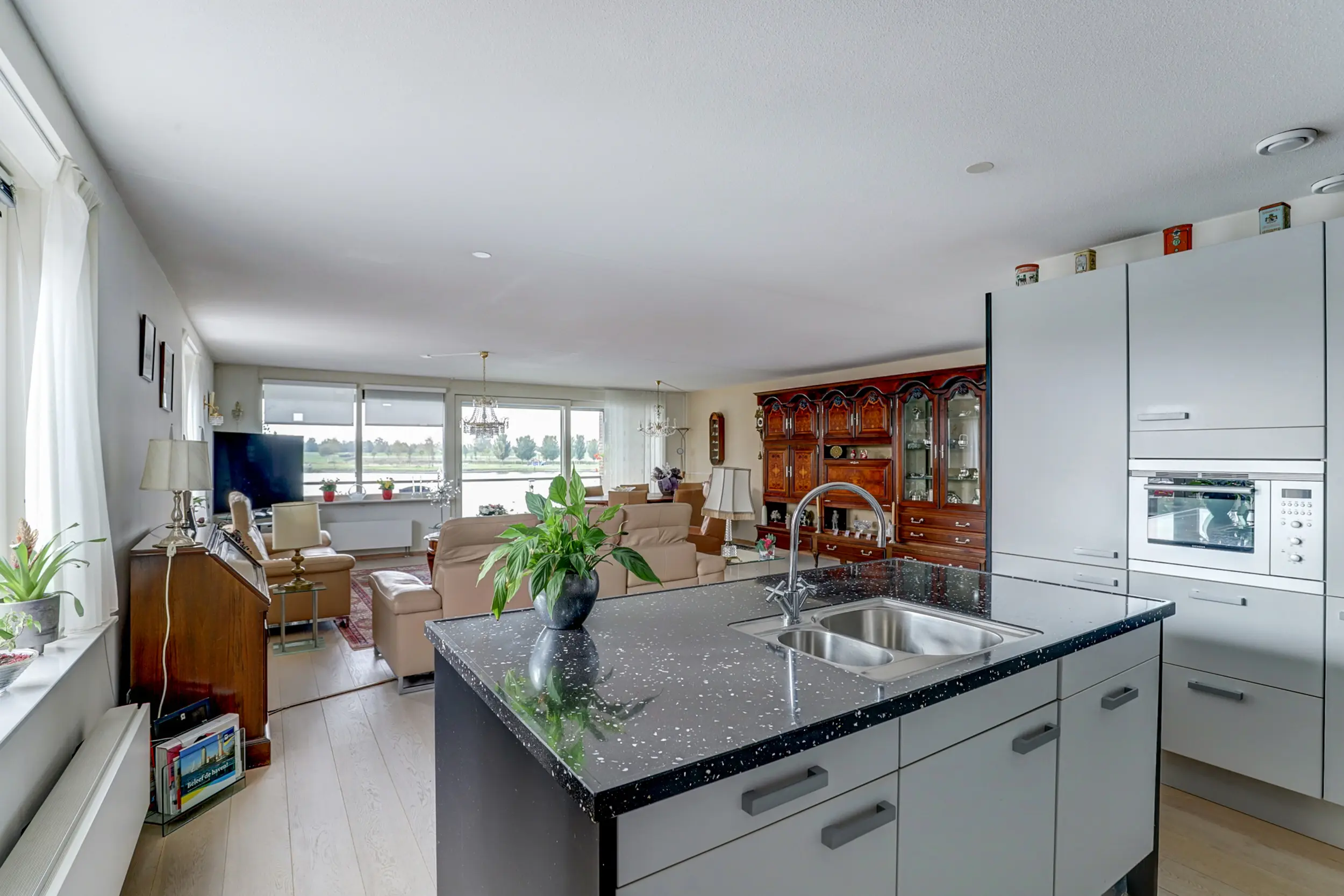 Zodra je de woonkamer binnenkomt, word je direct getrakteerd op een schitterend uitzicht over het water. Dankzij de riante achterpui én de grote zijramen is de living heerlijk licht en ruim. Via de schuifpui stap je zo het riante balkon van ruim 15 m² op – een perfecte plek om vrijwel de hele dag van de zon te genieten. Het balkon is zo groot dat je er eenvoudig een eettafel en een paar fijne stoelen kwijt kunt om te relaxen. Het uitzicht is prachtig en verveelt geen dag. Je kijkt uit over het water richting de Koedood en de polder – een perfecte combinatie tussen rust en een vleugje levendigheid van fietsers, wandelaars en enkele voorbijrijdende auto’s, ver genoeg weg om ze niet te horen.