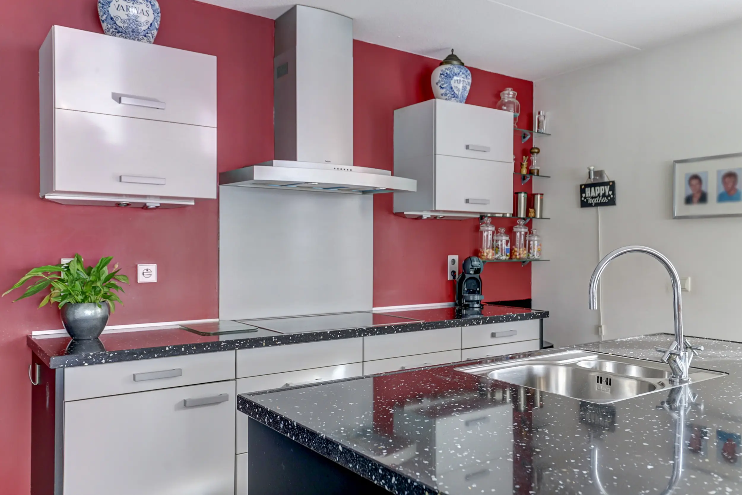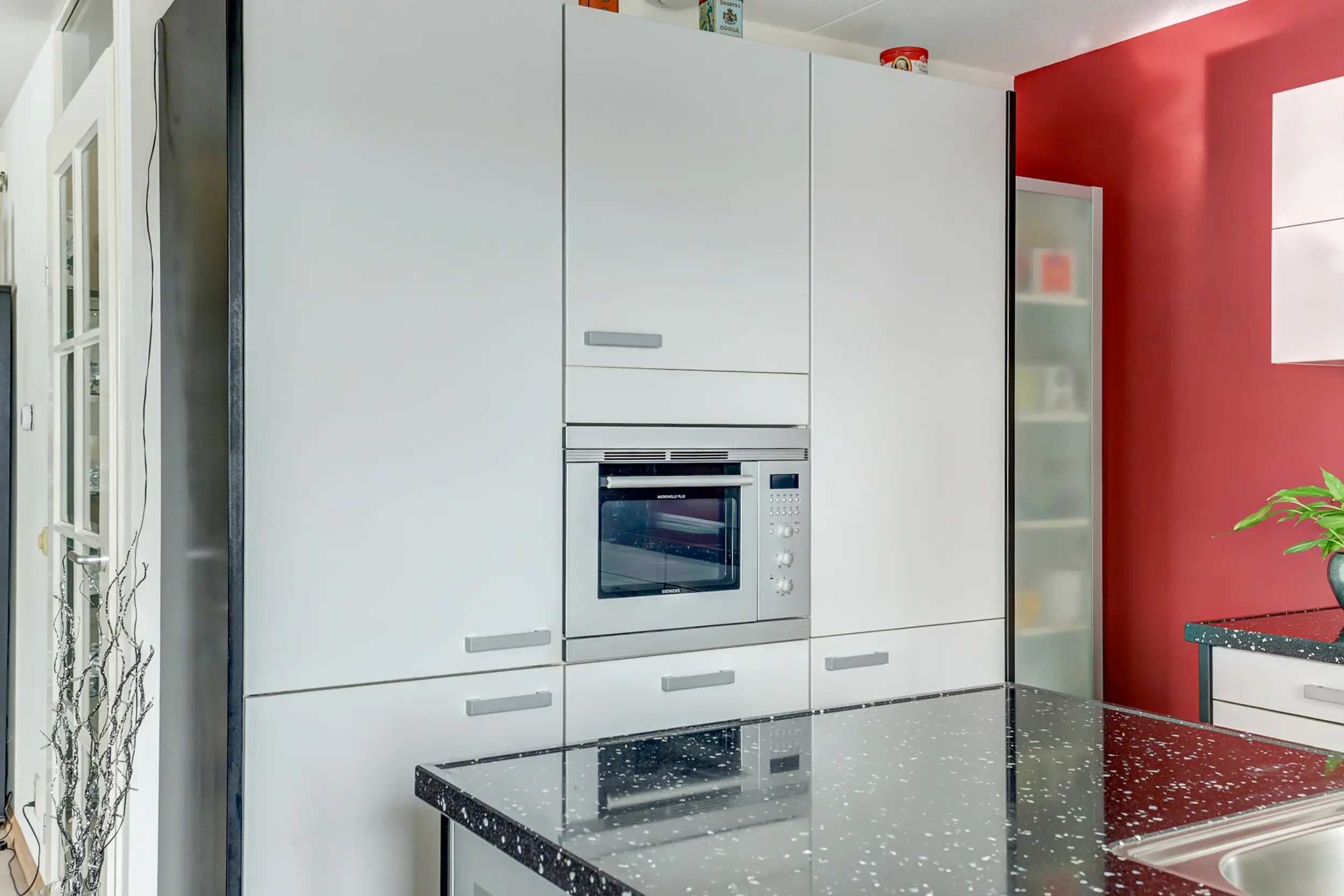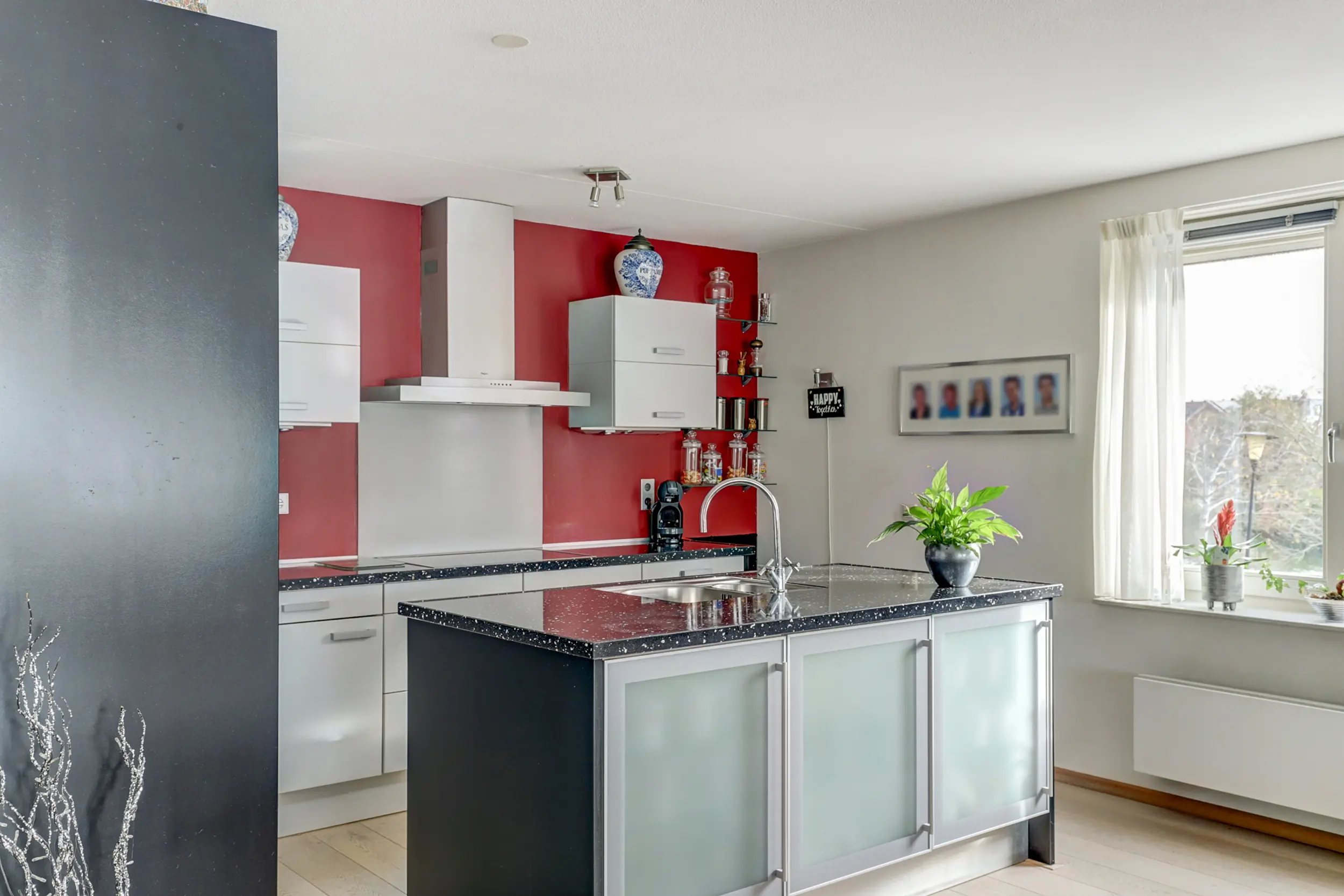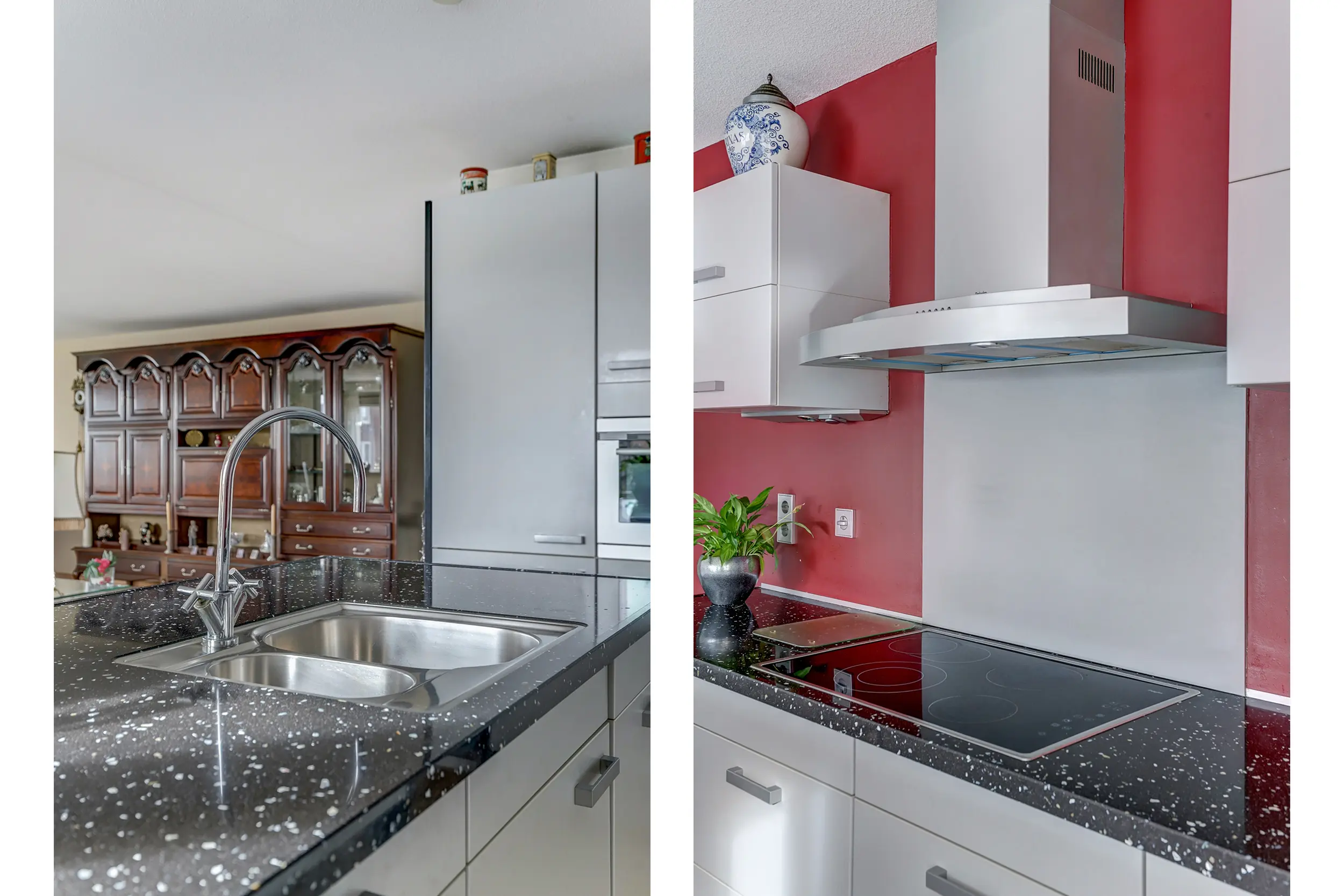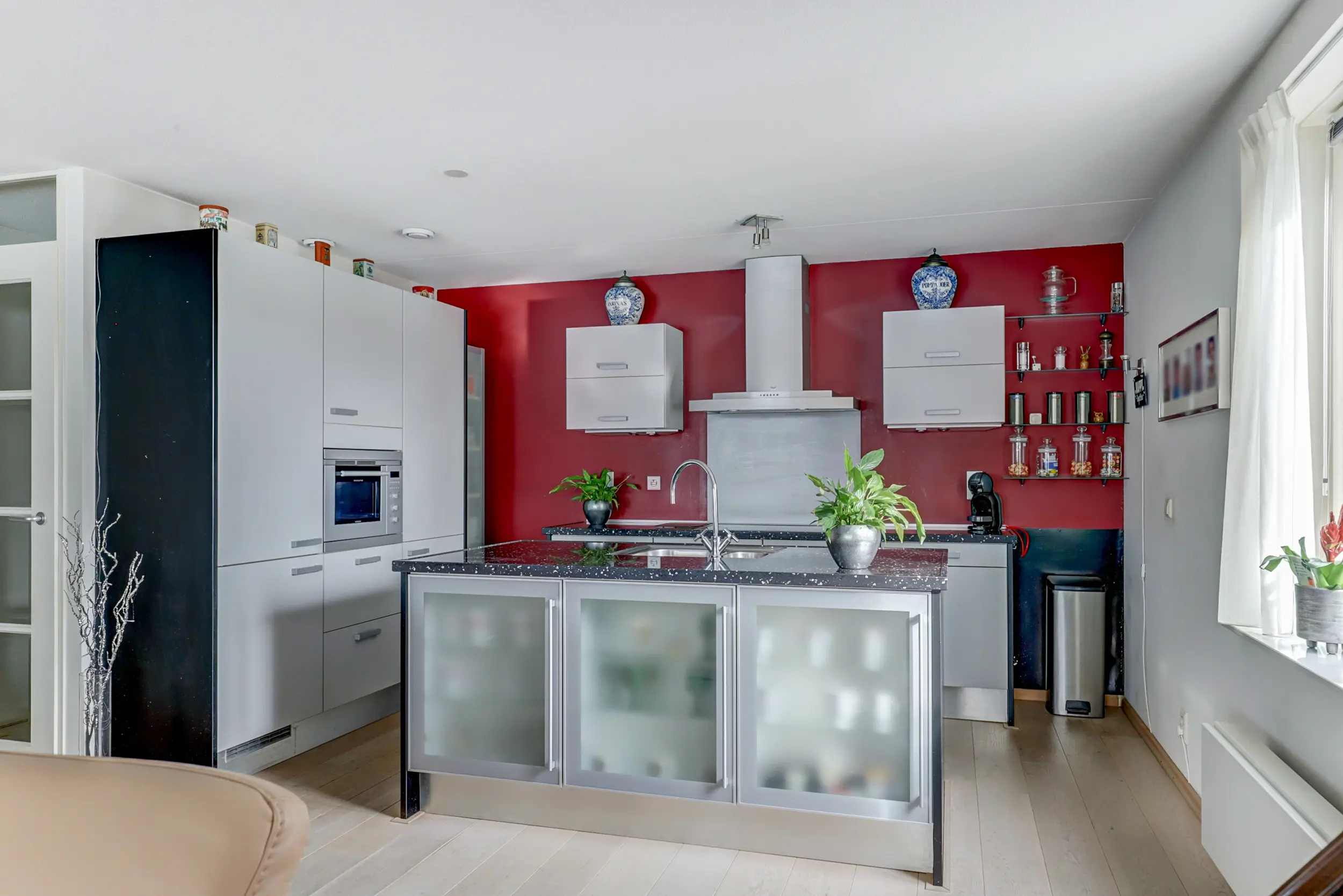 Aan de achterzijde loopt de woonkamer naadloos over in de moderne open keuken, uitgevoerd in hoekopstelling en voorzien van een groot eiland. De keuken is voorzien van diverse inbouwapparatuur, zoals een koelkast, vriezer, vaatwasser, combi-oven en een grote inductiekookplaat met afzuigkap. Er is veel bergruimte in de kastenwand, onderkasten en bovenkastjes, en extra opbergruimte in het eiland, waar zich ook de anderhalve spoelbak bevindt. Een heerlijke, lichte keuken om uitgebreid te koken!