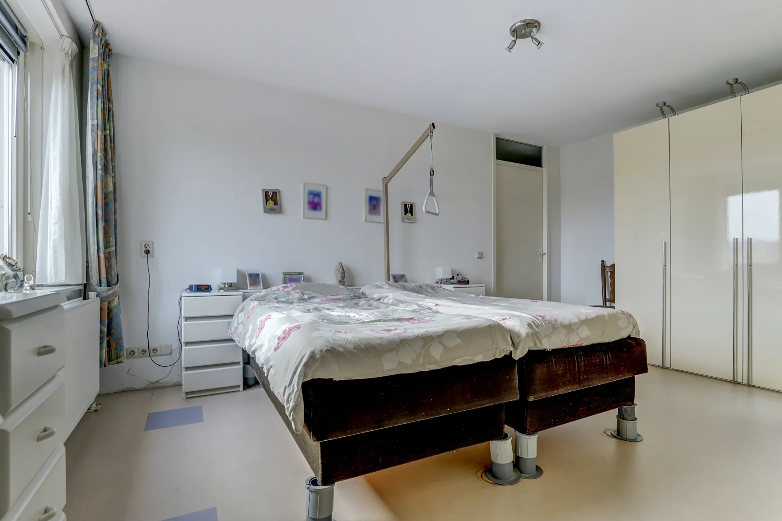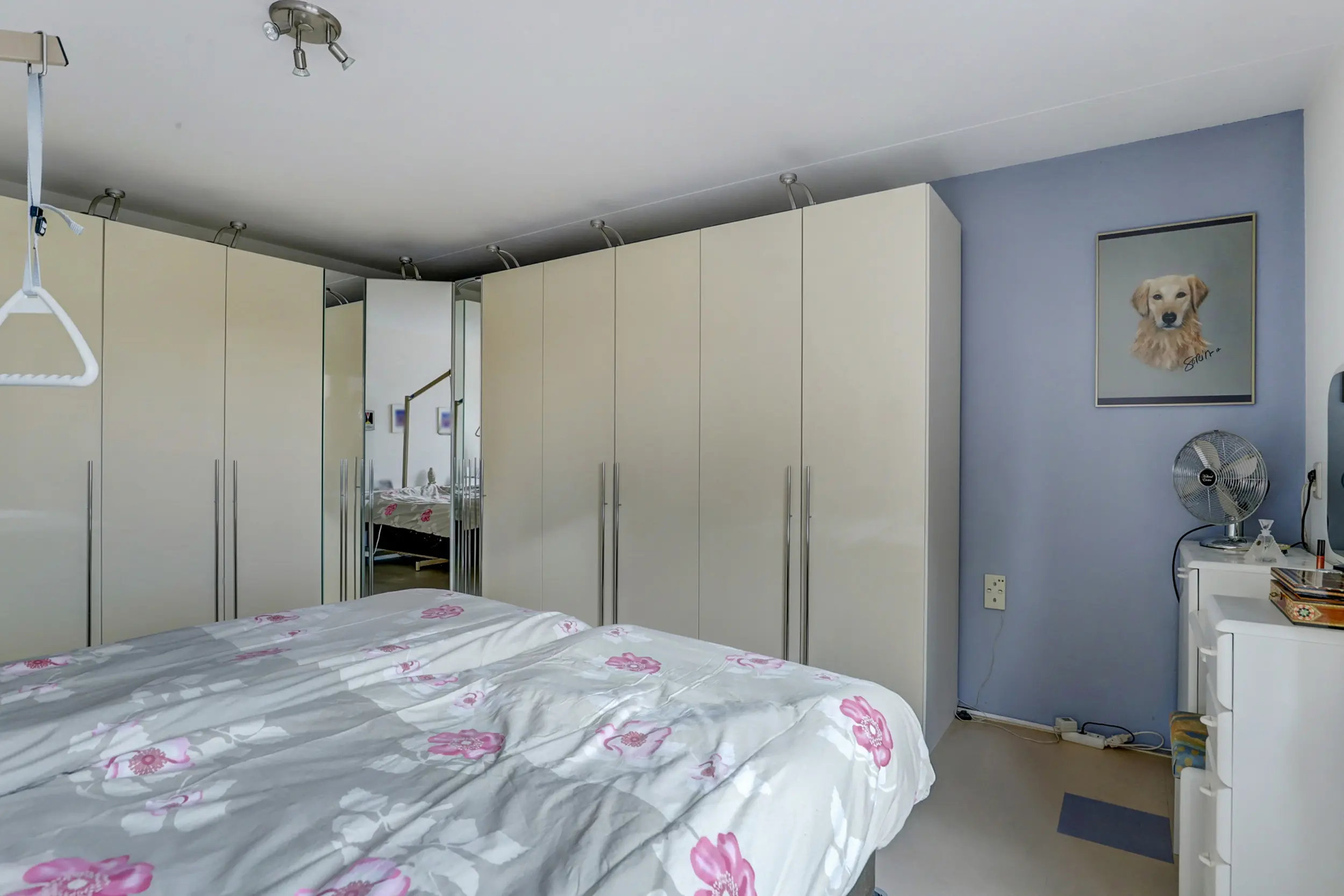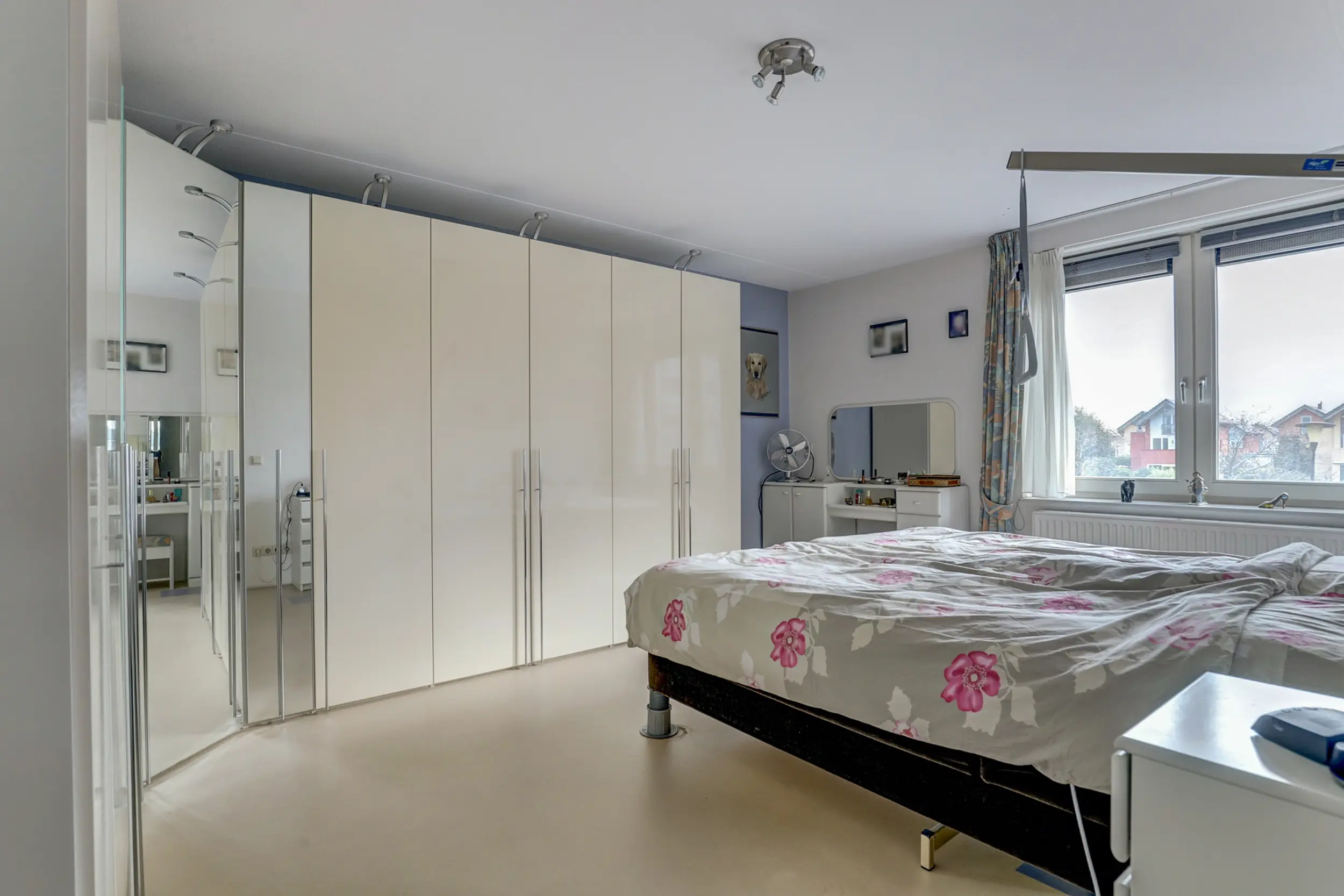 Via de hal lopen we naar de hoofdslaapkamer aan de achterzijde – een mooie kamer van bijna 19 m². Deze is riant en biedt voldoende ruimte voor een groot tweepersoonsbed en een ruime kastenwand.