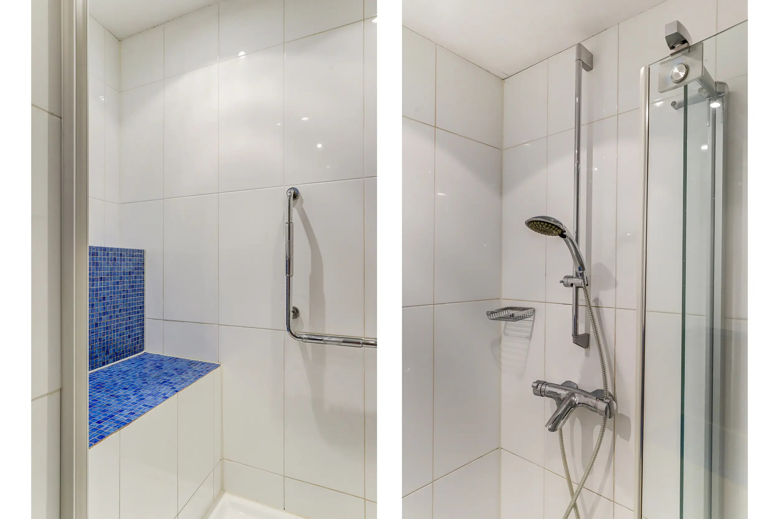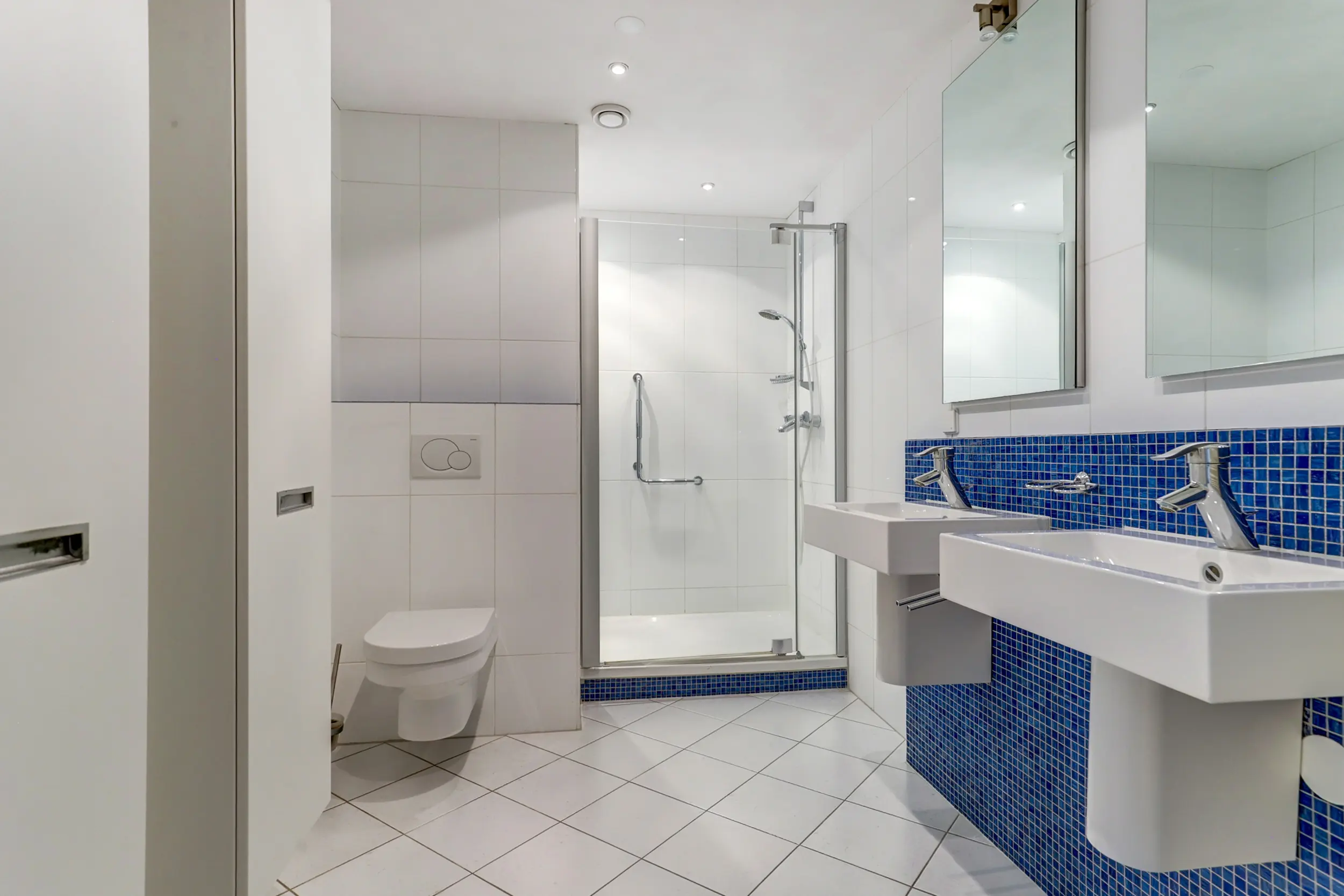 Tussen de twee slaapkamers ligt de ruime badkamer, voorzien van een grote douchecabine, tweede toilet en twee moderne wastafels met mengkranen en grote spiegels met verlichting erboven.
