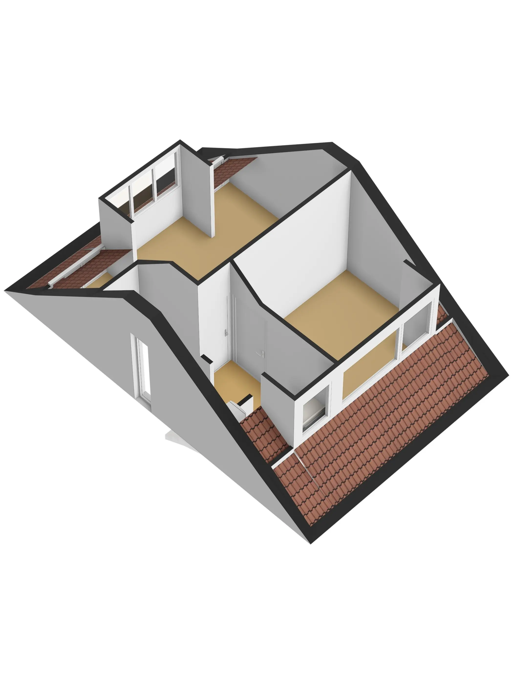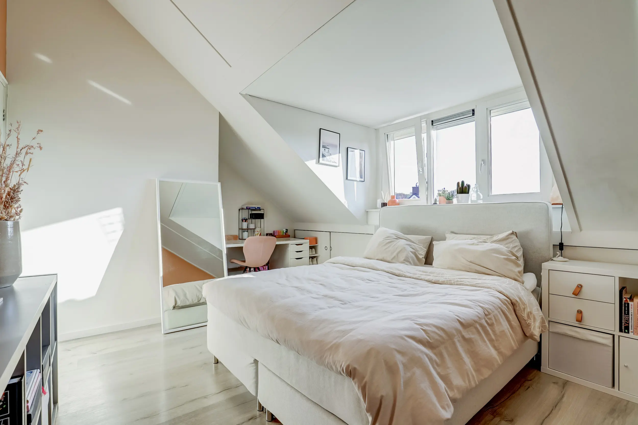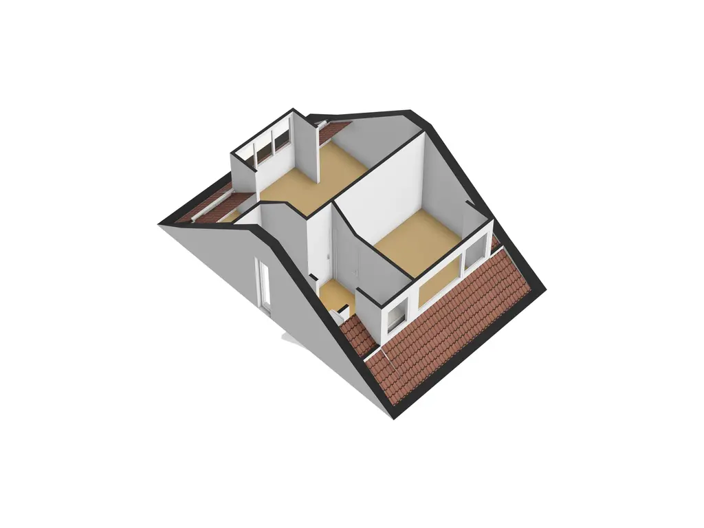 De vaste trap leidt naar de zolderverdieping, waar nog eens twee ruime kamers zijn gecreëerd. Dankzij de dakkapellen is de ruimte optimaal benut. Deze verdieping leent zich perfect voor een master bedroom, werkruimte of een gastenverblijf.
