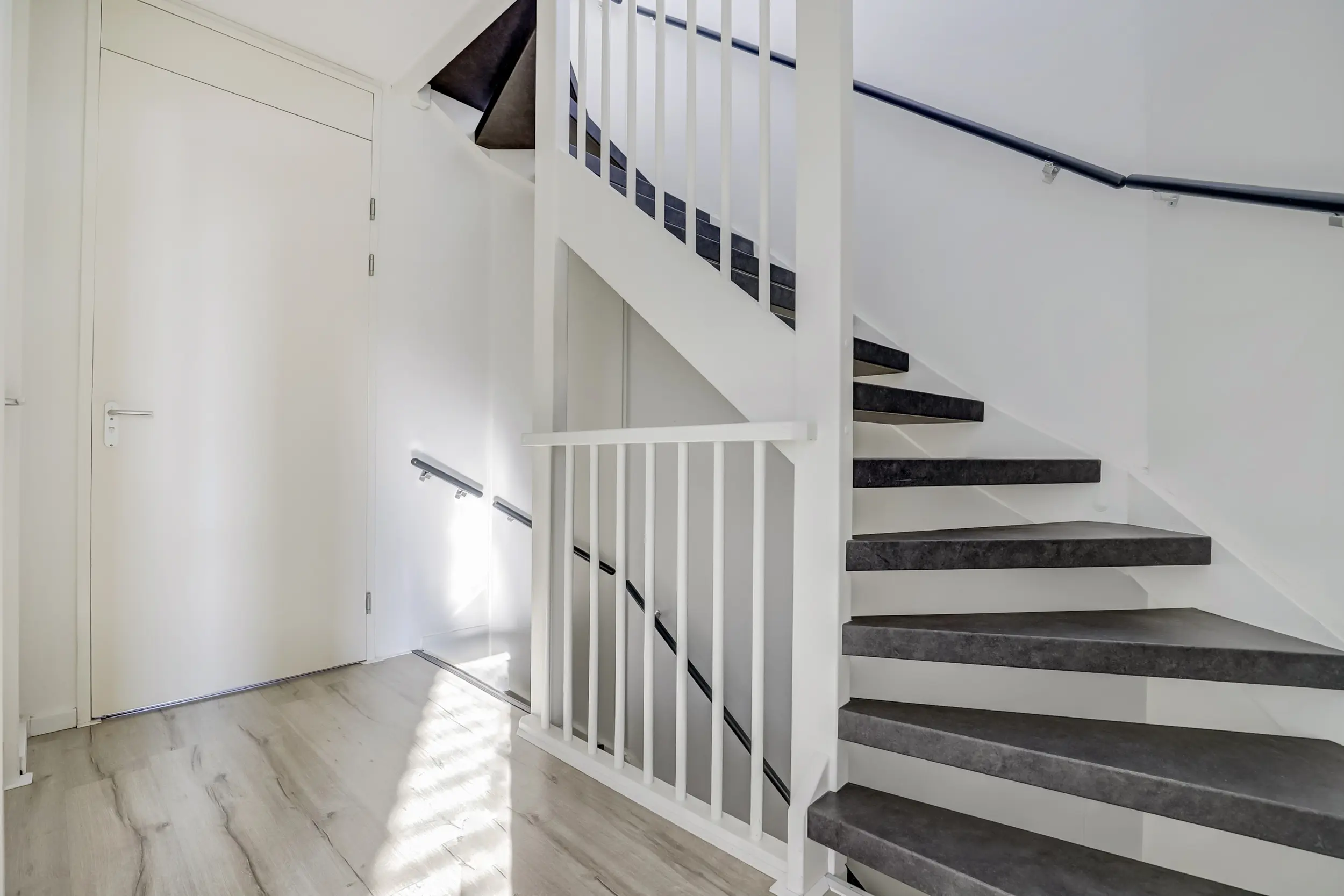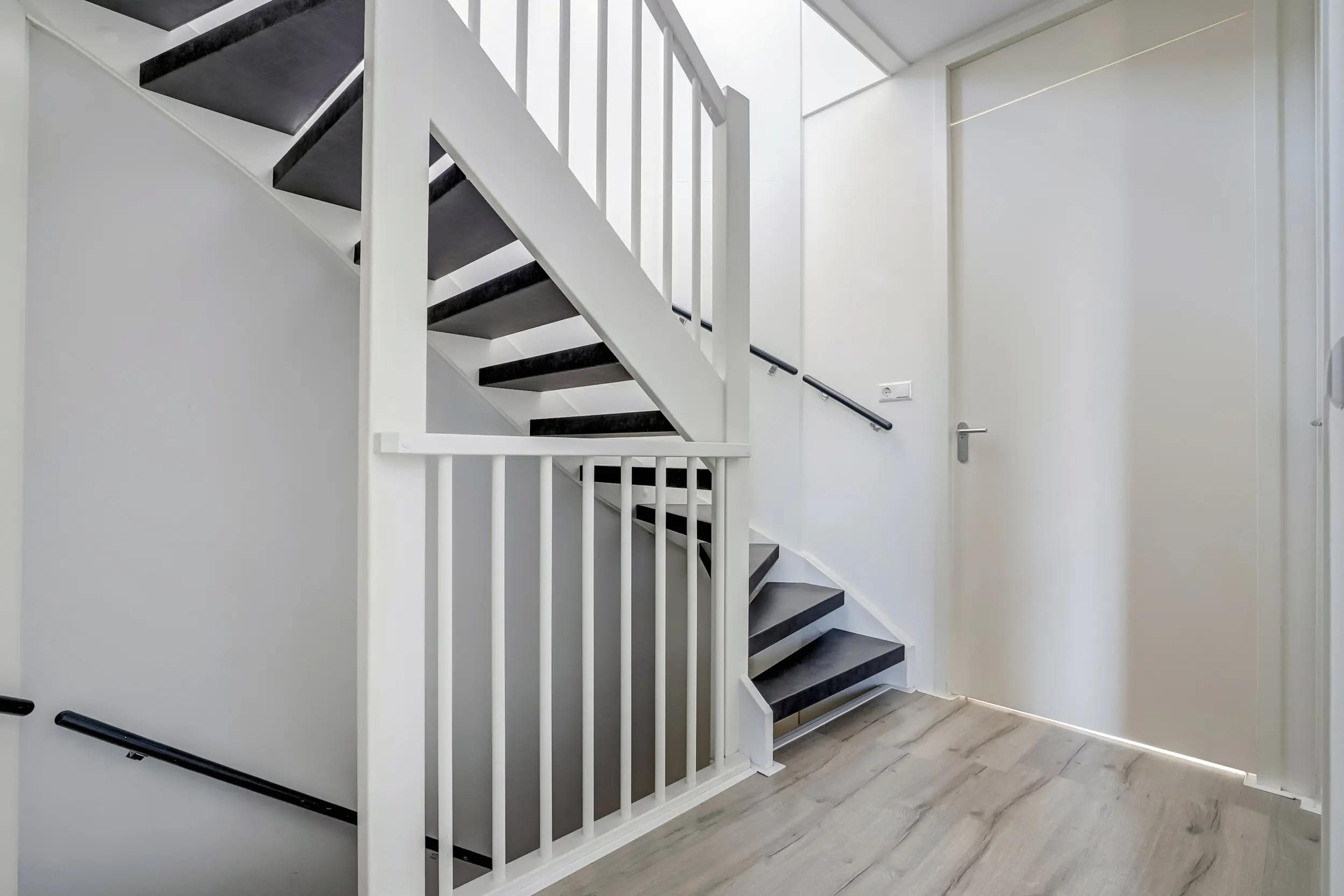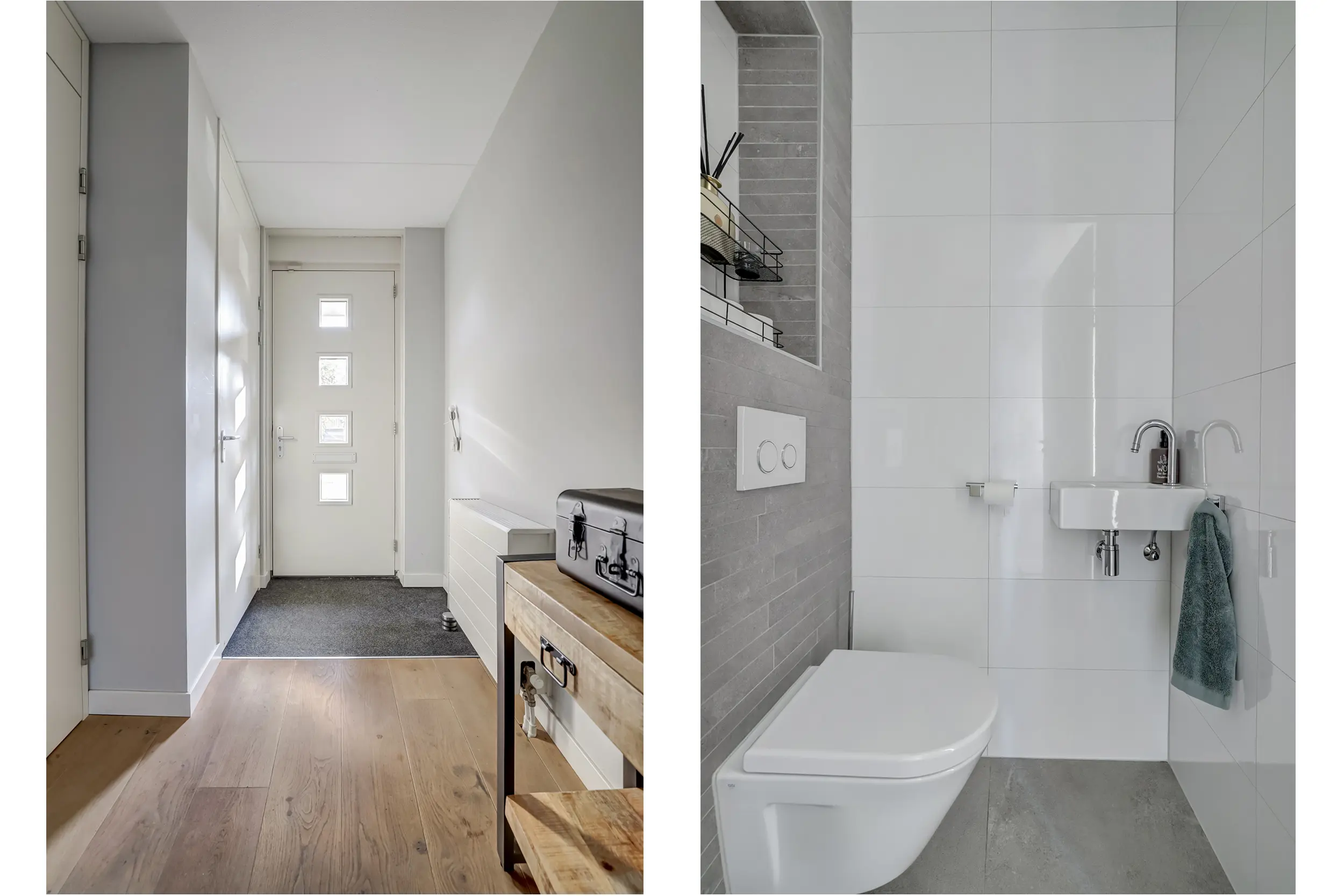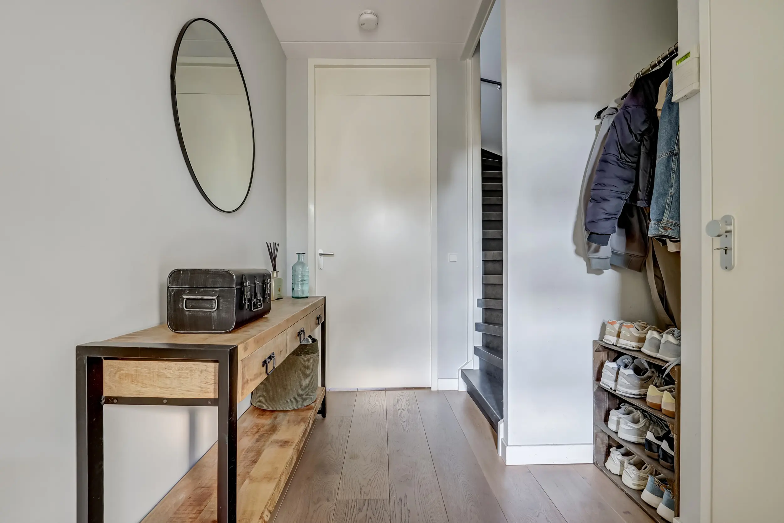Bij binnenkomst in de ruime hal wordt direct de toon gezet. Een eikenhouten vloer, strakke wandafwerking en een gevoel van openheid voeren de boventoon. Vanuit de hal bereikt u het moderne toilet, de meterkast, de trap naar boven en de sfeervolle woonkamer.