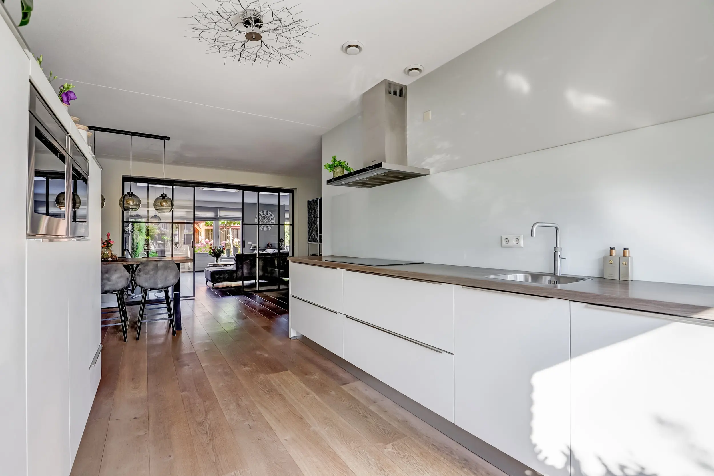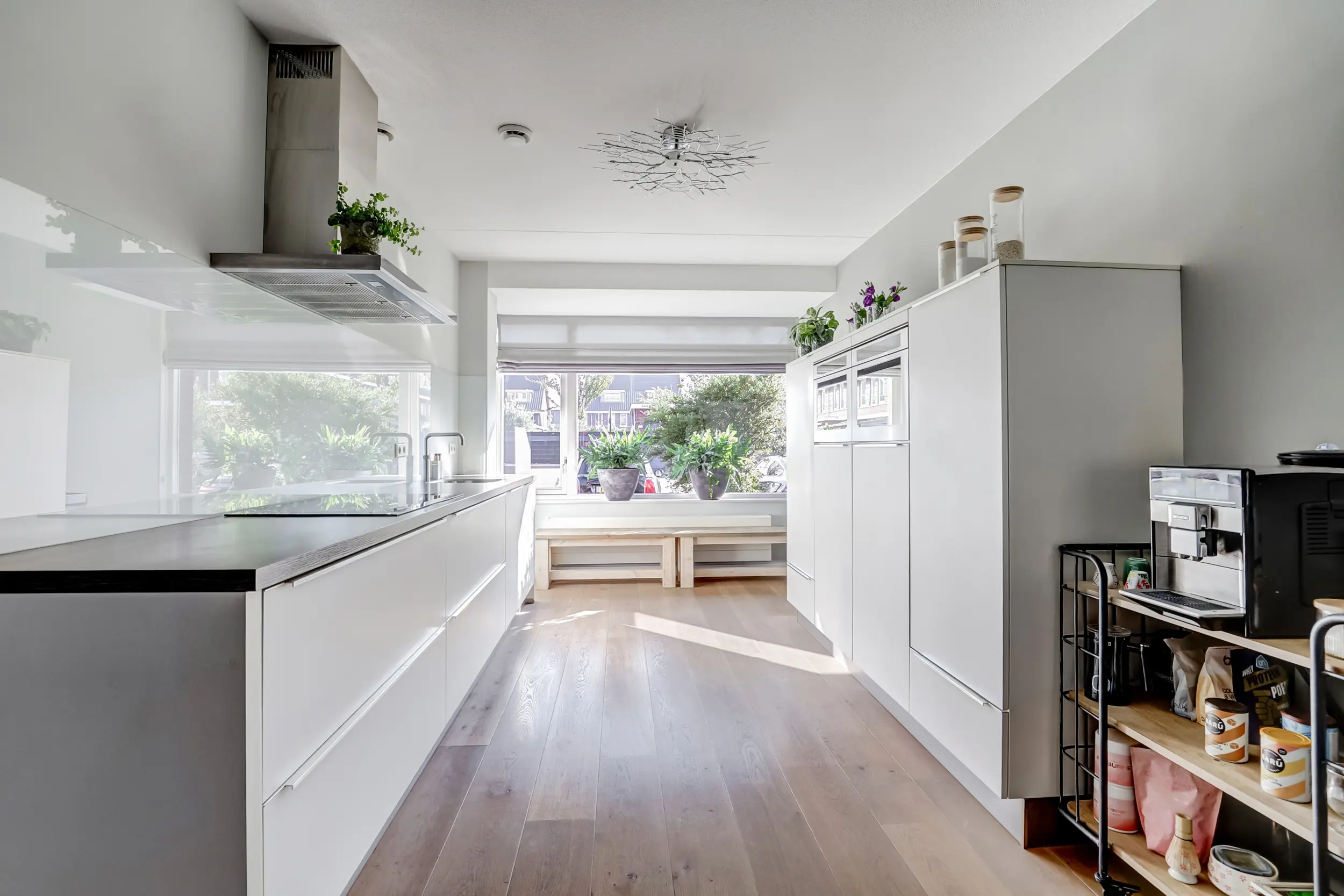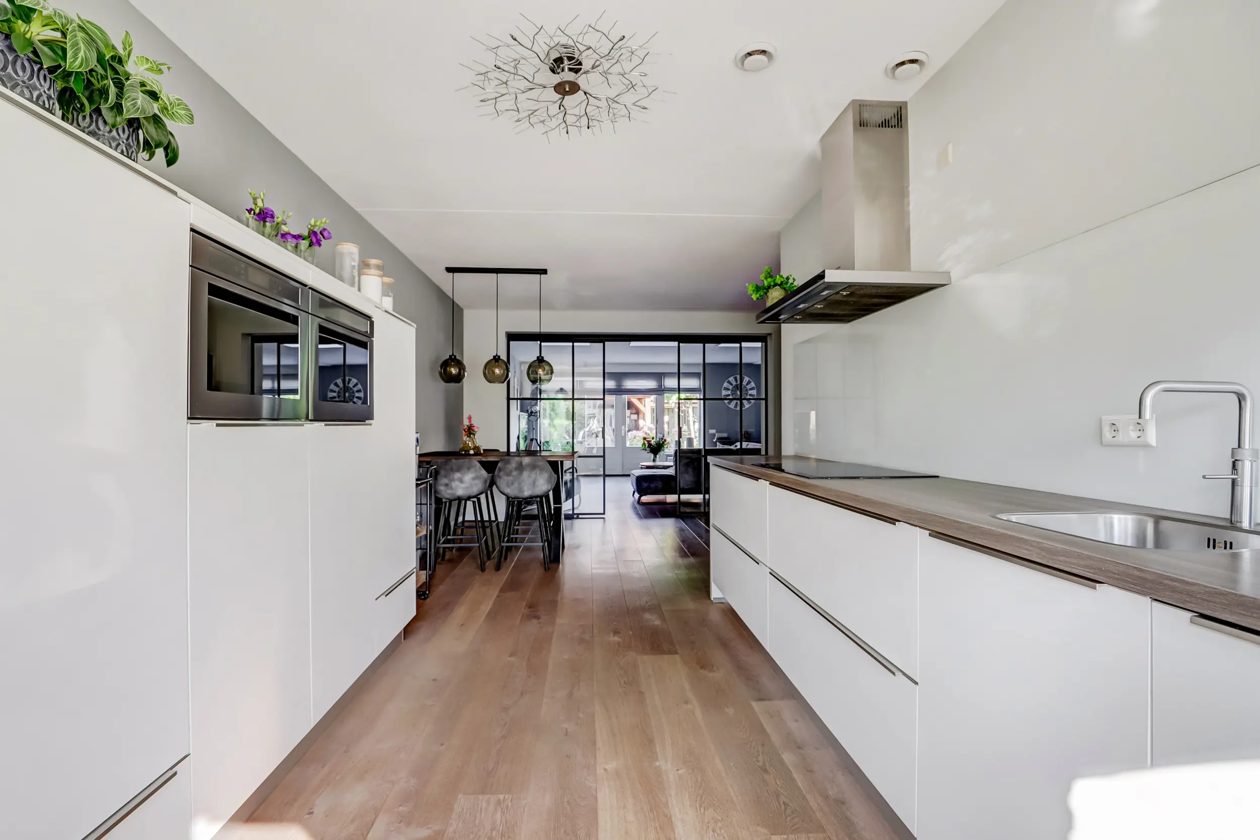 De open keuken aan de voorzijde is een droom voor iedere kookliefhebber. Strakke lijnen, moderne apparatuur zoals een koelkast, aparte vriezer, 4 pits inductiekookplaat met RVS afzuigkap met koolstoffilters, 2 combi magnetrons, een vaatwasser en een Quooker zorgen ervoor dat koken hier een plezier wordt. Zwart stalen schuifdeuren scheiden de keuken subtiel van de woonkamer, waardoor het licht vrij spel heeft maar de ruimtes toch een eigen sfeer behouden. De lichte kleurstelling, gecombineerd met warme accenten, maakt dit de ideale plek om samen te ontbijten met uitzicht op de rustige straat.