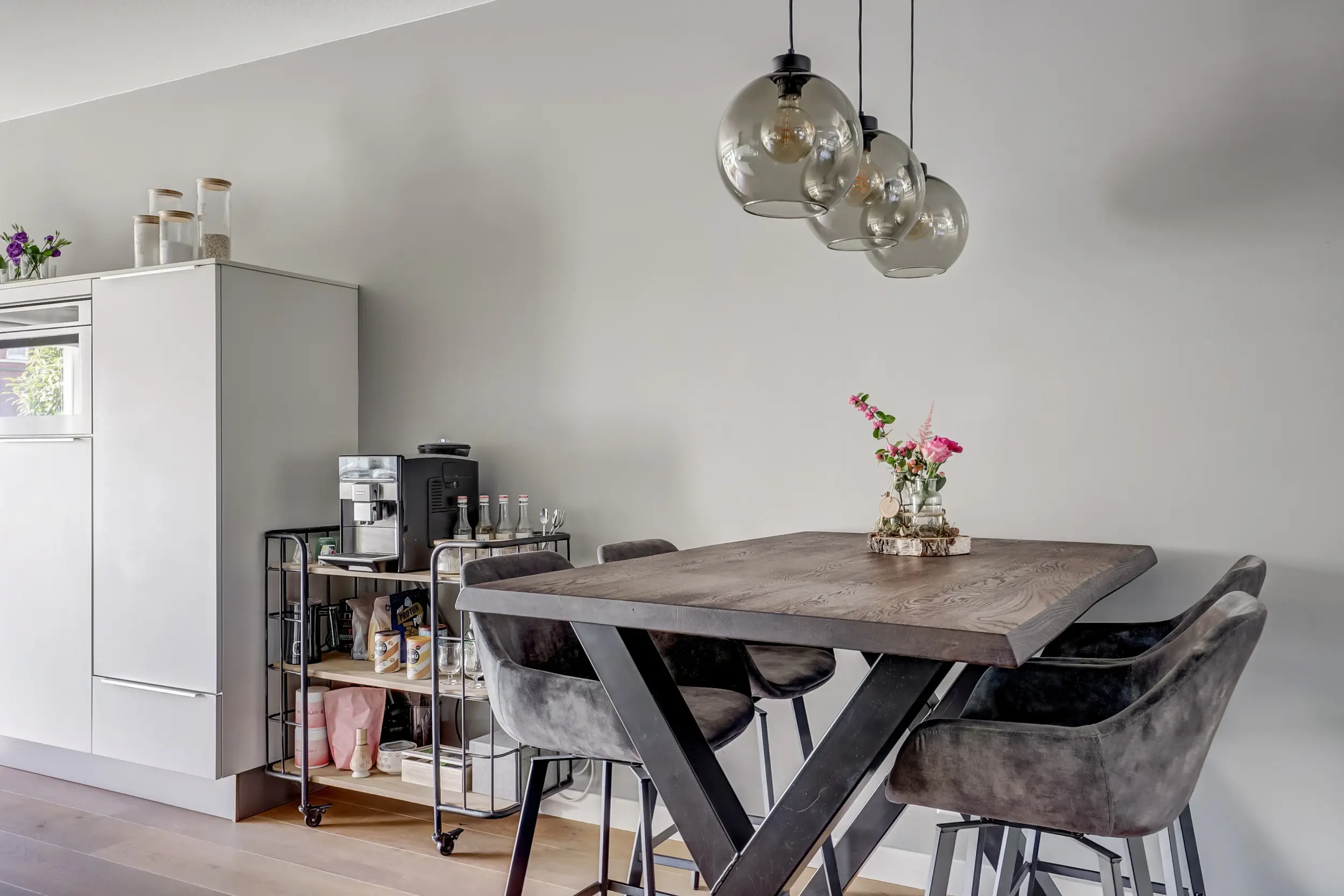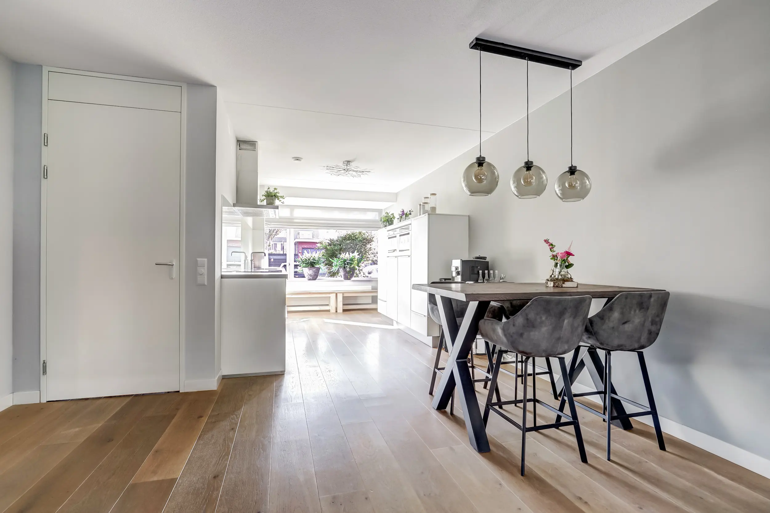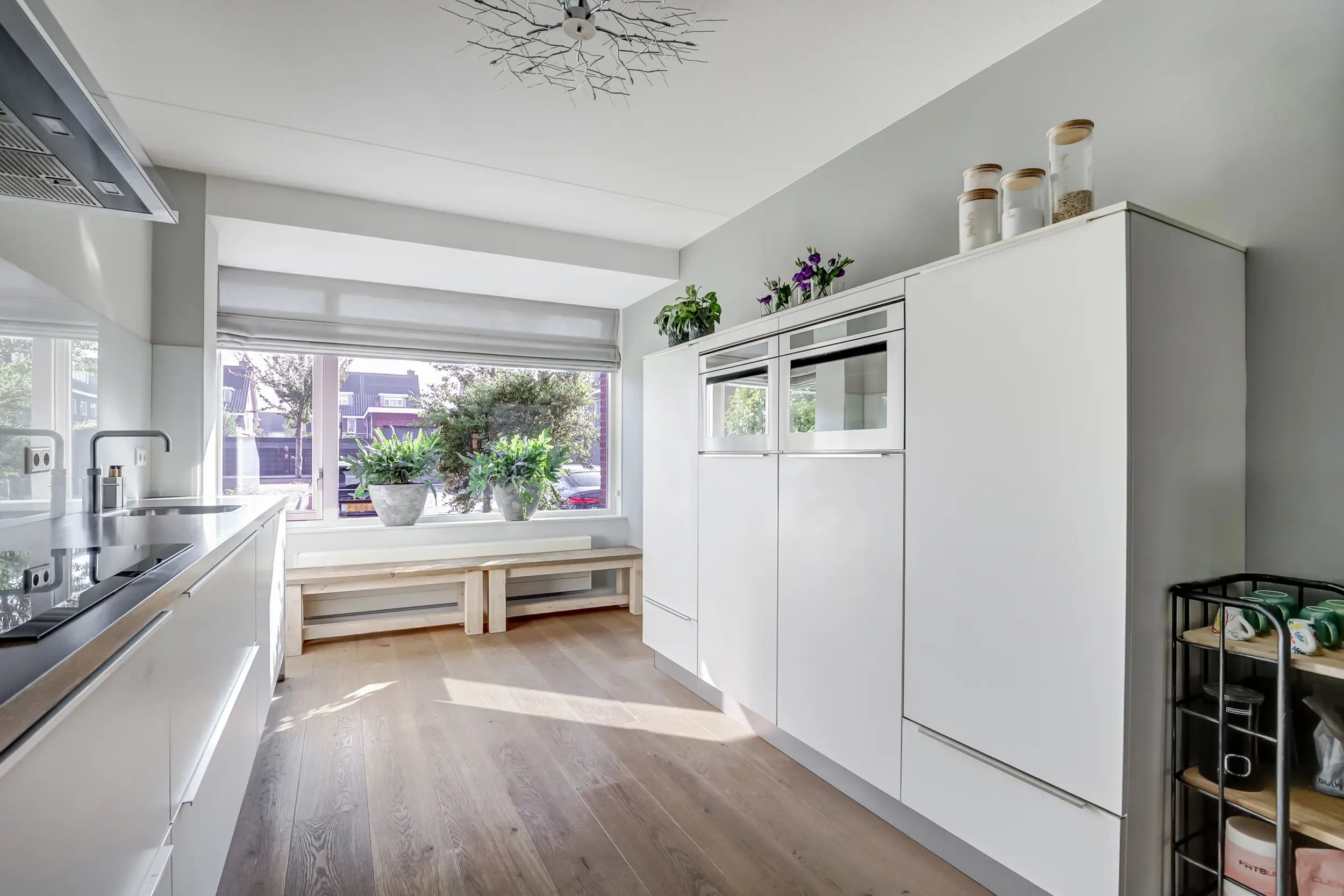 De open keuken aan de voorzijde is een droom voor iedere kookliefhebber. Strakke lijnen, moderne apparatuur zoals een koelkast, aparte vriezer, 4 pits inductiekookplaat met RVS afzuigkap met koolstoffilters, 2 combi magnetrons, een vaatwasser en een Quooker zorgen ervoor dat koken hier een plezier wordt. Zwart stalen schuifdeuren scheiden de keuken subtiel van de woonkamer, waardoor het licht vrij spel heeft maar de ruimtes toch een eigen sfeer behouden. De lichte kleurstelling, gecombineerd met warme accenten, maakt dit de ideale plek om samen te ontbijten met uitzicht op de rustige straat.