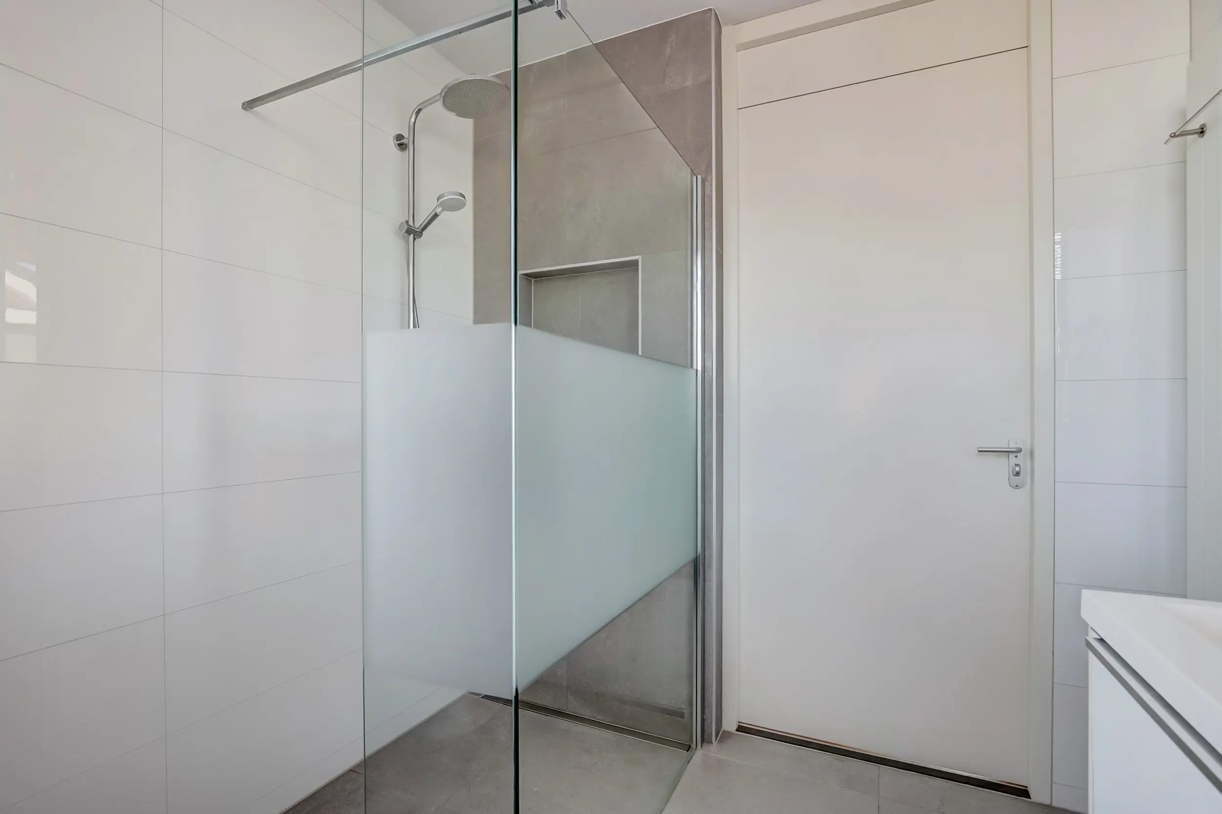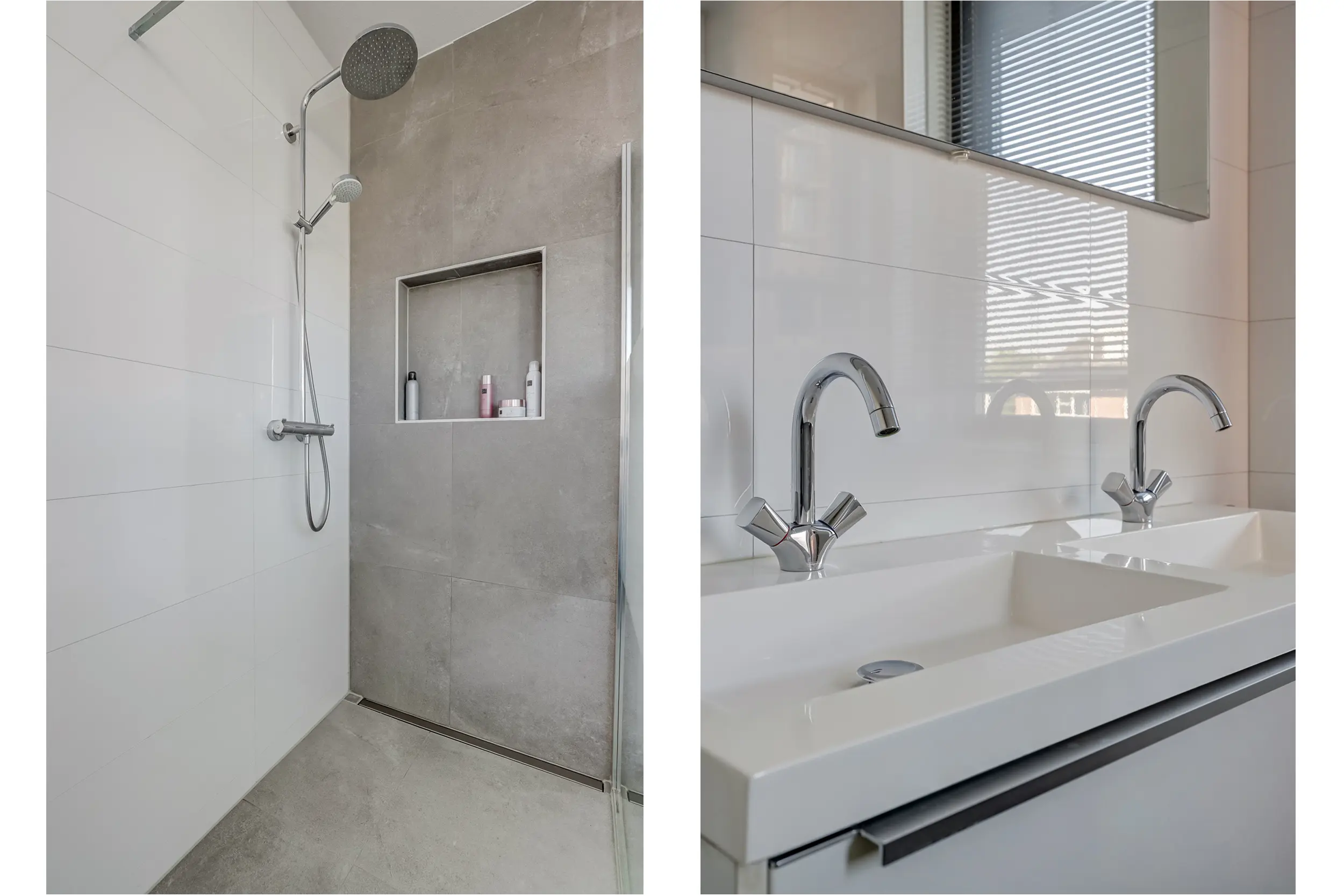 De badkamer is stijlvol ingericht met een moderne douche, dubbel wastafelmeubel en een frisse, tijdloze uitstraling. Hier ervaart u het comfort van een wellnessruimte in uw eigen huis!