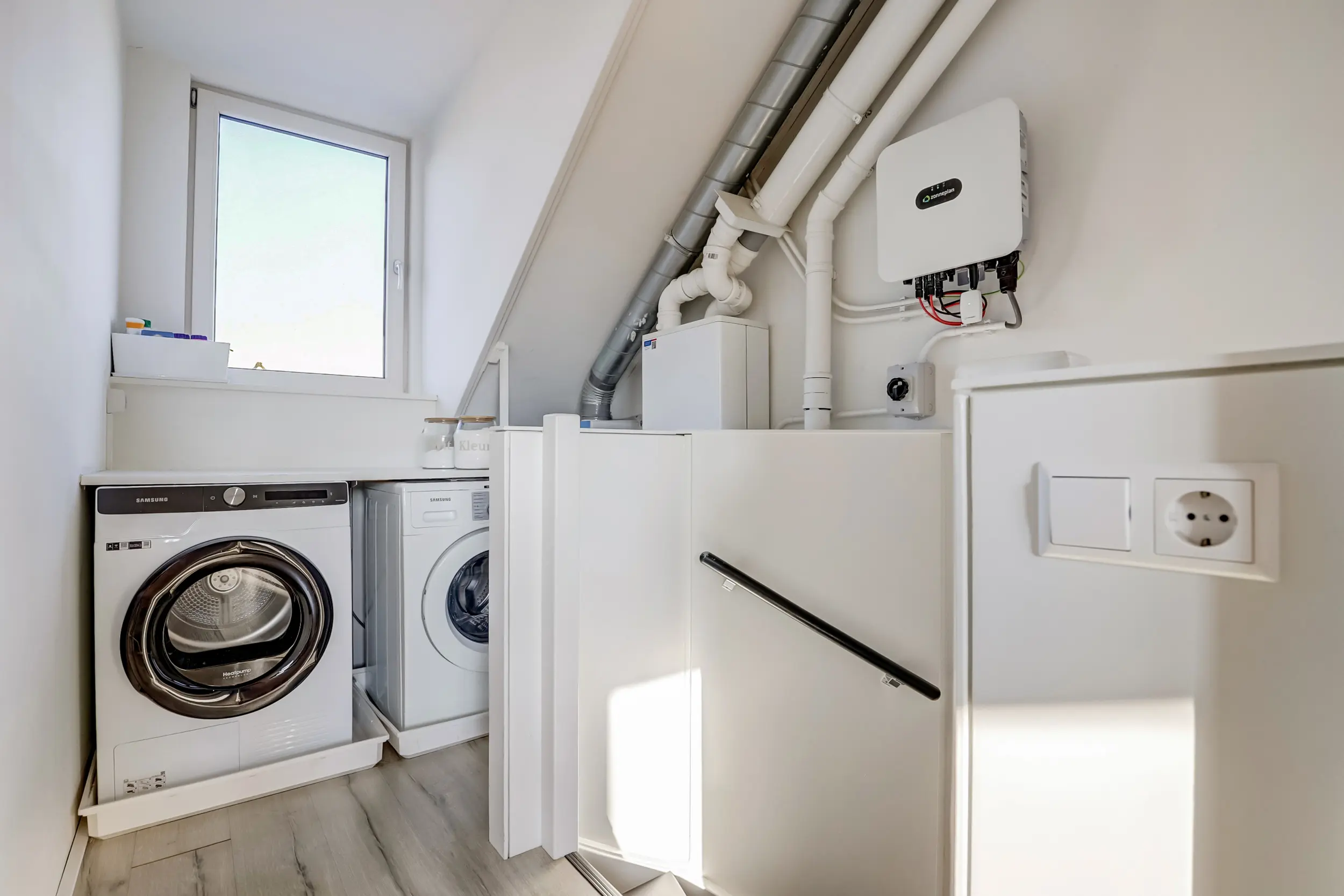 Op de overloop bevinden zich de aansluitingen voor de wasmachine en de droger en de opstelling voor de CV ketel, MV installatie en de omvormer voor de zonnepanelen. De ruimte is praktisch ingedeeld met hoogwaardige materialen en een nette afwerking, waardoor ook de functionele delen van het huis een verzorgde uitstraling hebben.
