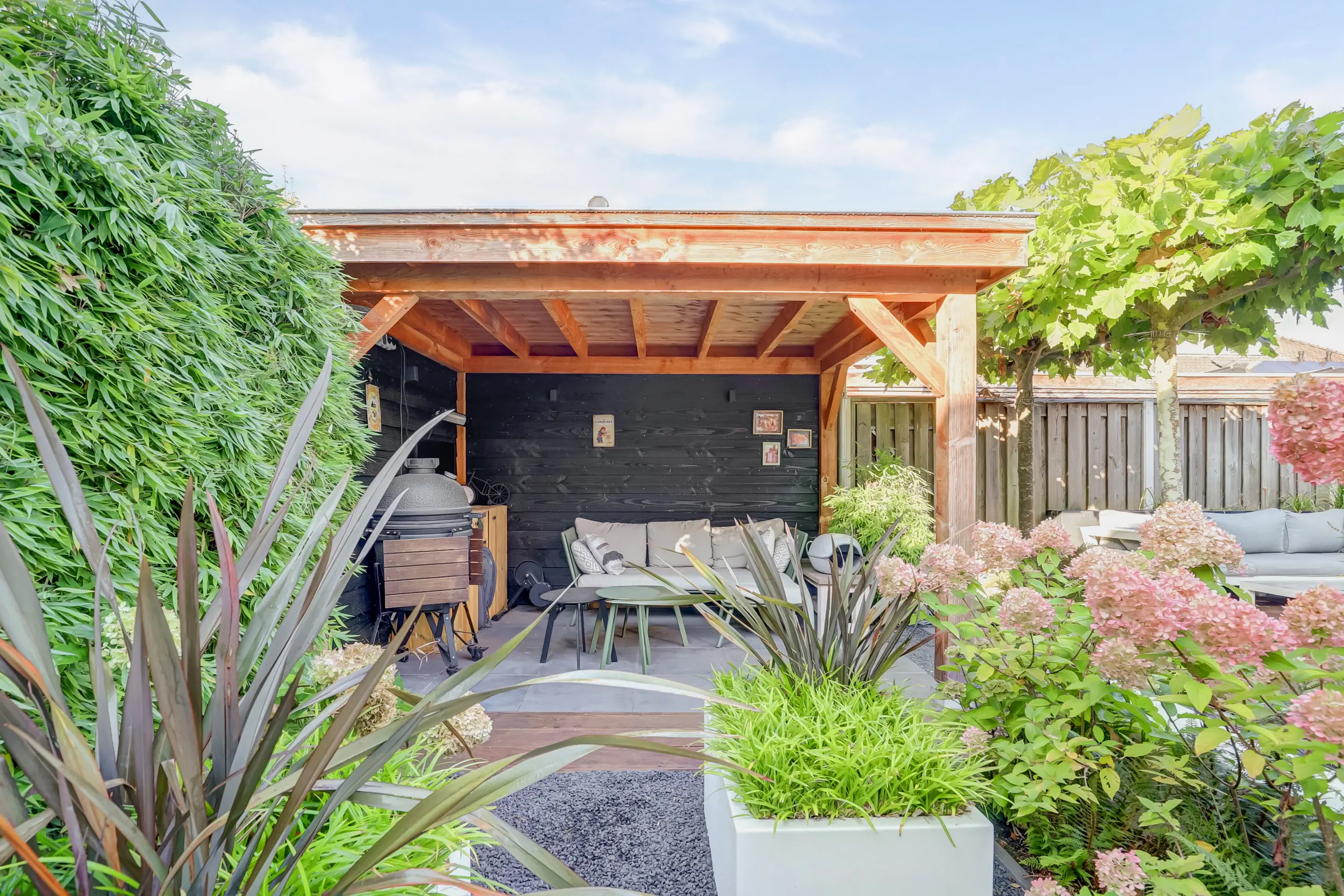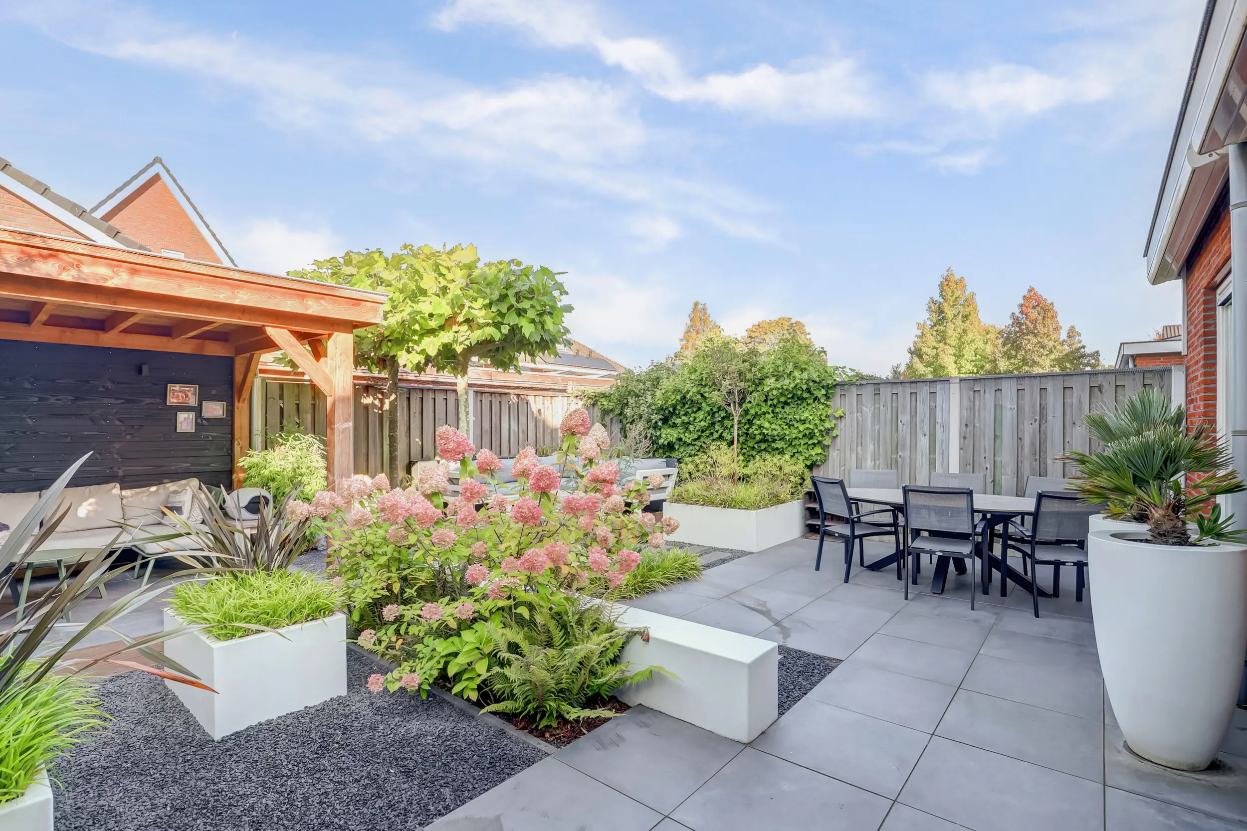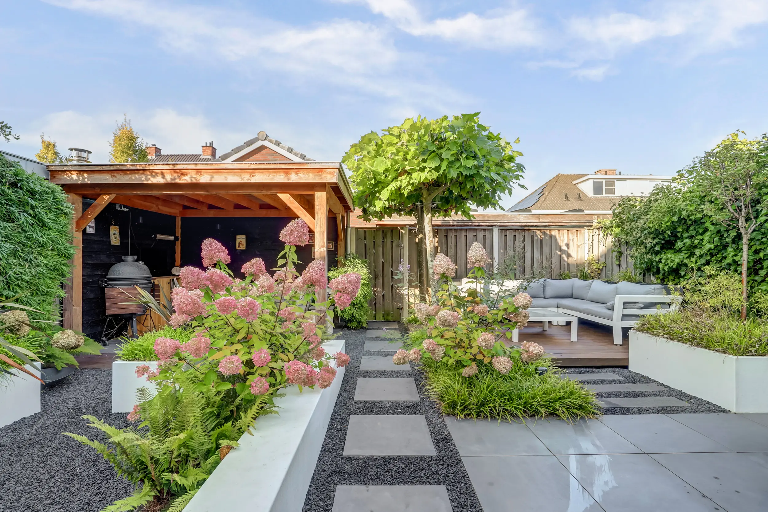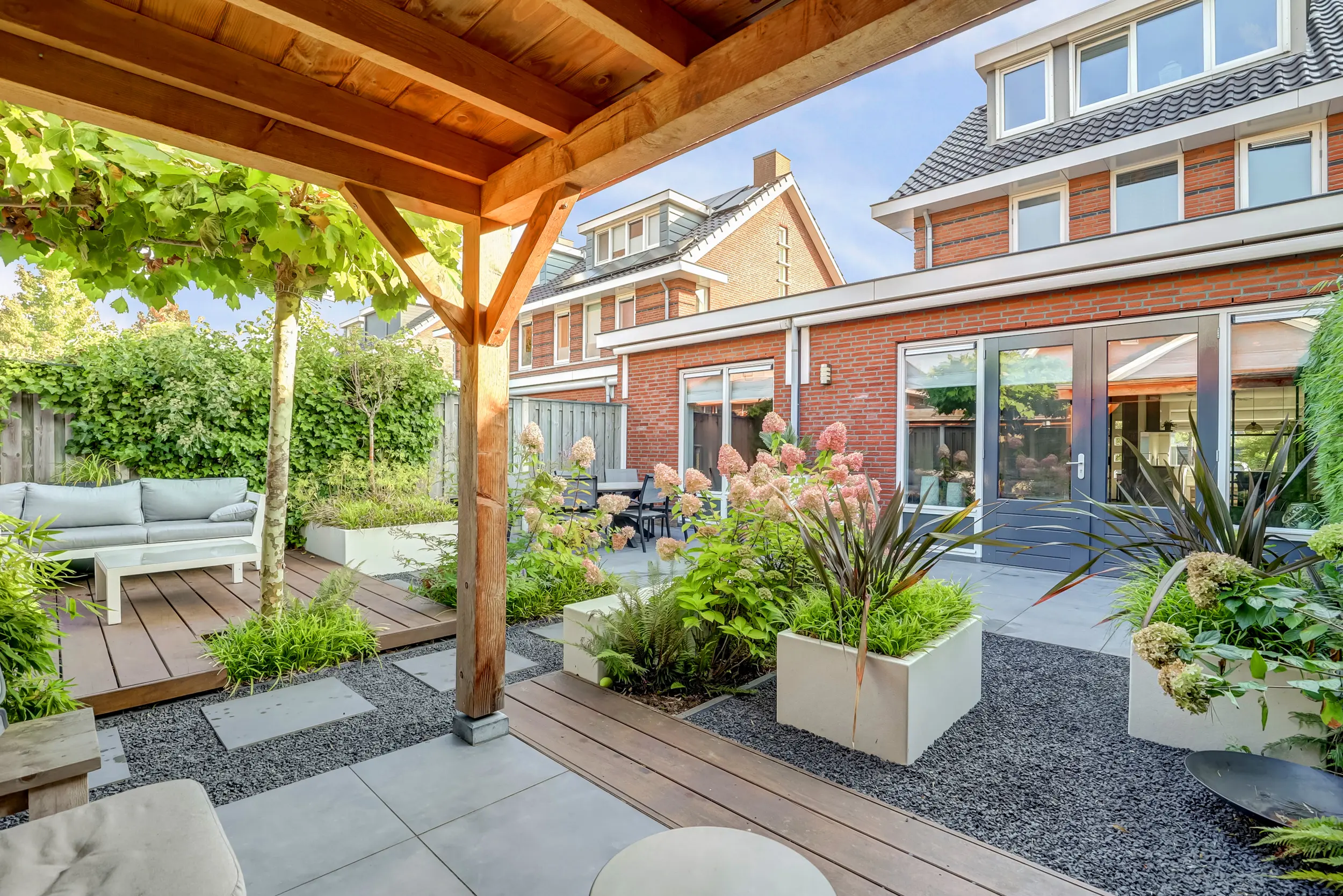 De door een tuinarchitect ontworpen achtertuin is een uitnodigende buitenruimte waar u in alle rust kunt ontspannen. Dankzij de ideale zonligging op het westen geniet u de hele dag van licht en warmte. Achter in de tuin bevindt zich een overkapping (2,61 m x 3,57 m) uitgevoerd in Douglas hout met Zweeds rabbat, perfect voor een gezellige loungehoek of een buitenkeuken. Hier kunt u 's avonds genieten van een goed glas wijn terwijl de zon langzaam ondergaat. De tuin is onderhoudsvriendelijk aangelegd met een perfecte combinatie van groen en bestrating, ideaal voor zowel ontspanning als gezelligheid!