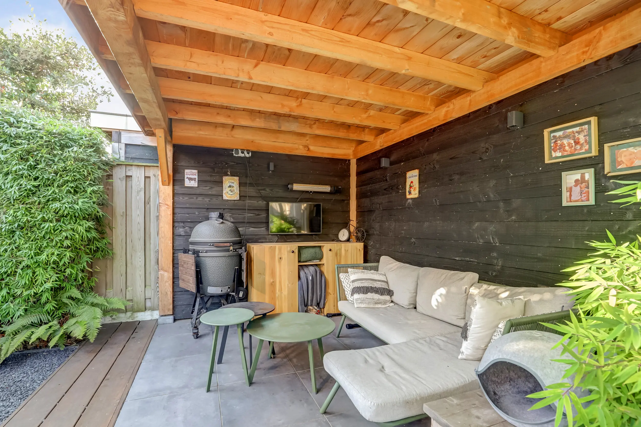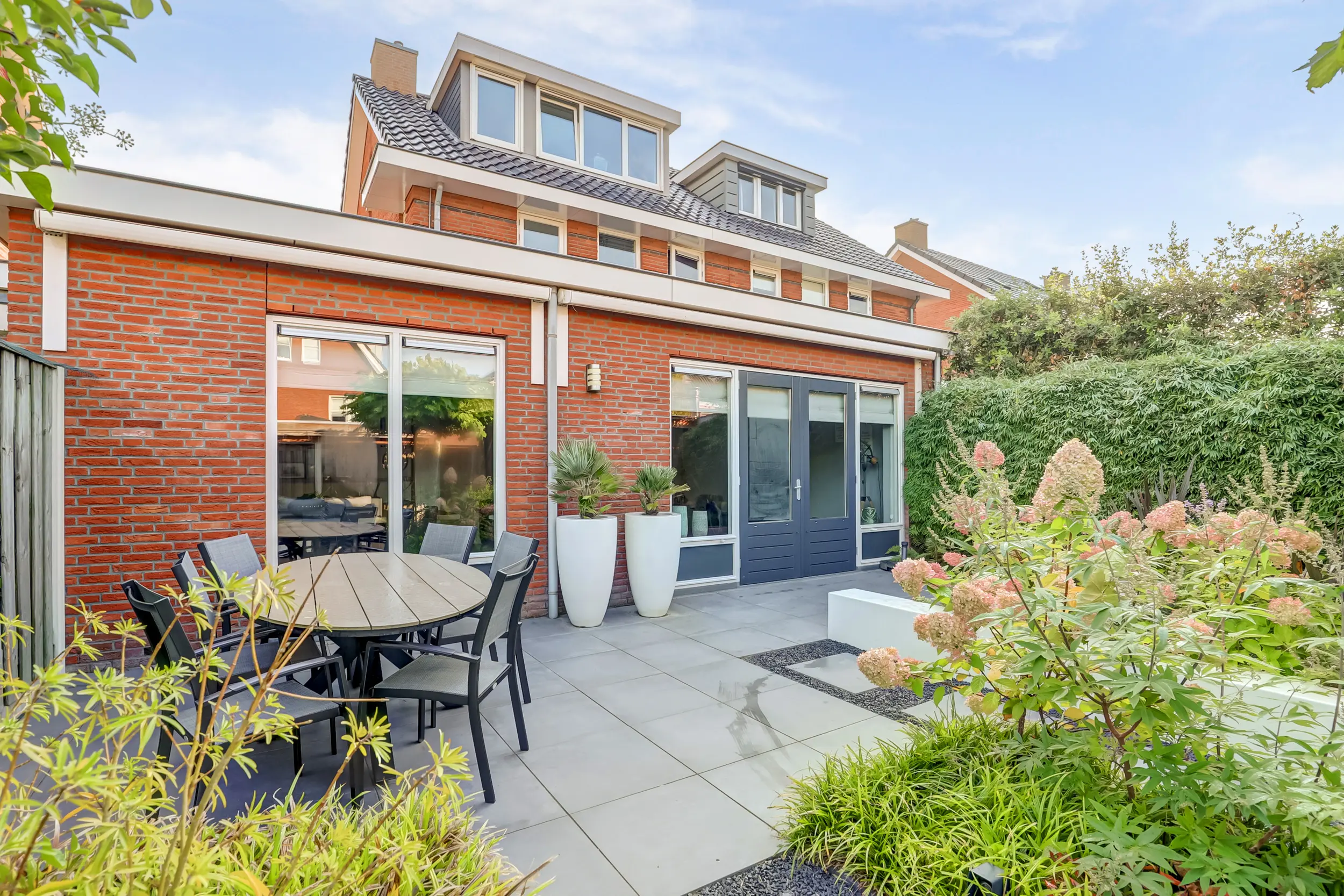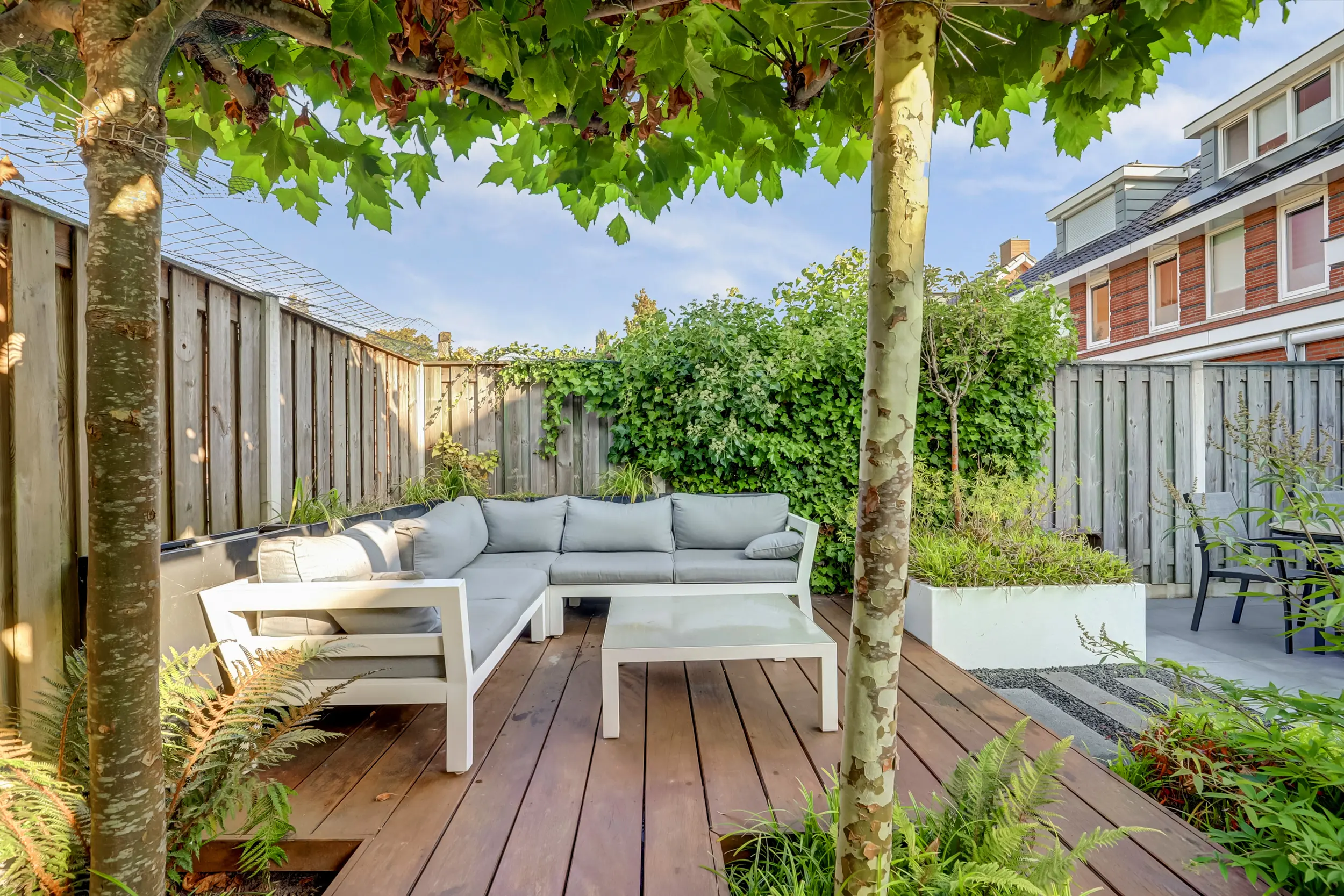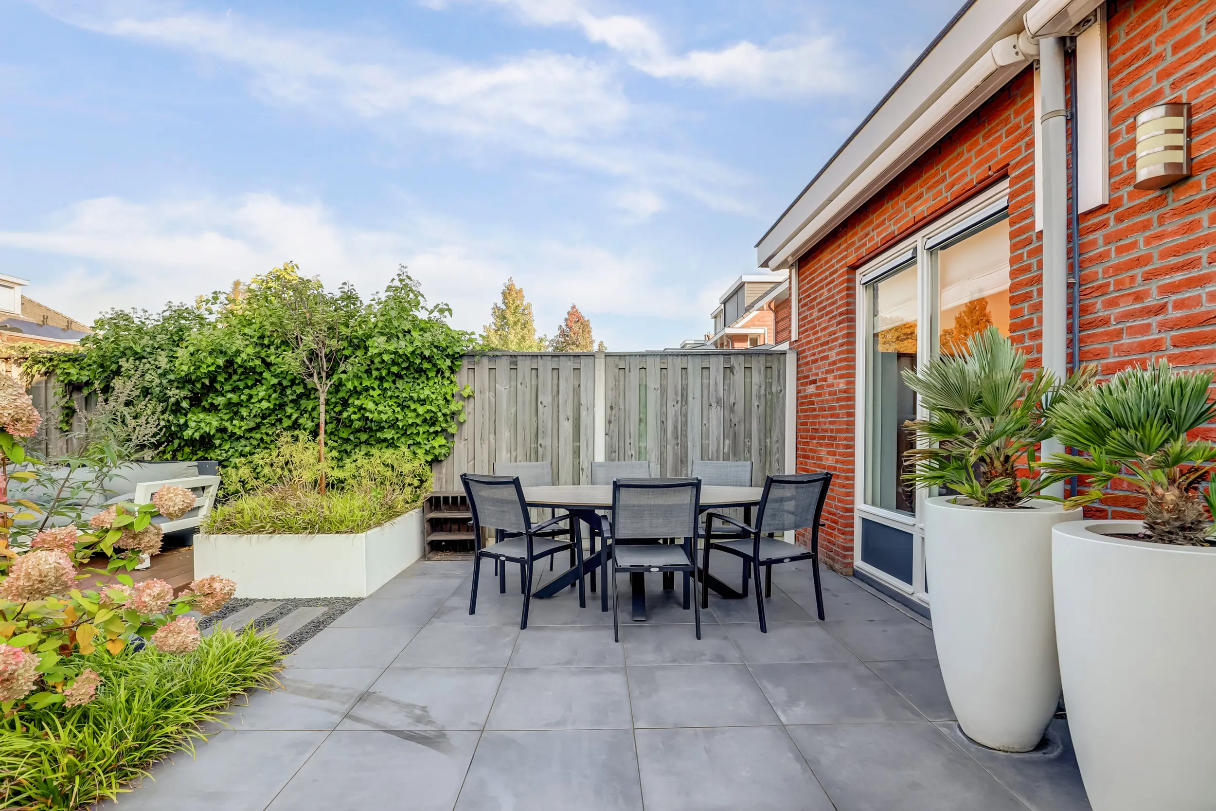 De door een tuinarchitect ontworpen achtertuin is een uitnodigende buitenruimte waar u in alle rust kunt ontspannen. Dankzij de ideale zonligging op het westen geniet u de hele dag van licht en warmte. Achter in de tuin bevindt zich een overkapping (2,61 m x 3,57 m) uitgevoerd in Douglas hout met Zweeds rabbat, perfect voor een gezellige loungehoek of een buitenkeuken. Hier kunt u 's avonds genieten van een goed glas wijn terwijl de zon langzaam ondergaat. De tuin is onderhoudsvriendelijk aangelegd met een perfecte combinatie van groen en bestrating, ideaal voor zowel ontspanning als gezelligheid!