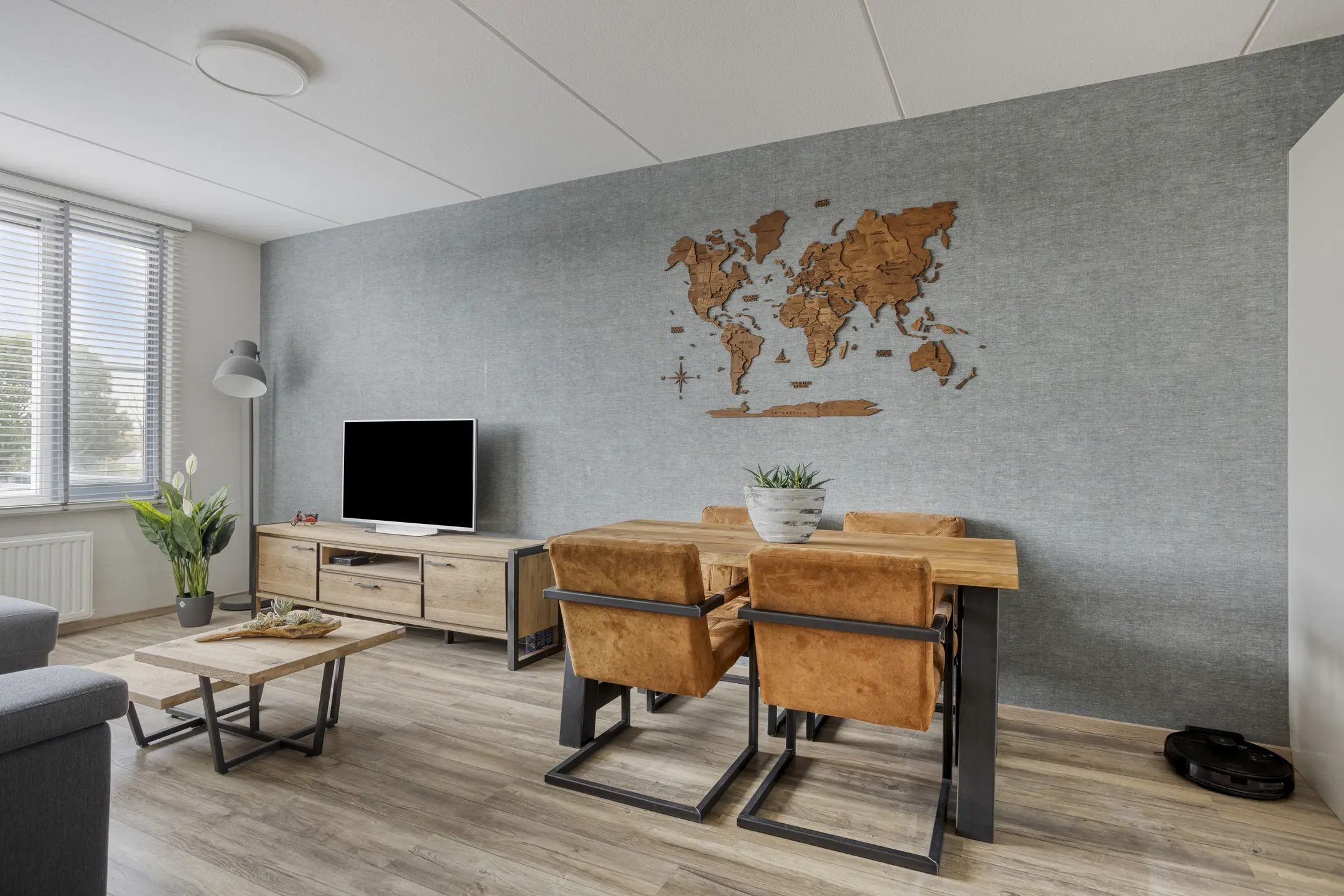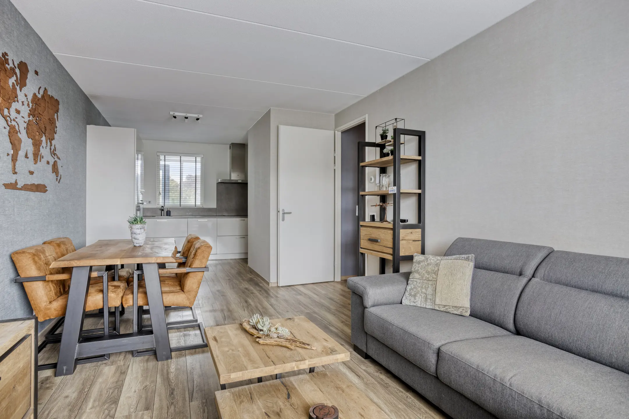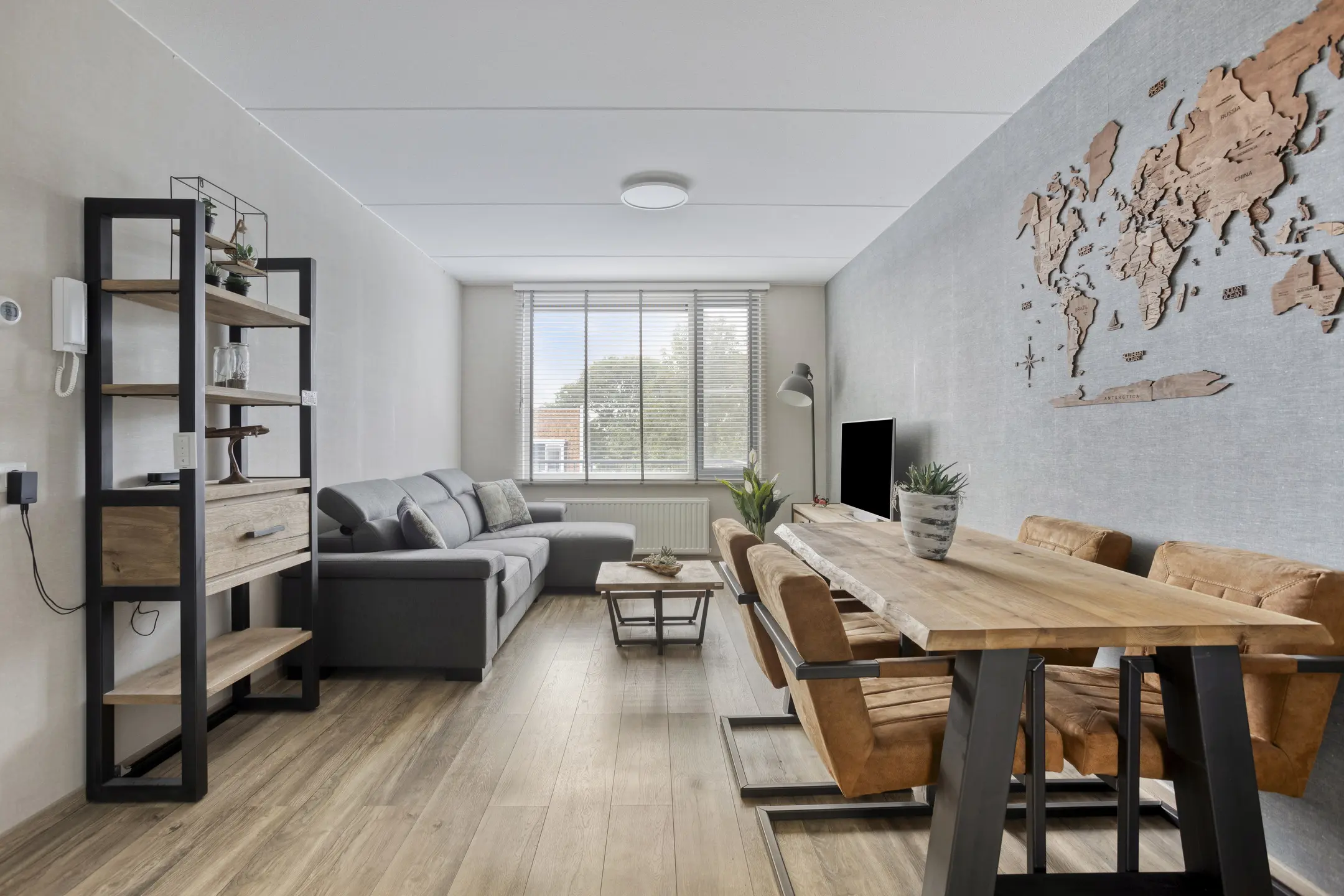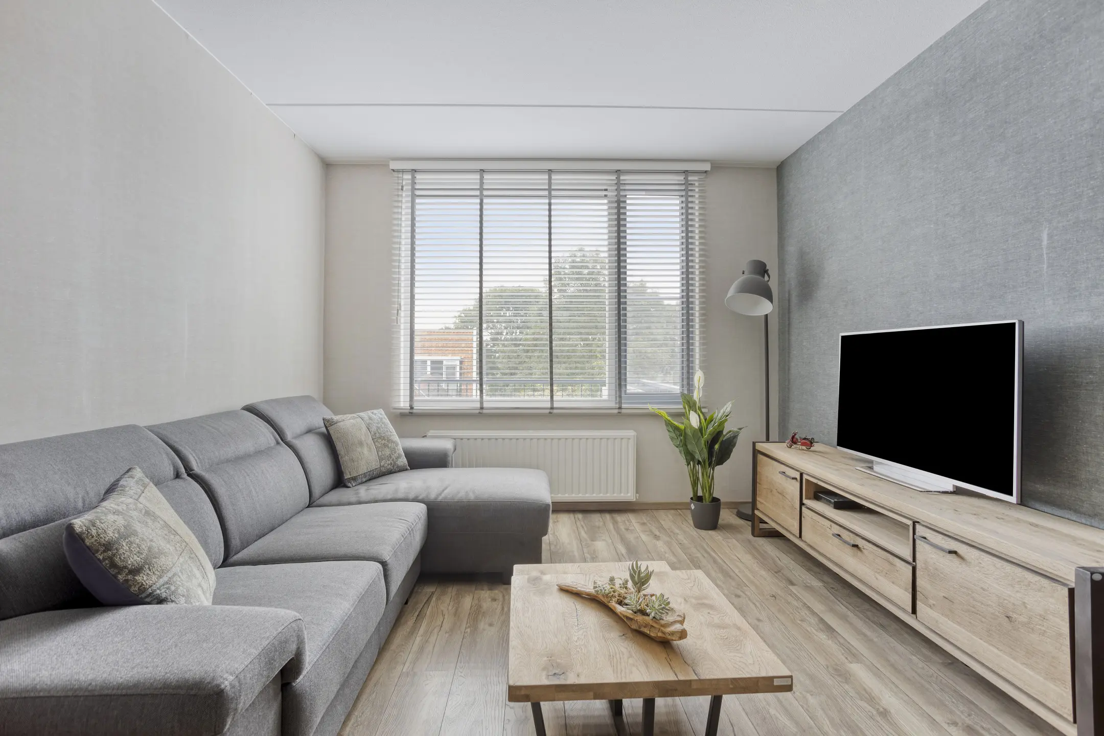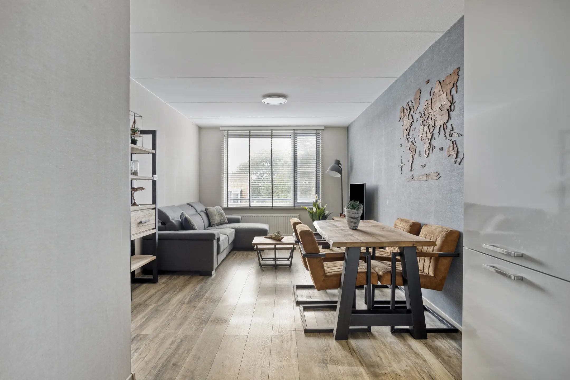 Lichte woonkamer (ca. 19 m2) voorzien van een duurzame laminaatvloer en de wanden zijn voorzien van behang.