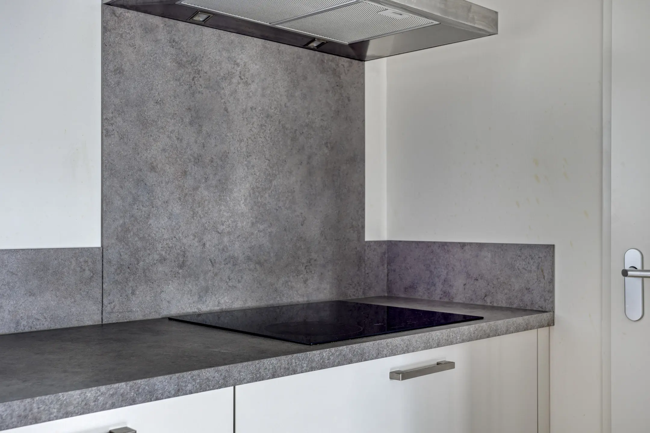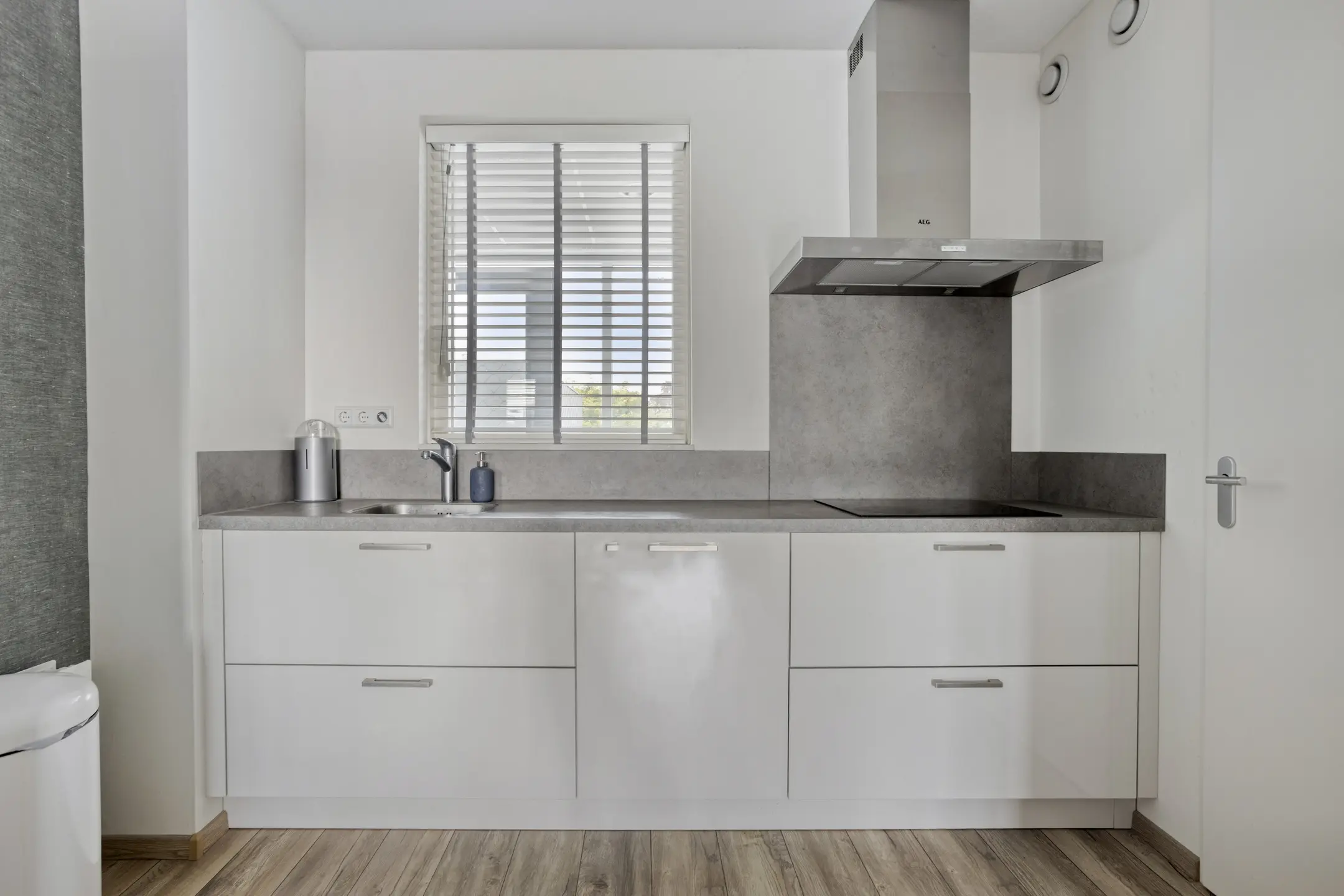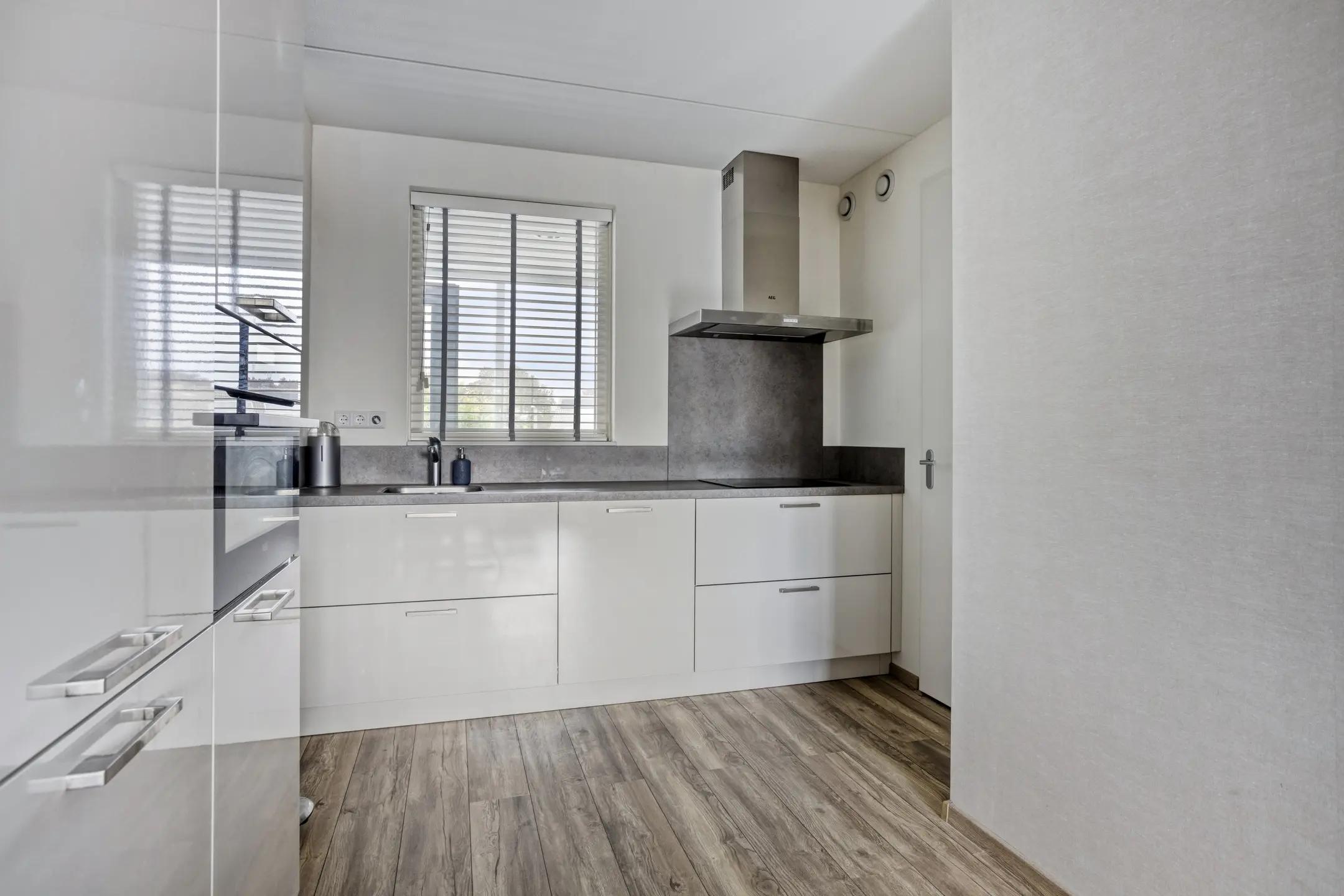 De moderne keuken (ca. 8 m2) is uitgevoerd in een rechte opstelling met een extra apparatenkast. Deze complete keuken is voorzien van diverse inbouwapparatuur zoals een koelkast, vrieskast, inductie kookplaat, RVS afzuigkap, oven en een vaatwasser. Tevens is de keuken voorzien van een enkele spoelbak en voldoende kastruimte. Het geheel is uitgevoerd in wit en afgewerkt met een kunststof aanrechtblad. Via de keuken heeft u toegang tot de wasruimte.