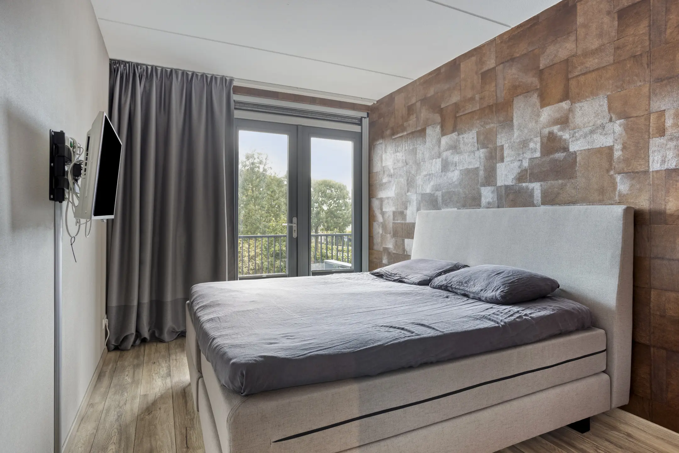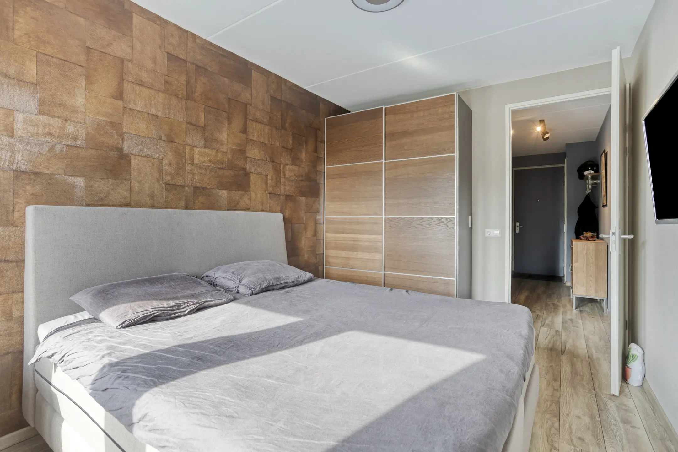 Slaapkamer (ca. 12 m2) is gelegen aan de zijkant van het appartementencomplex en beschikt over een lichte laminaatvloer en behang. Middels openslaande deuren heeft u toegang tot het zonnige balkon.