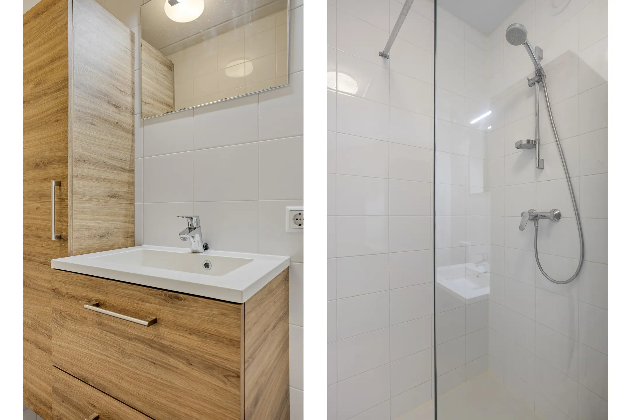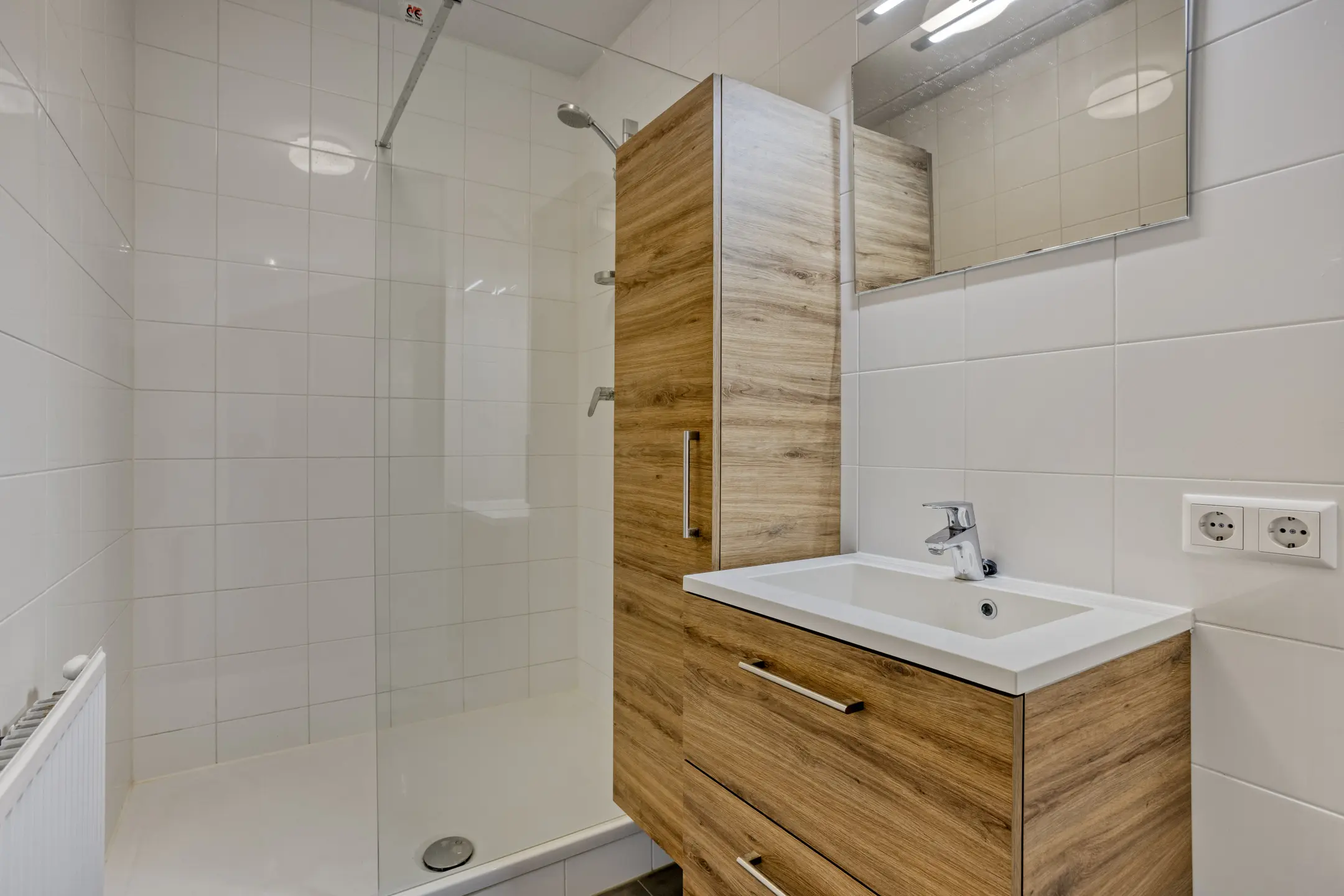 Moderne badkamer (ca. 3 m2) met sanitaire voorzieningen zoals een wastafel met wastafelmeubel, spiegel, verlichting, inloopdouche en een extra kast voor de handdoeken. De badkamer is geheel betegeld in een lichte kleurstelling.