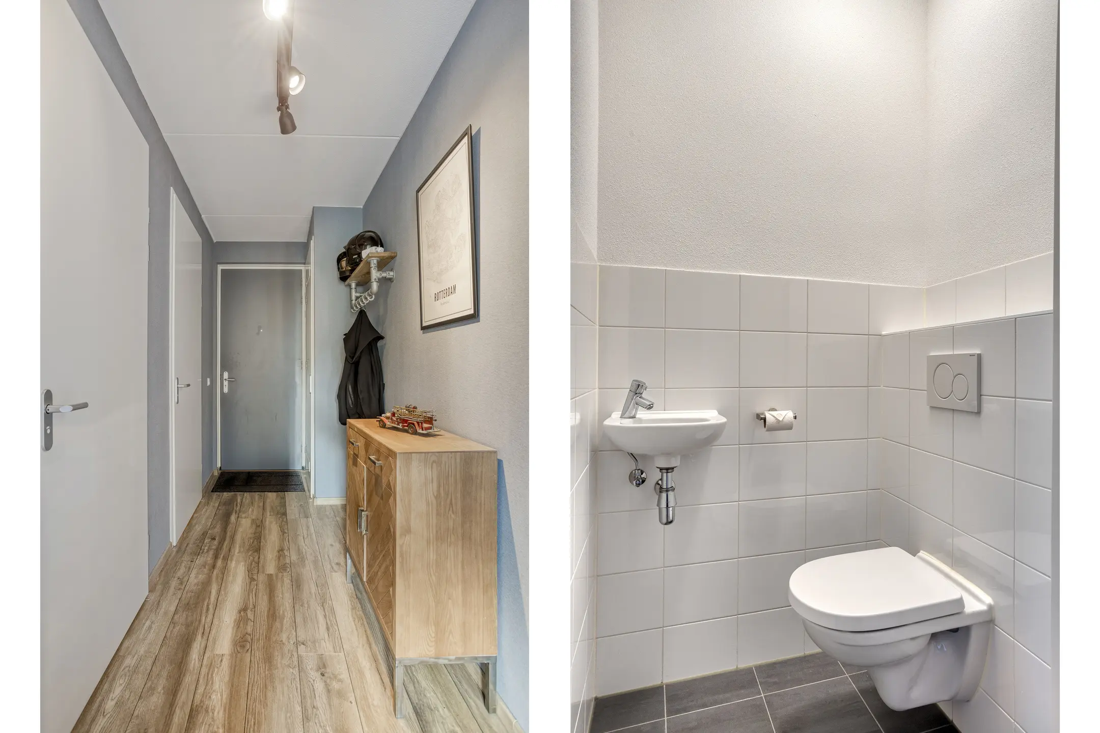 Entree, hal, meterkast, fraai afgewerkte toiletruimte voorzien van een hangend toilet en fonteintje. De toiletruimte is gedeeltelijk betegeld in een lichte kleurstelling. Toegang tot alle vertrekken.