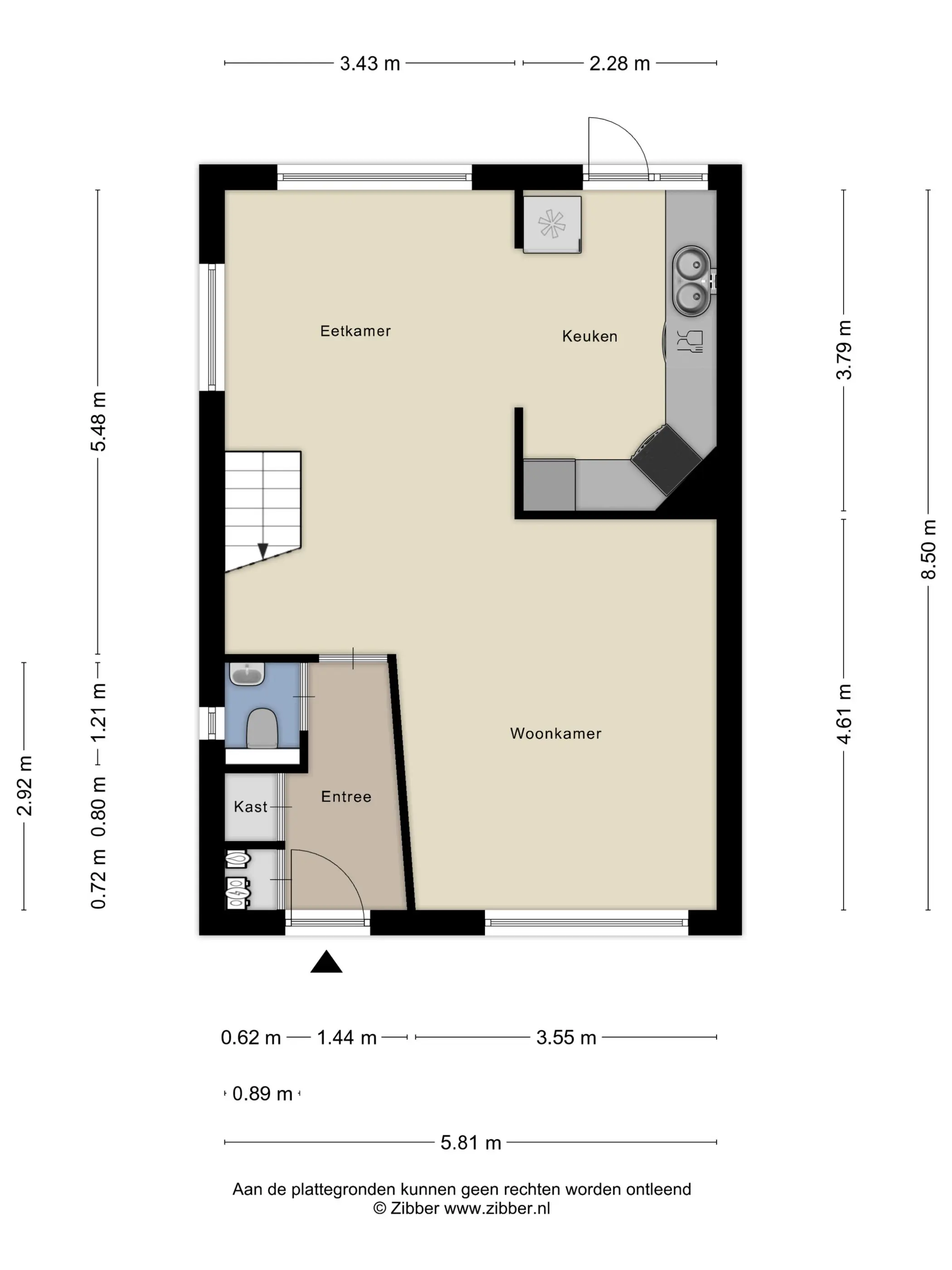 Via de voortuin loop je naar de voordeur waarachter je binnenkomt in de ruime hal met de meterkast, een bergkast met de verdeler van de vloerverwarming, het toilet en er is ruimte voor de jassen.
