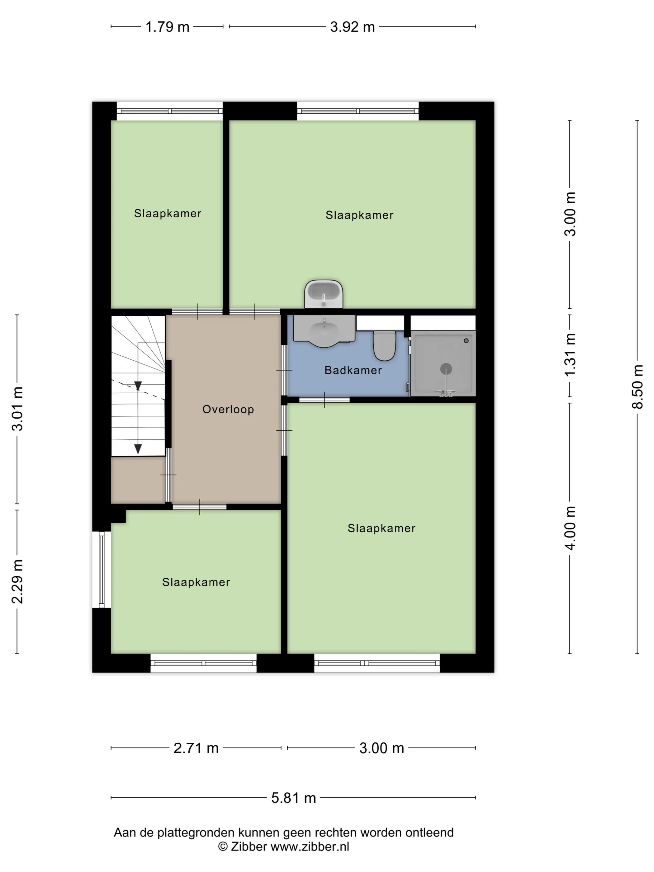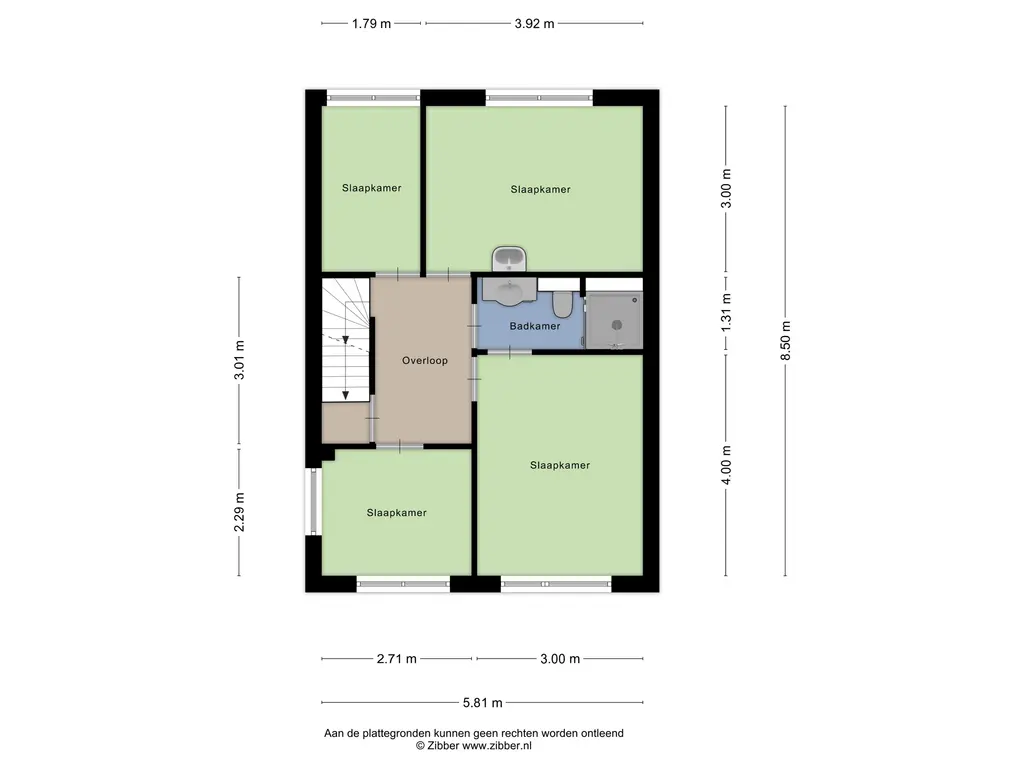 Terug in de woonkamer lopen we in het midden via de open trap naar de eerste verdieping. Daar treffen we vier slaapkamers, ideaal voor een groot gezin of werkplekken aan huis. De kamers zijn respectievelijk 12, 12, 6 en 5 m2. Fijne lichte kamers waarbij 1 van de kamers aan de voorzijde ook over een zijraam beschikt.
