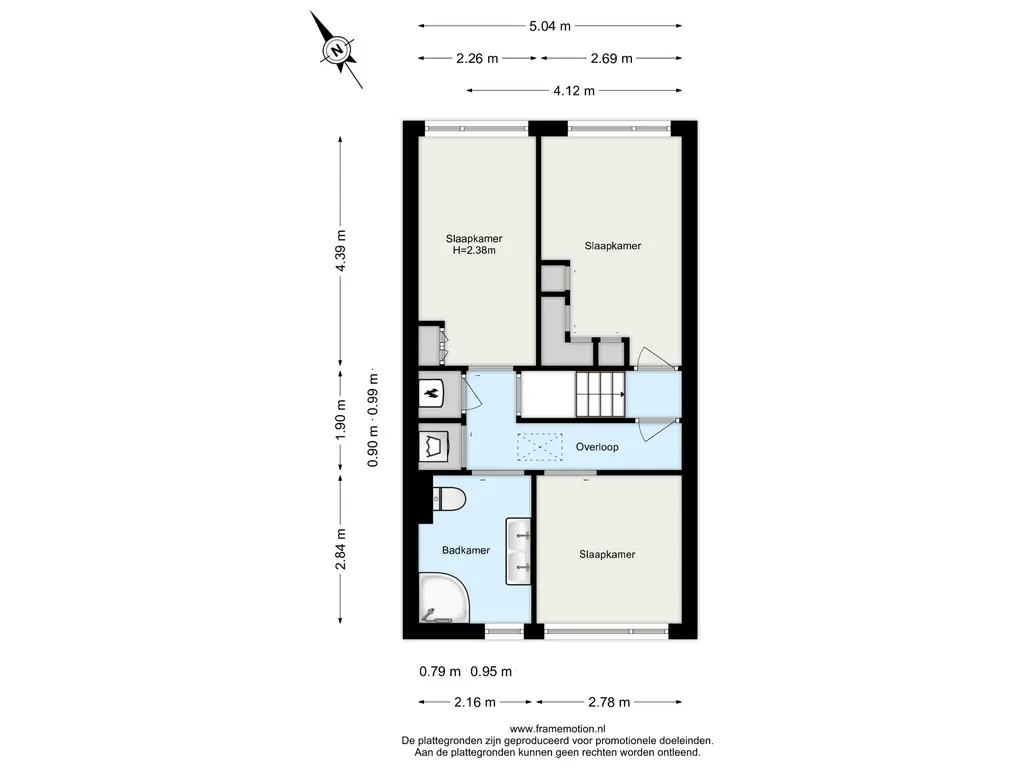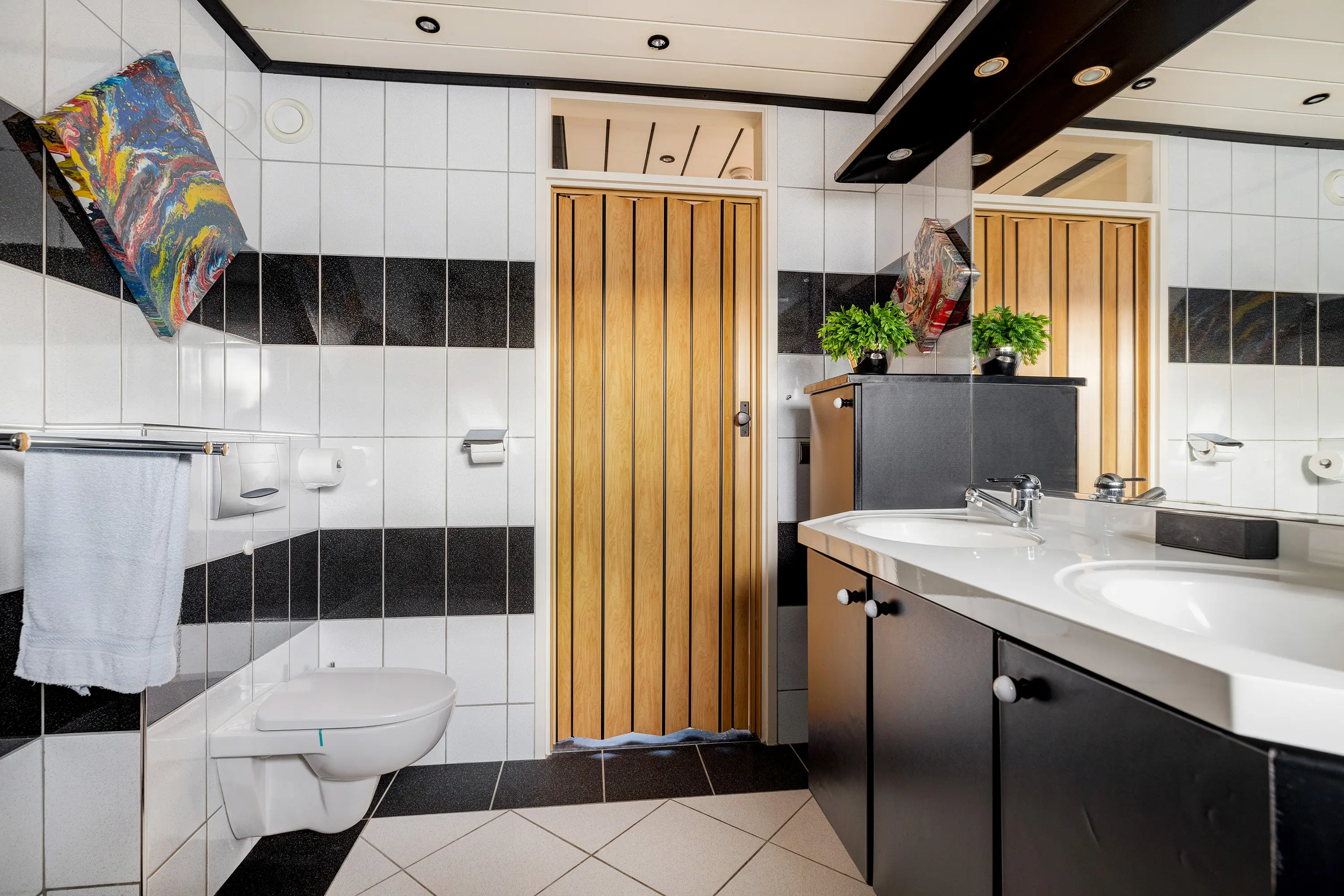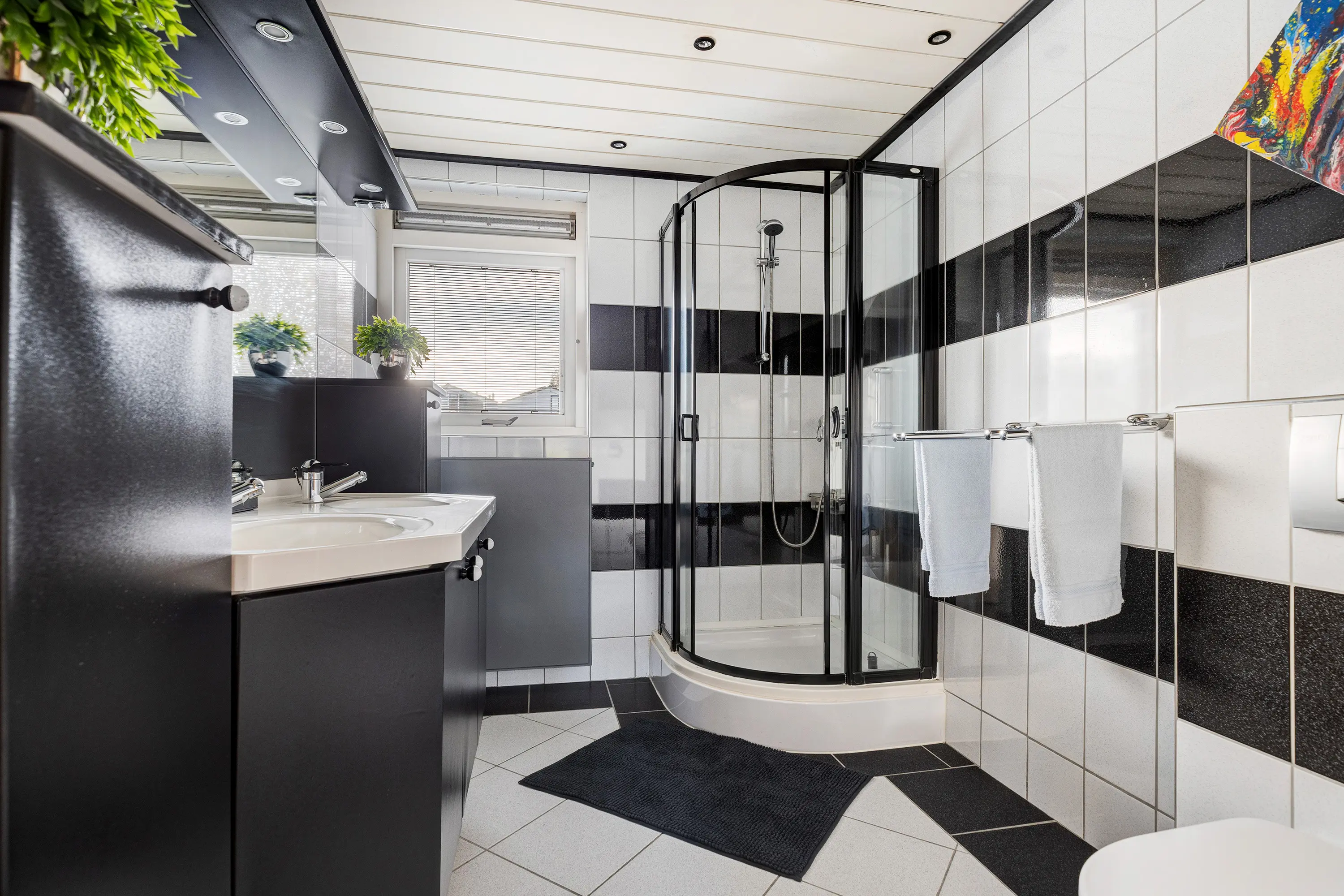 De ruime badkamer is voorzien van een douchecabine, een grote wastafel en een toilet. De twee andere slaapkamers zijn gelegen aan de voorzijde van de woning.