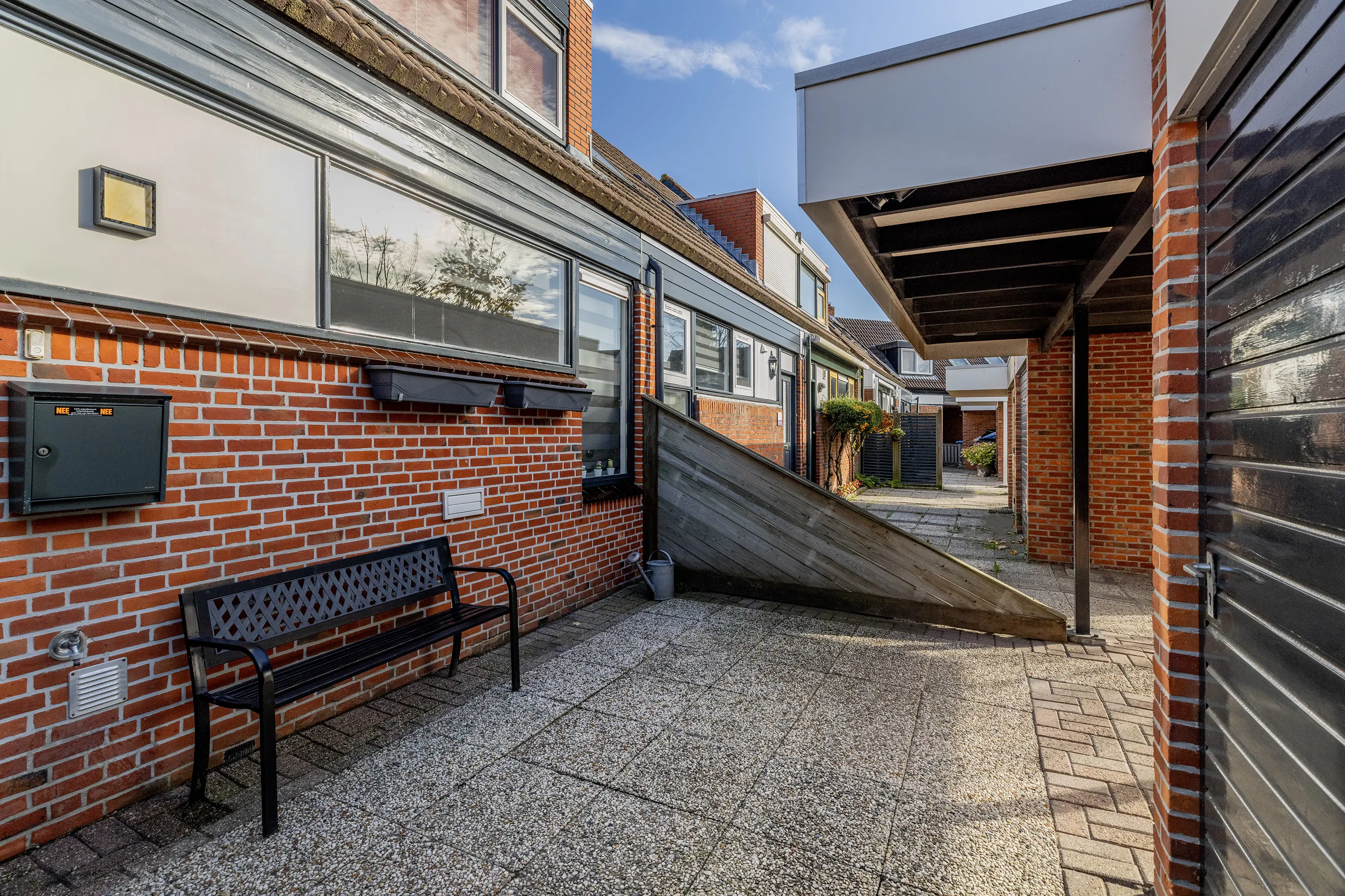 Aan de voorzijde van de woning bevinden zich de carport en een stenen berging met lichtkoepel, die voldoende ruimte biedt voor fietsen en extra opslag. De woning is voorzien van houten kozijnen. Het warme water komt via een 80 liter boiler die slechts één jaar oud is. De aansluiting voor de wasmachine is ook in een vaste kast te vinden.