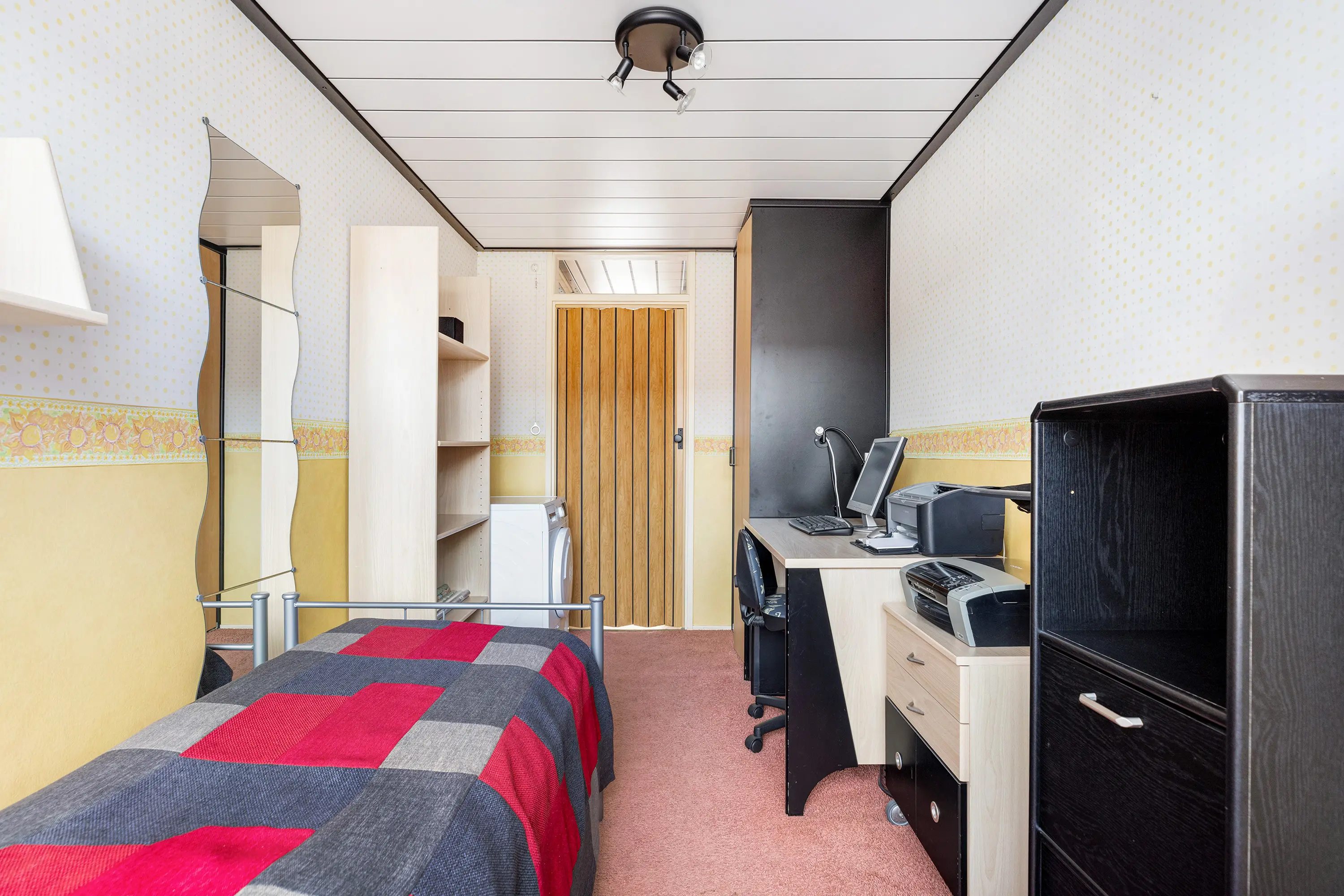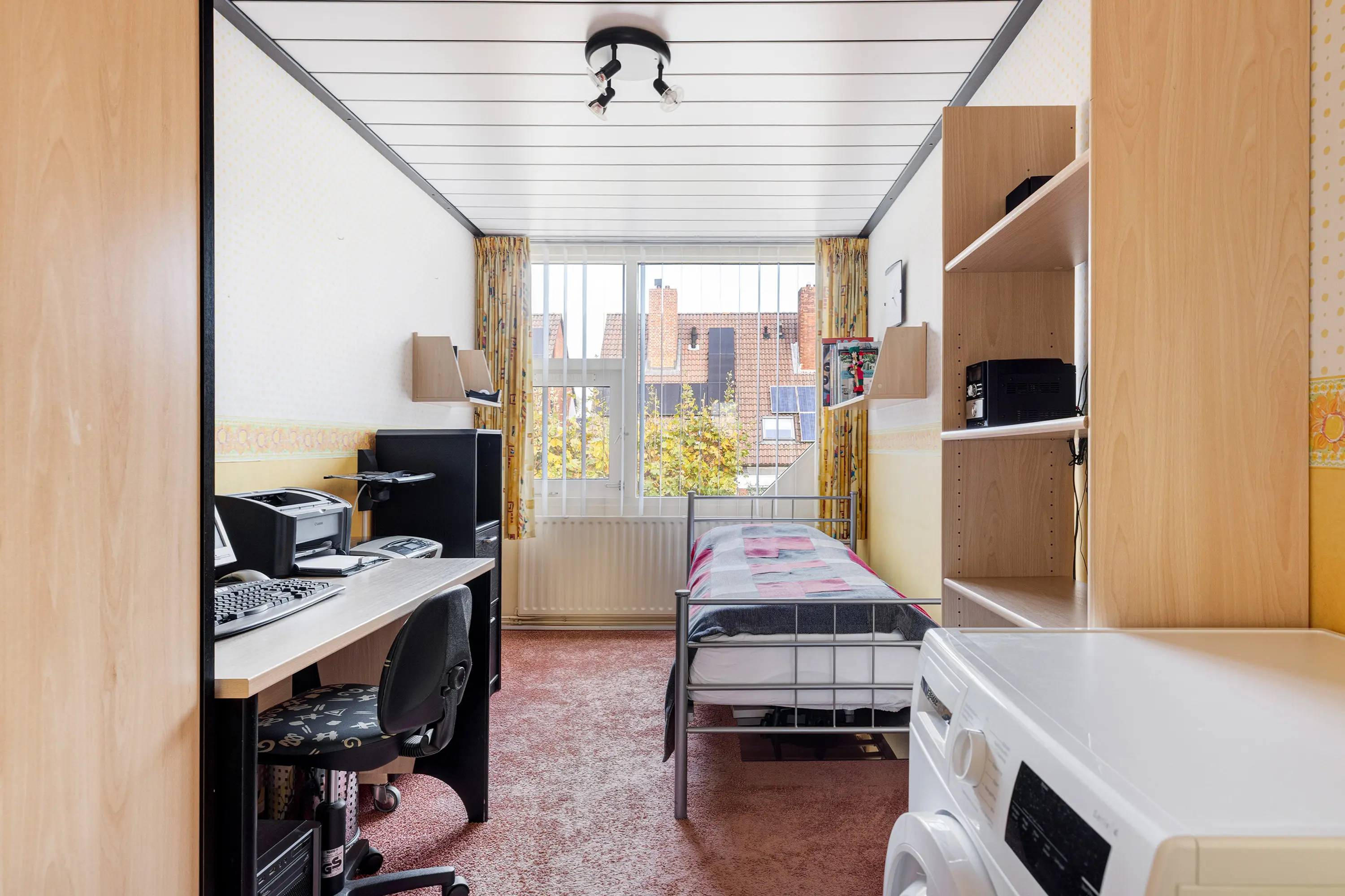 Via de open trap is de eerste verdieping bereikbaar. Door de dakkapel is deze verdieping extra ruim en beschikt de woning over drie grote slaapkamers. De ouderslaapkamer ligt aan de achterzijde van de woning en beschikt over een vaste kast in hoekopstelling.