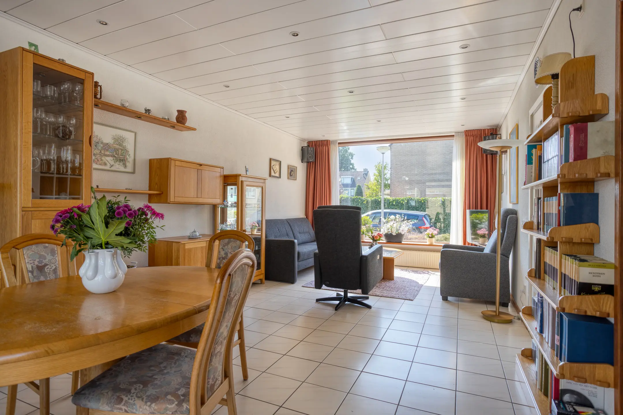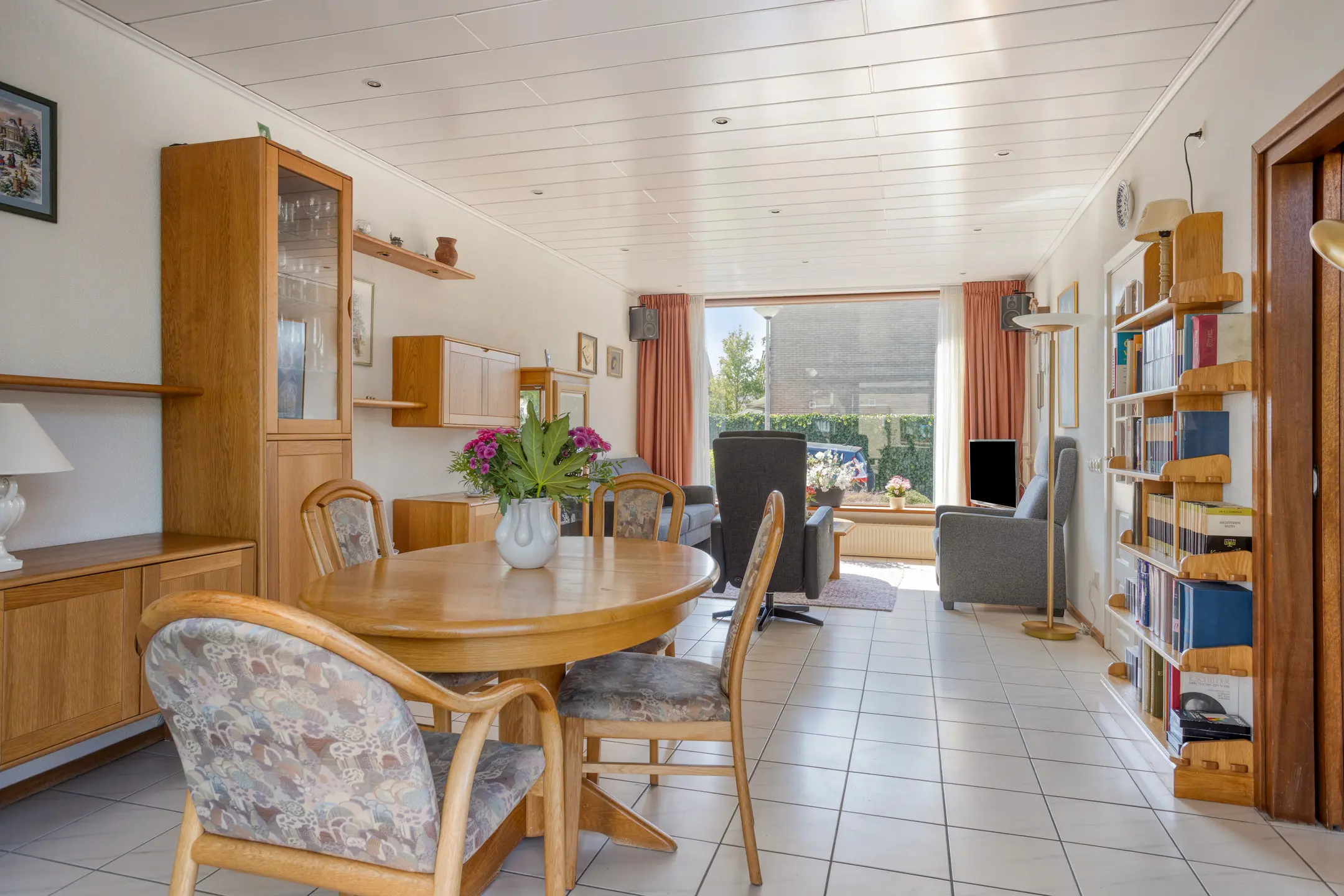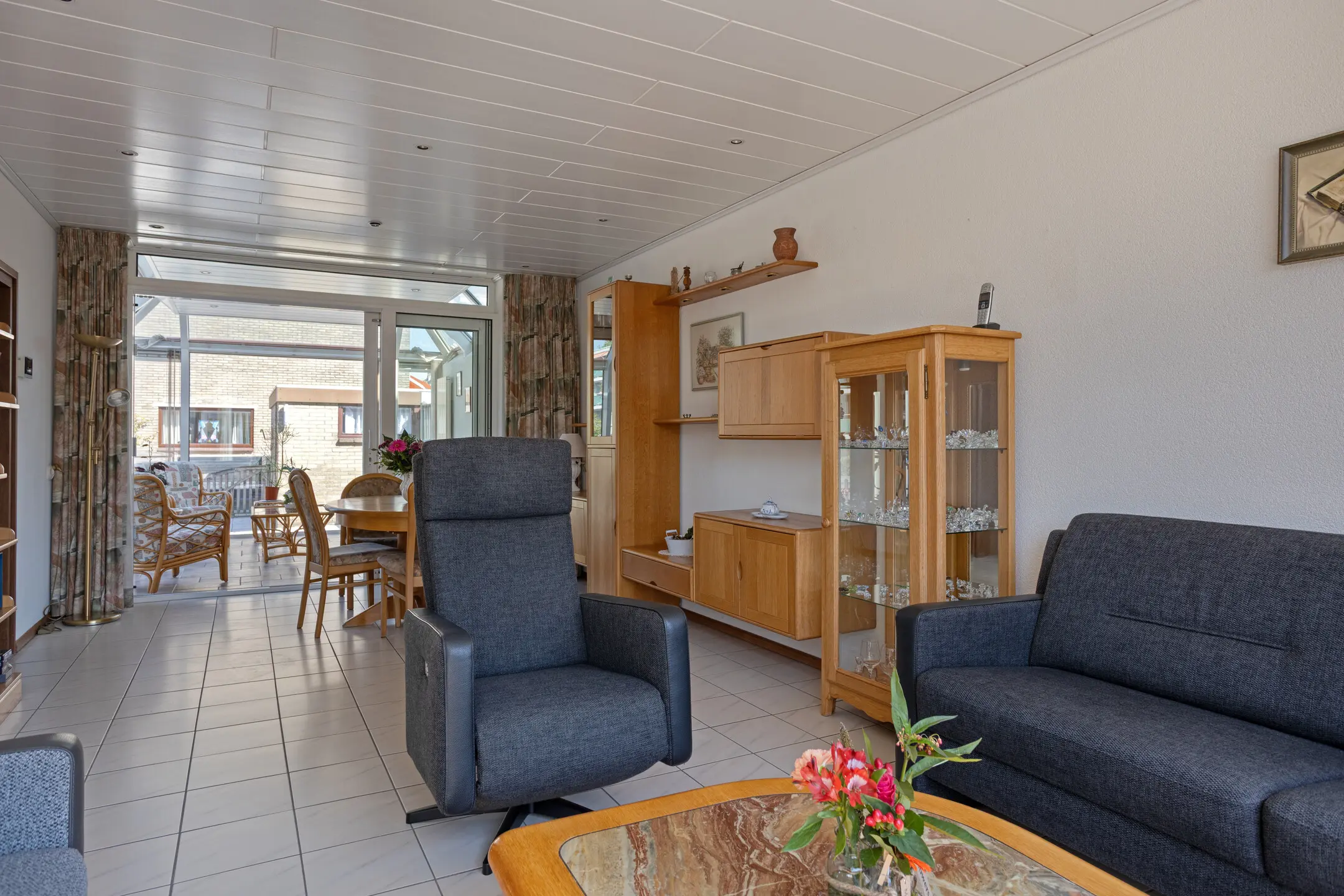 Doorzon woonkamer (ca. 25 m2) voorzien van een lichte tegelvloer met vloerverwarming, voorzien van spotjes. Door de grote raampartij biedt de woonkamer een aangename natuurlijke lichtinval. De woonkamer is ruim van opzet en biedt voldoende plaats voor zowel een comfortabele zithoek als een gezellige eethoek. Middels een aluminium schuifpui heeft u toegang tot de serre.