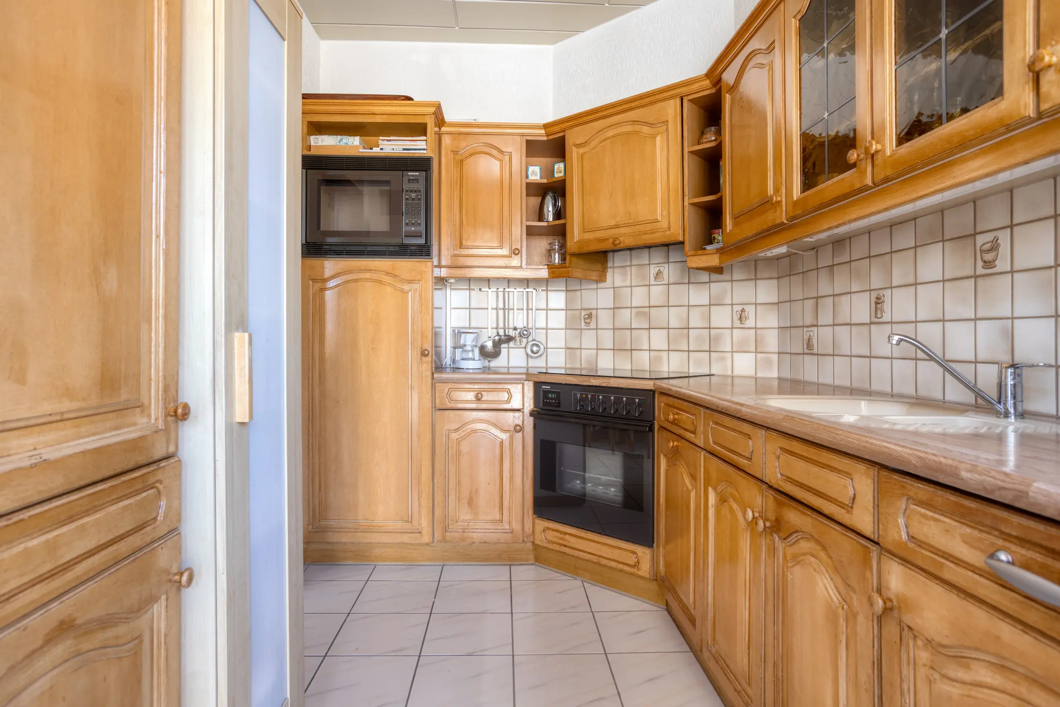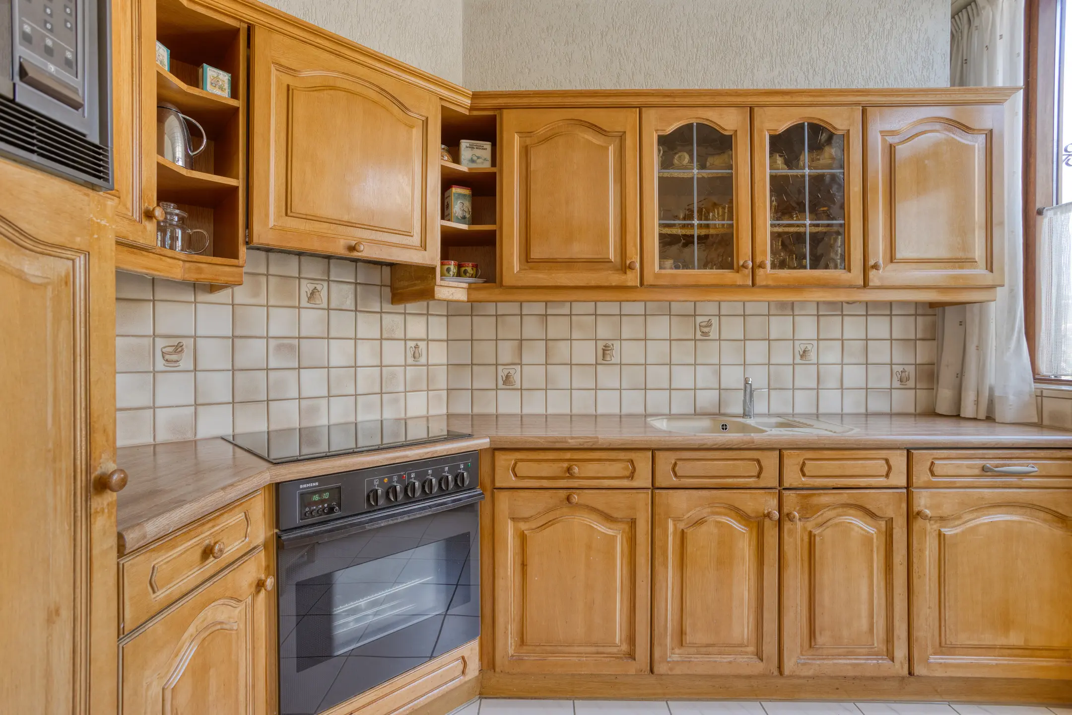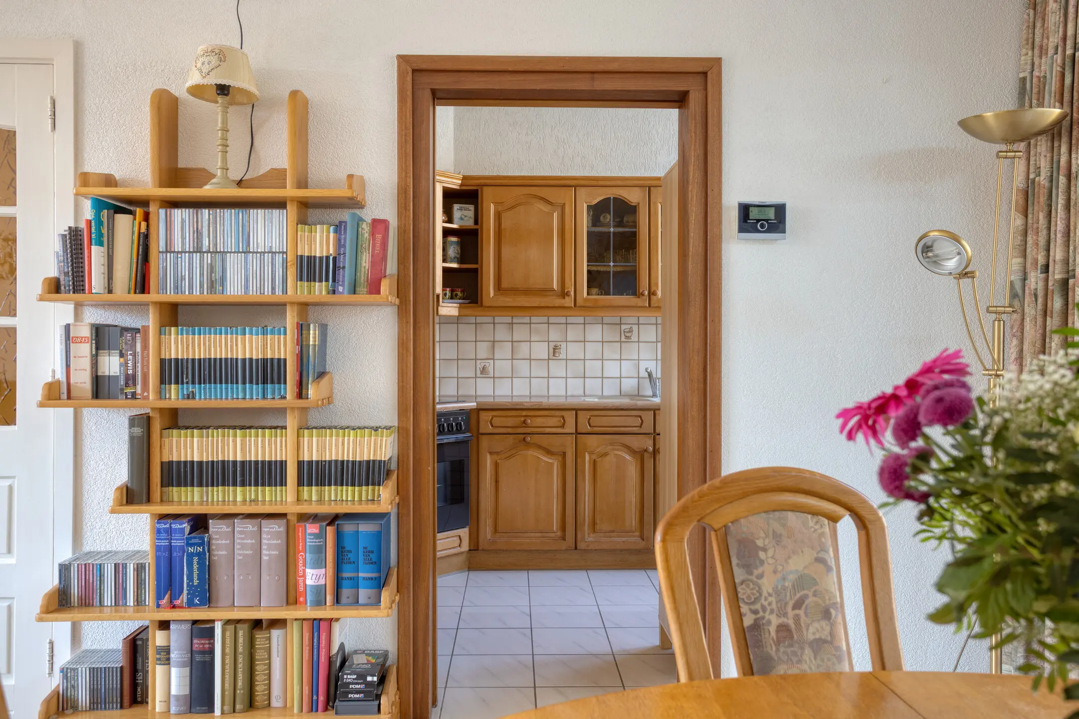 De halfopen keuken (ca. 6 m2) is uitgevoerd in een L-opstelling en gelegen aan de achterzijde van de woning. De keuken is voorzien van een 1,5 spoelbak, close-in boiler, koelkast met vriesvakje, elektrische kookplaat, afzuigkap, oven, magnetron en een vaatwasser. Het geheel is afgewerkt met een kunststof aanrechtblad, wandtegels en vloertegels met vloerverwarming. Middels een loopdeur met hor heeft u ook toegang tot de achtertuin.
