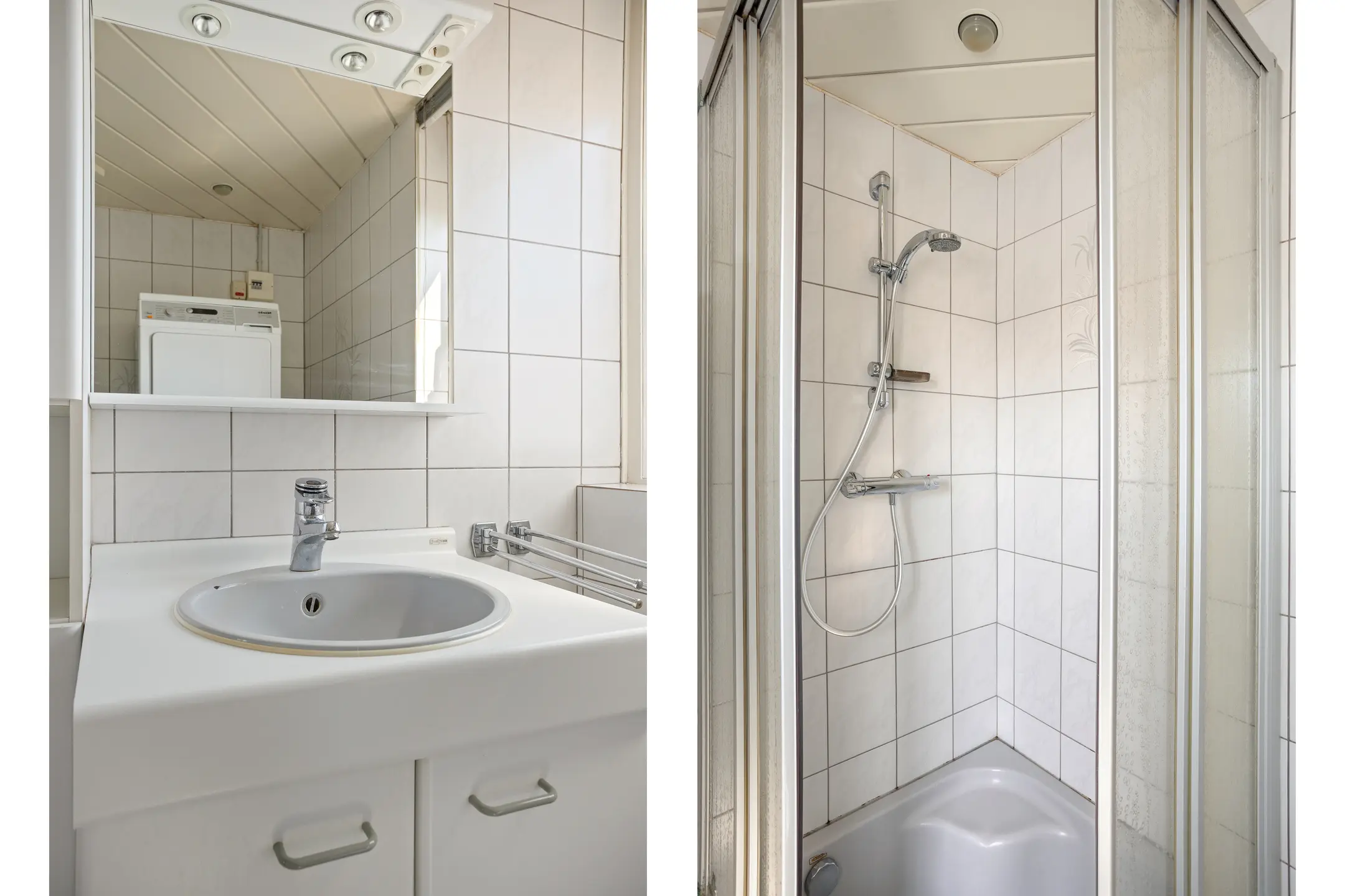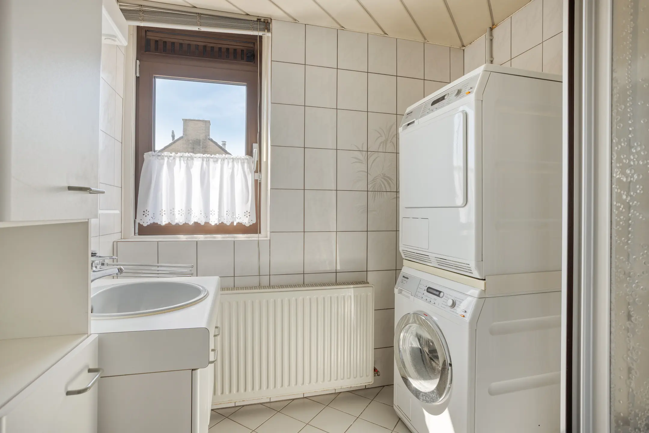 Nette badkamer (ca. 4 m2) met sanitaire voorzieningen zoals een wastafel met wastafelmeubel en een extra vaste kast, spiegel, douchecabine en wasmachine– en droger aansluiting. De badkamer is geheel betegeld in een lichte kleurstelling.
