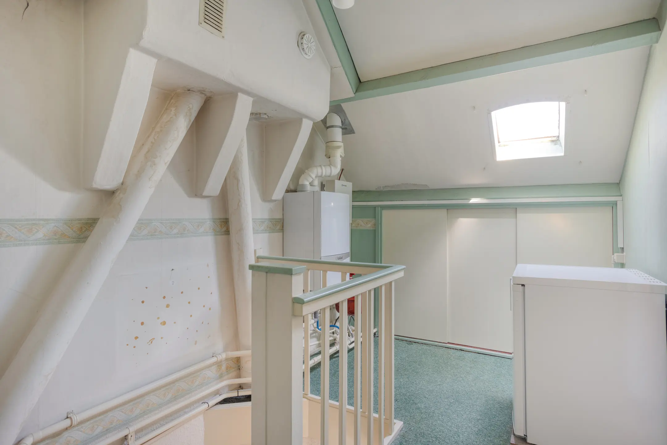 Voorzolder met opstelplaats voor de HR C.V. combiketel (Vaillant 2012), mechanische ventilatie, een dakraampje en bergruimte achter het knieschot.