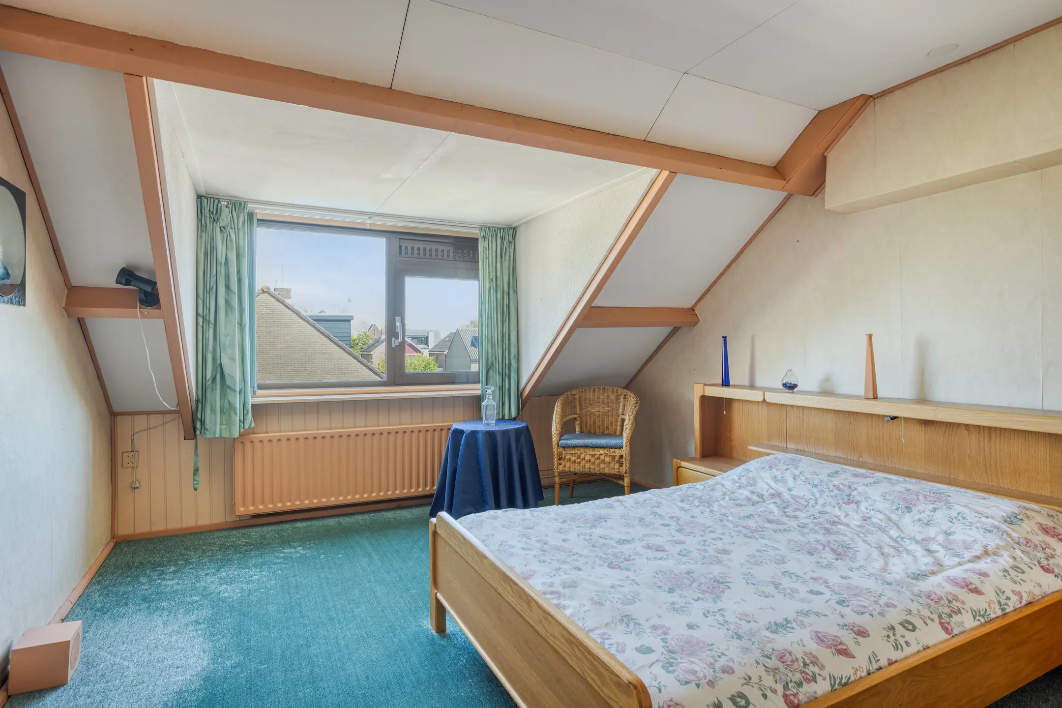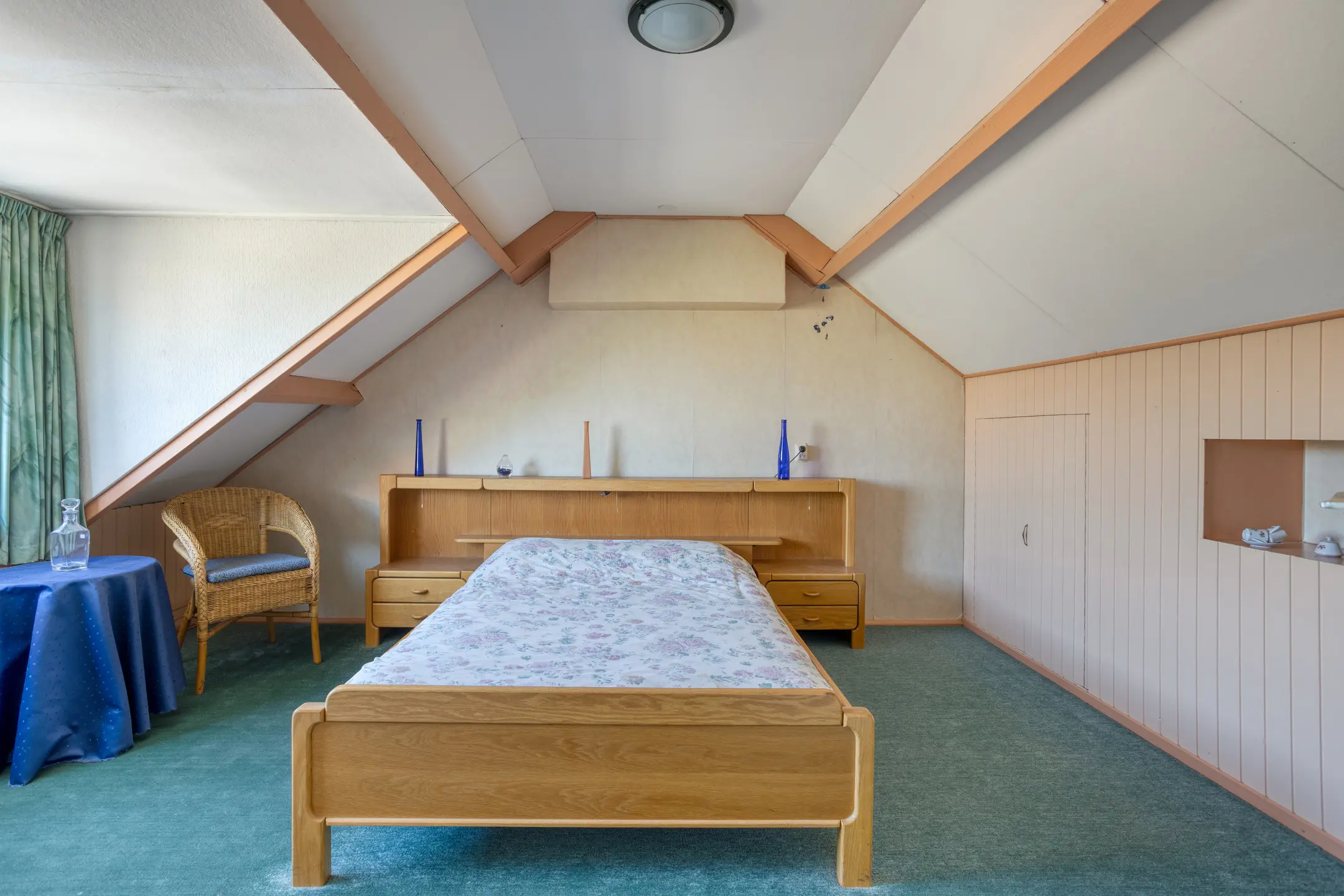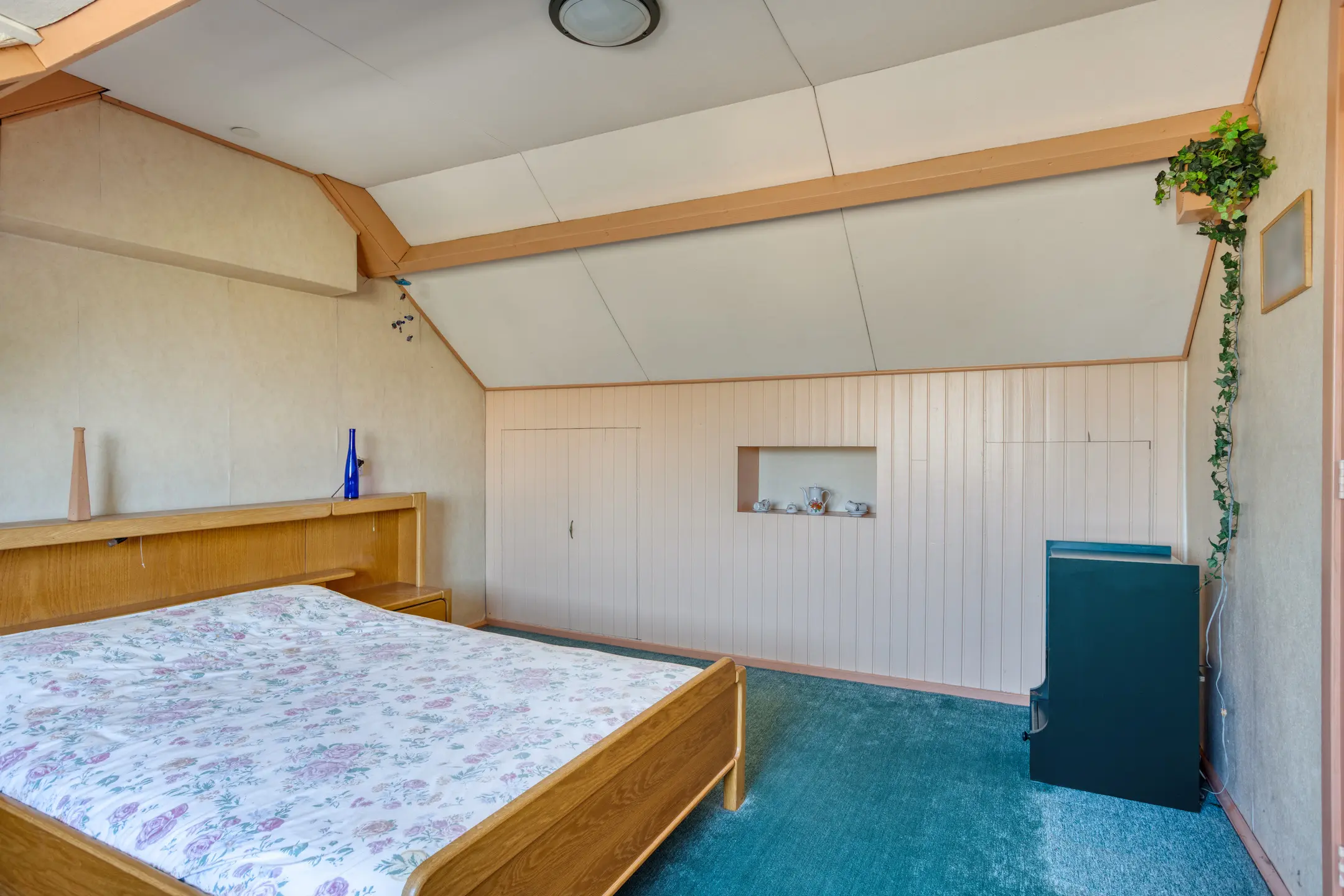 Slaapkamer 4 (ca. 16 m2) beschikt over een dakkapel aan de achterzijde van de woning, vloerbedekking, behang en bergruimte achter het knieschot.