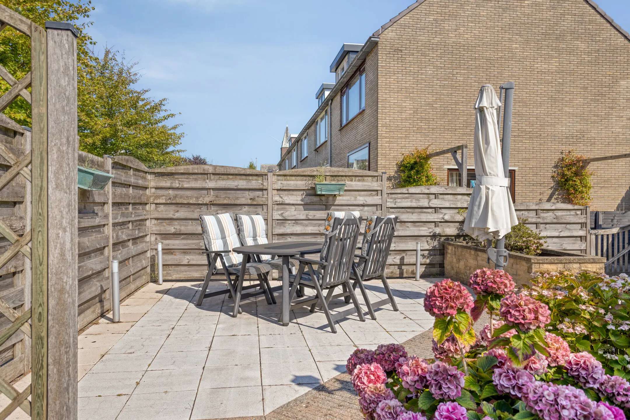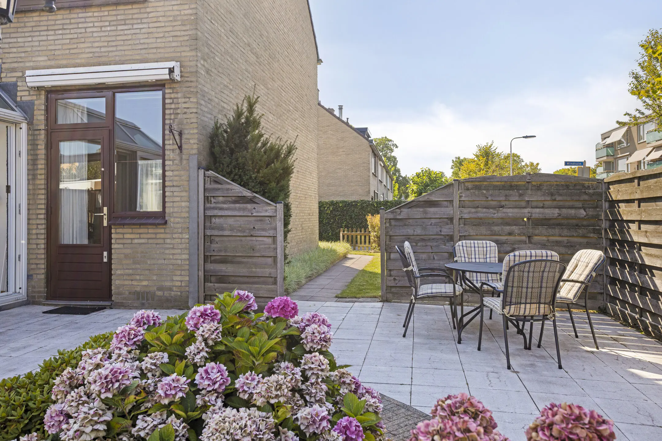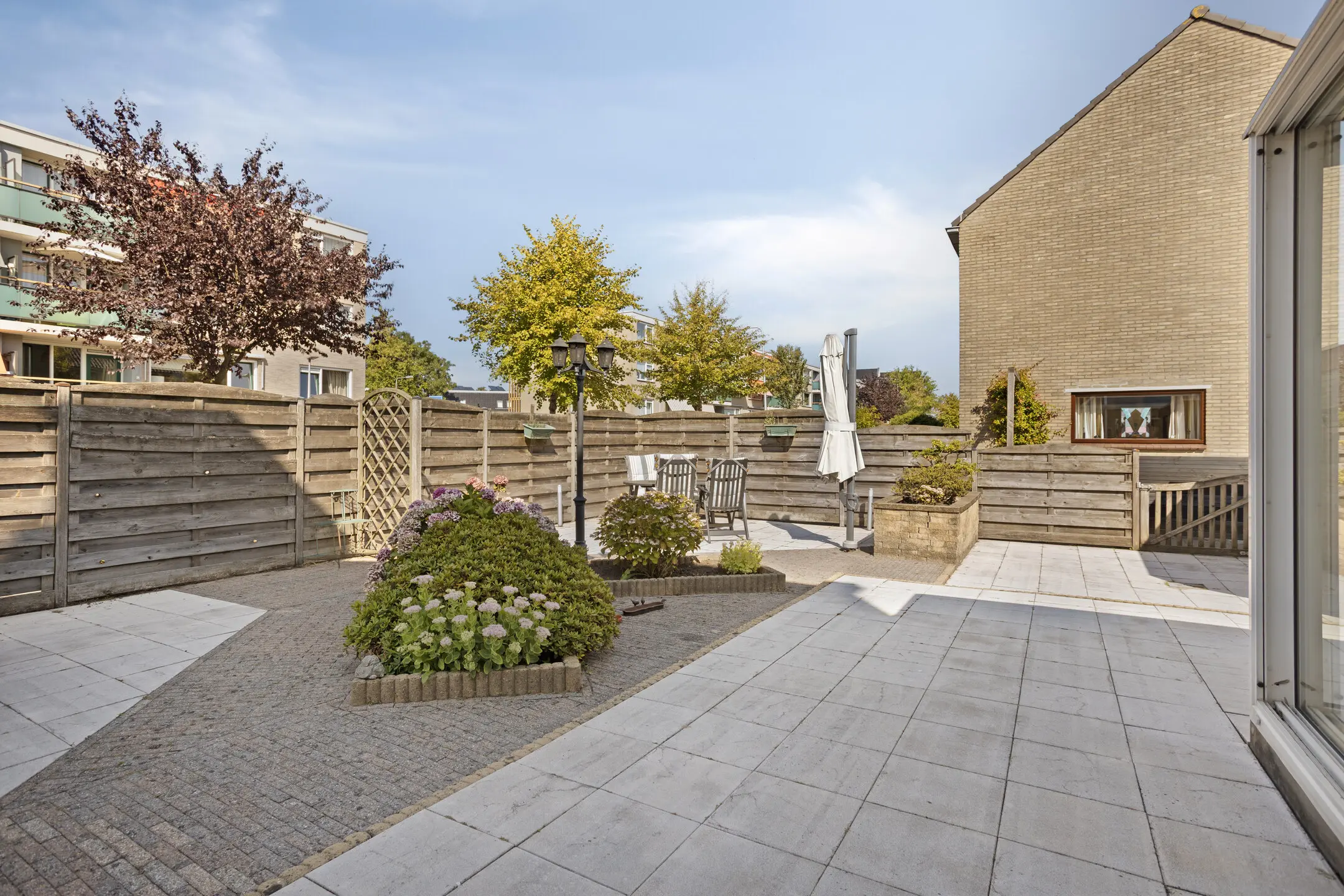 De ruime achtertuin is fraai aangelegd met verschillende terrassen en sierbeplating. Verder beschikt de achtertuin over achterom, verlichting, elektrisch bedienbaar zonnescherm aan de keuken kant en een berging.