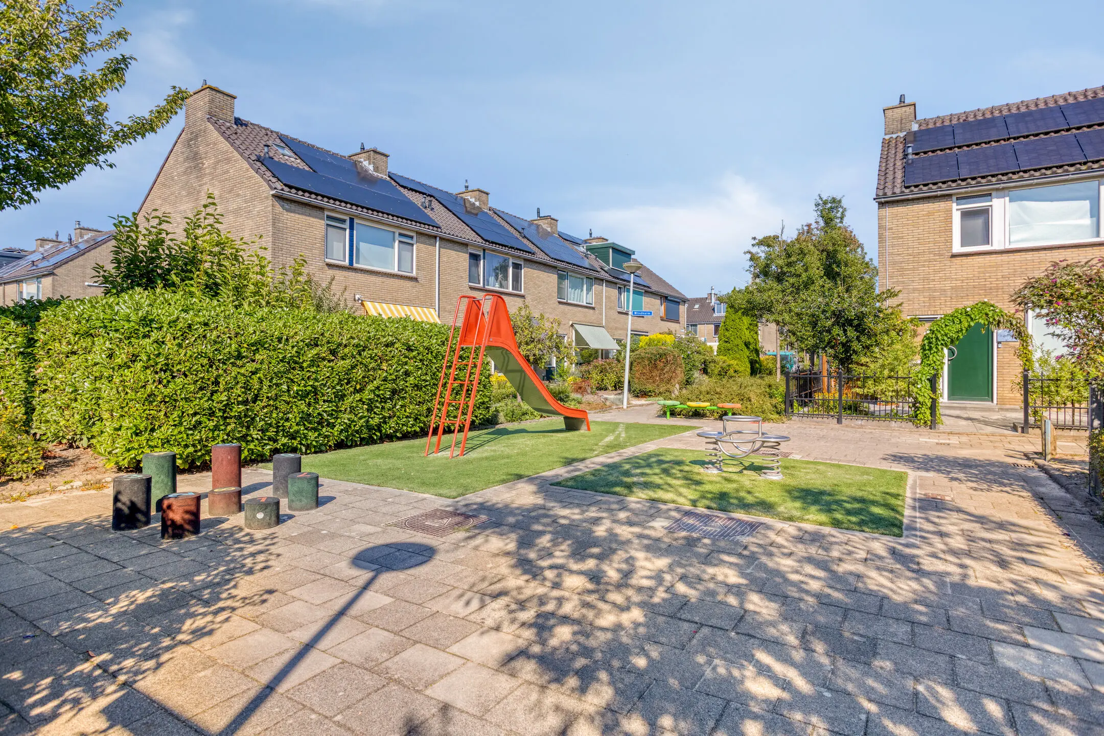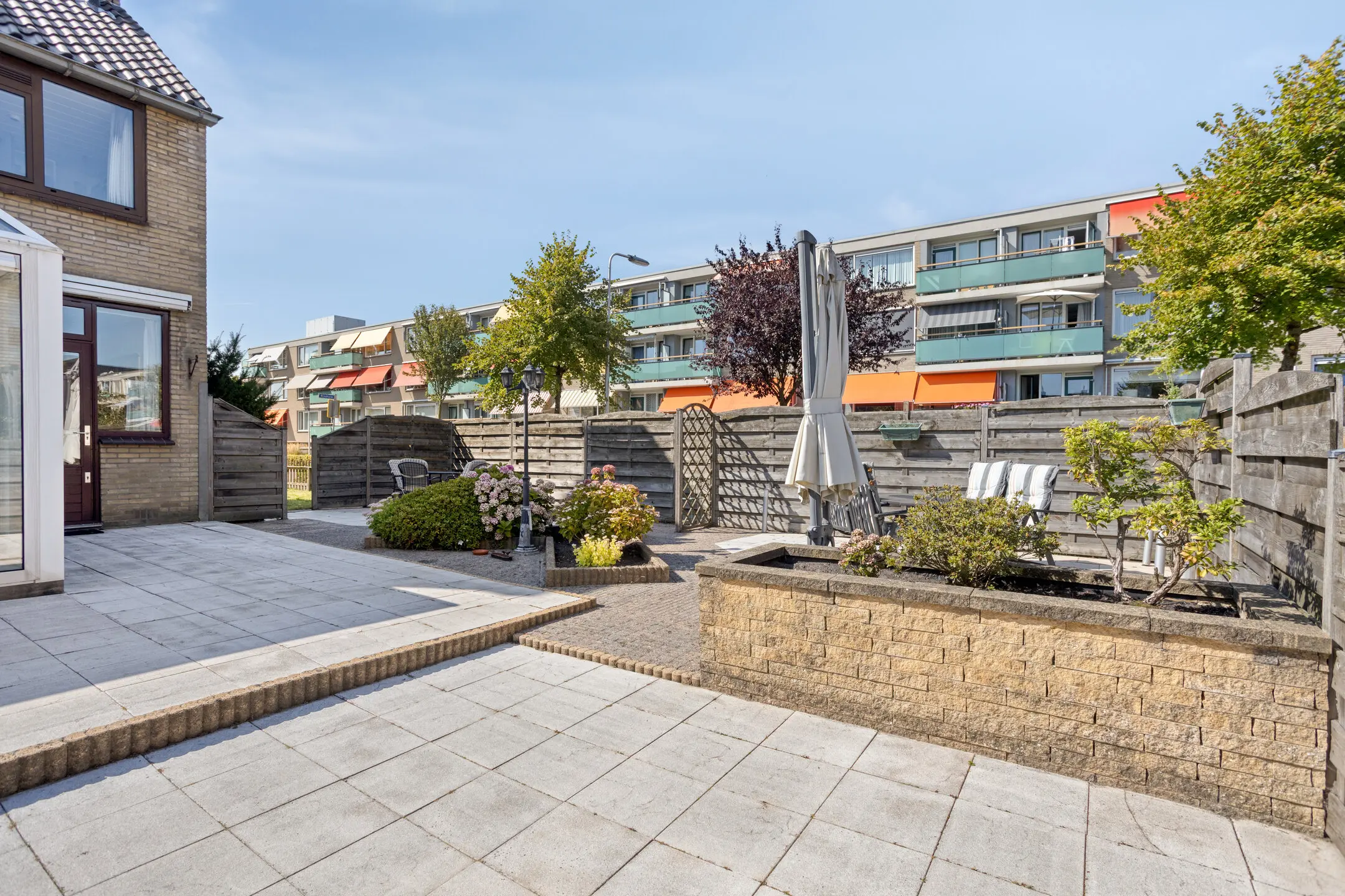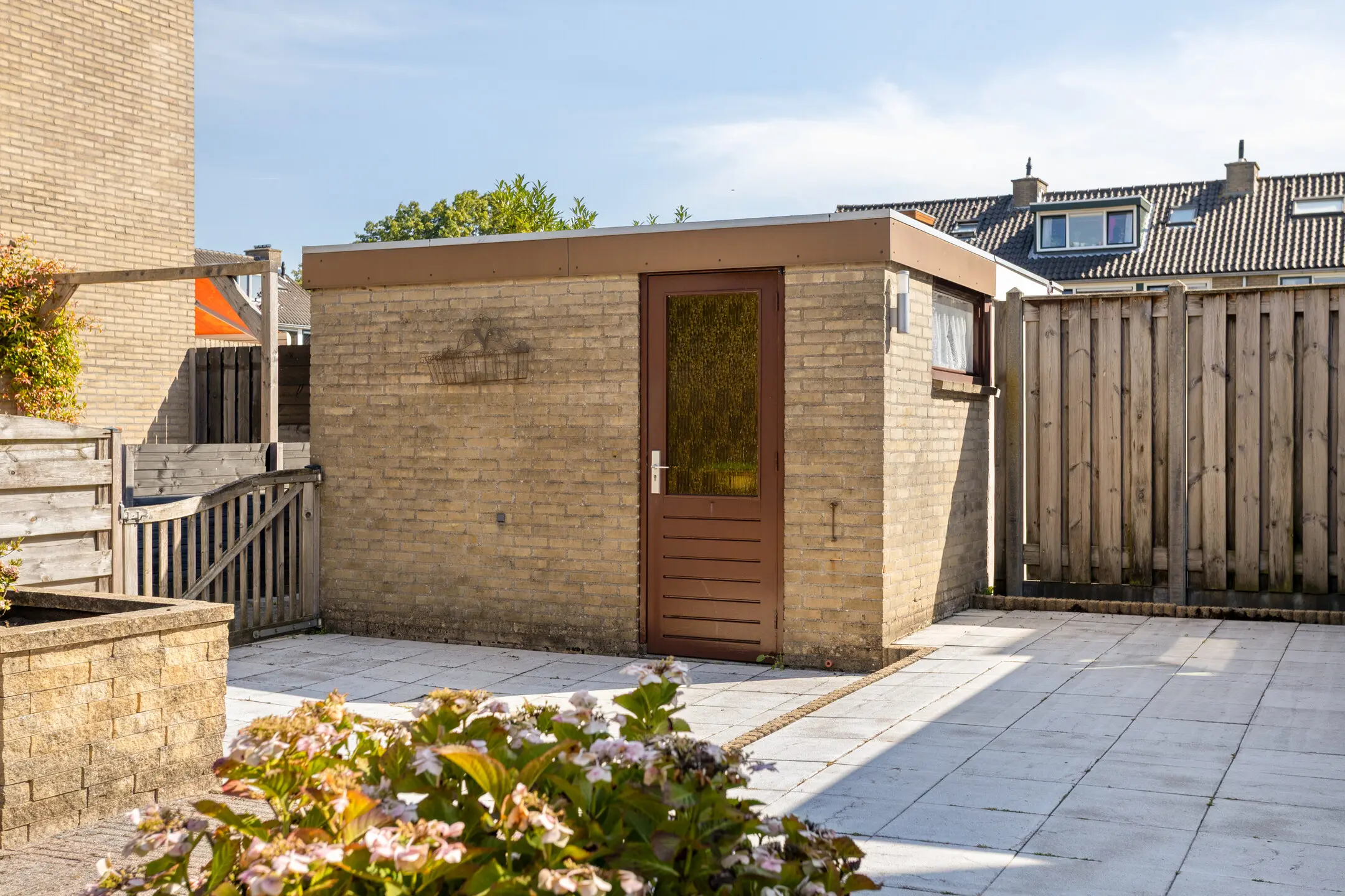 De ruime achtertuin is fraai aangelegd met verschillende terrassen en sierbeplating. Verder beschikt de achtertuin over achterom, verlichting, elektrisch bedienbaar zonnescherm aan de keuken kant en een berging.