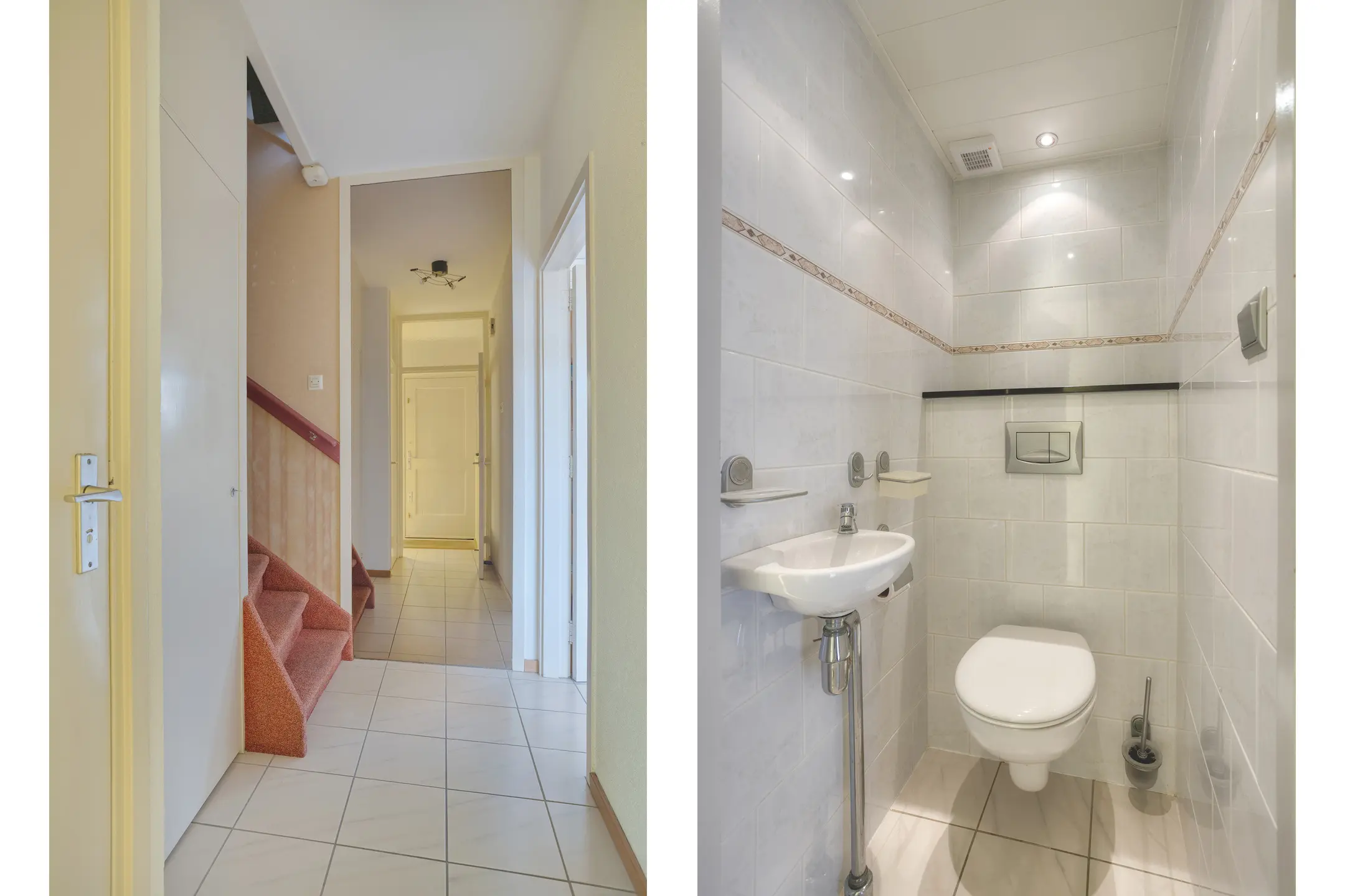 Entree, tochtportaal, hal met meterkast, trapkast, trap naar de 1e verdieping, toiletruimte voorzien van een hangend toilet en fonteintje. De toiletruimte is geheel betegeld in een lichte kleurstelling en afgewerkt met spotjes.