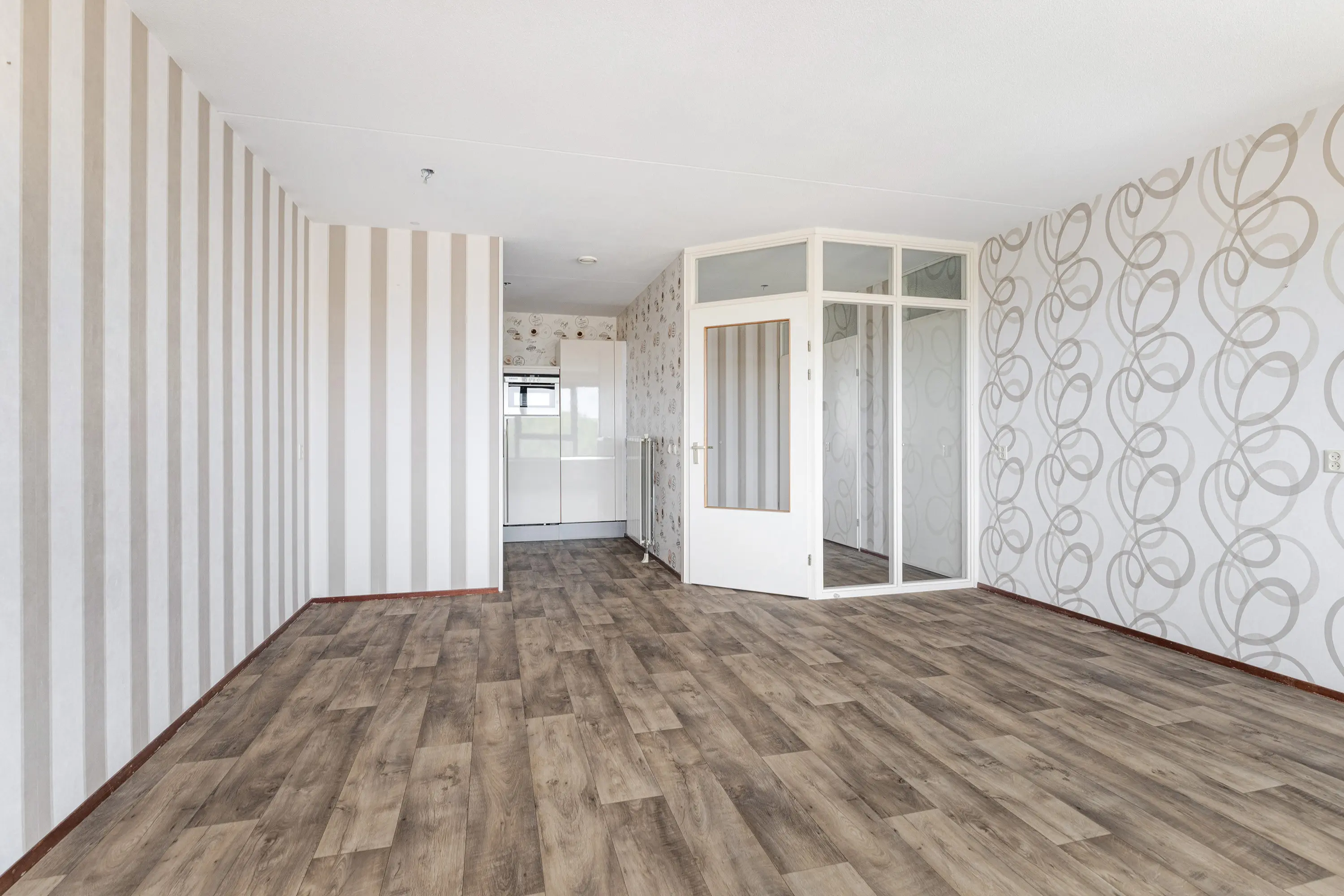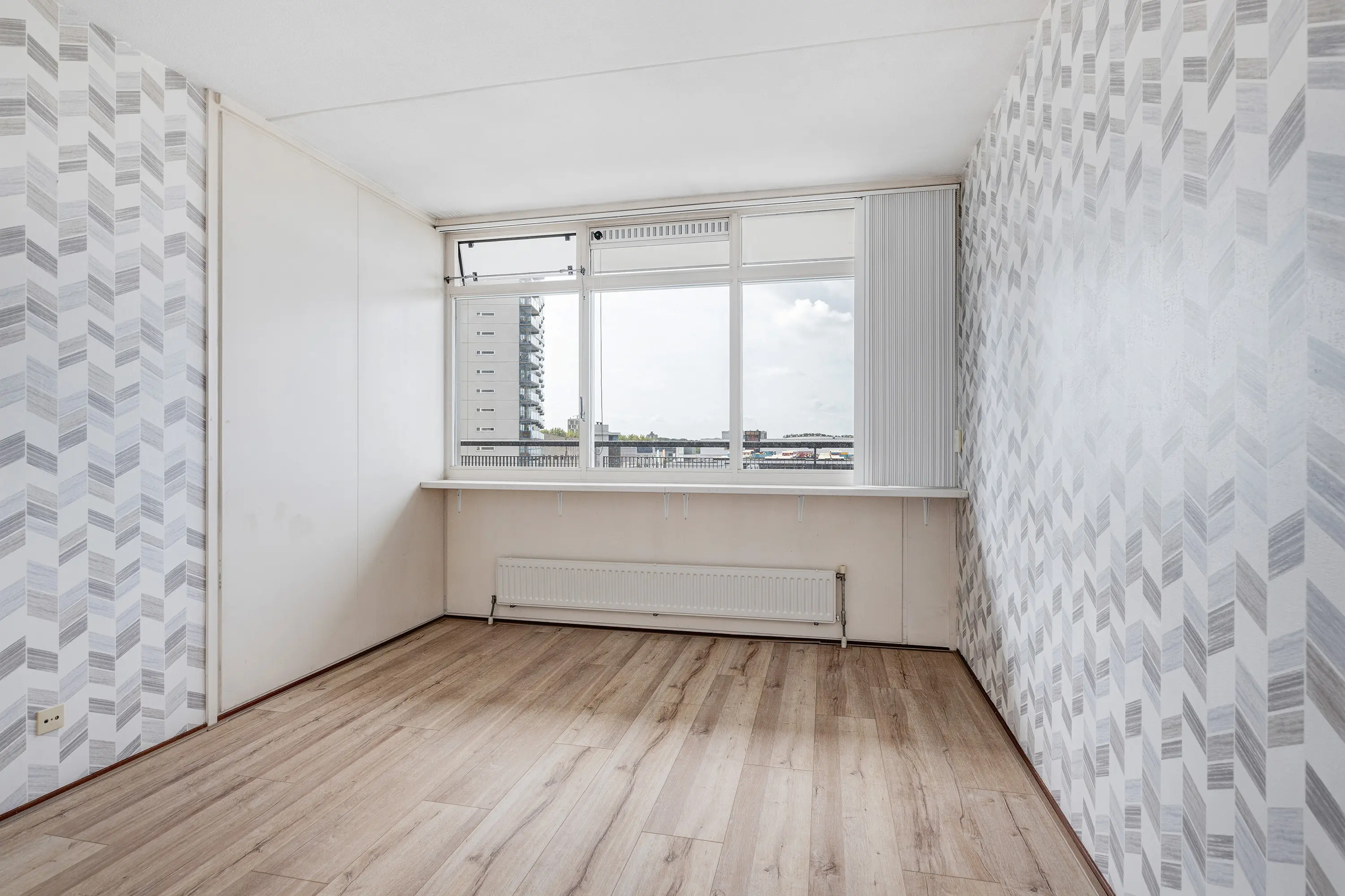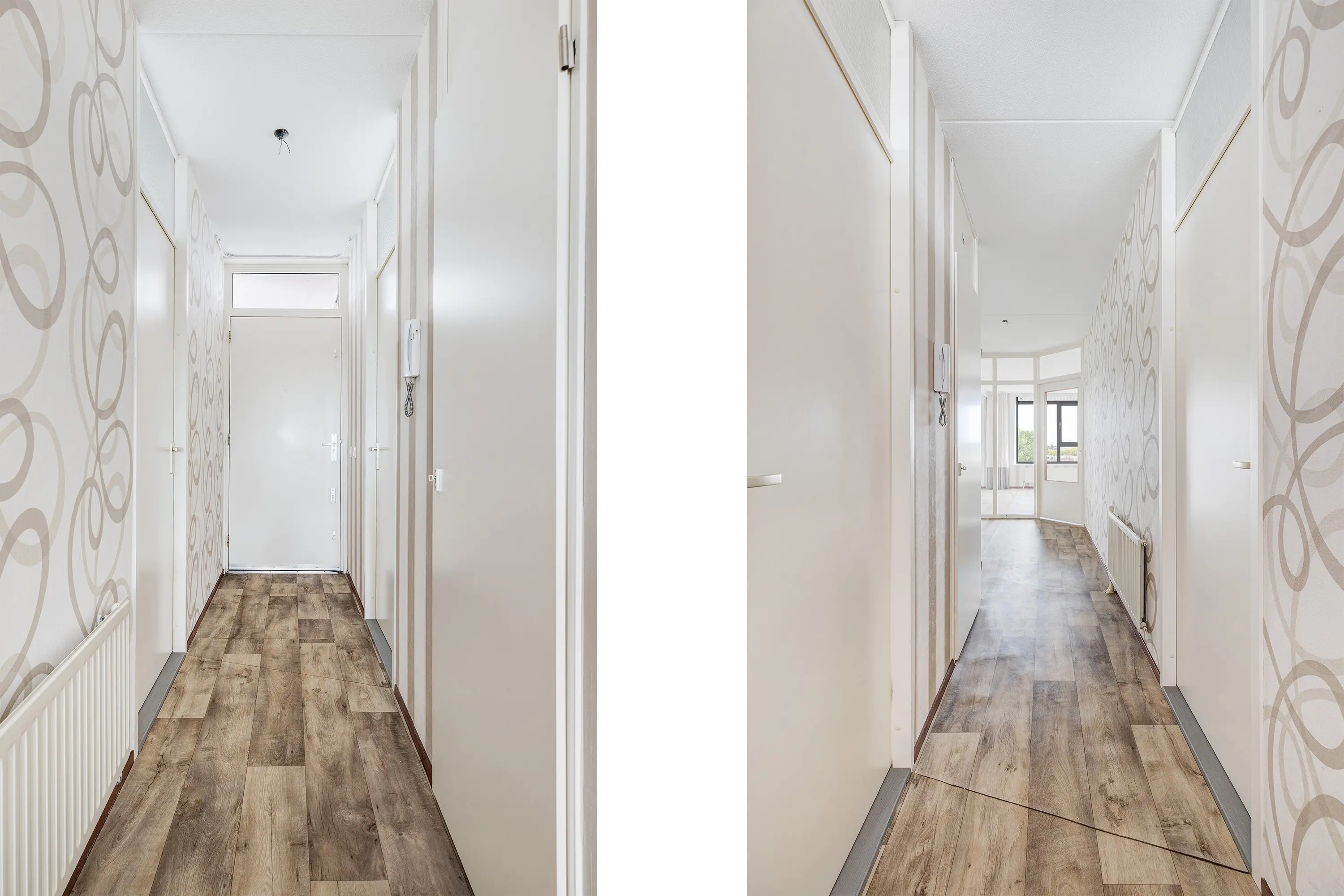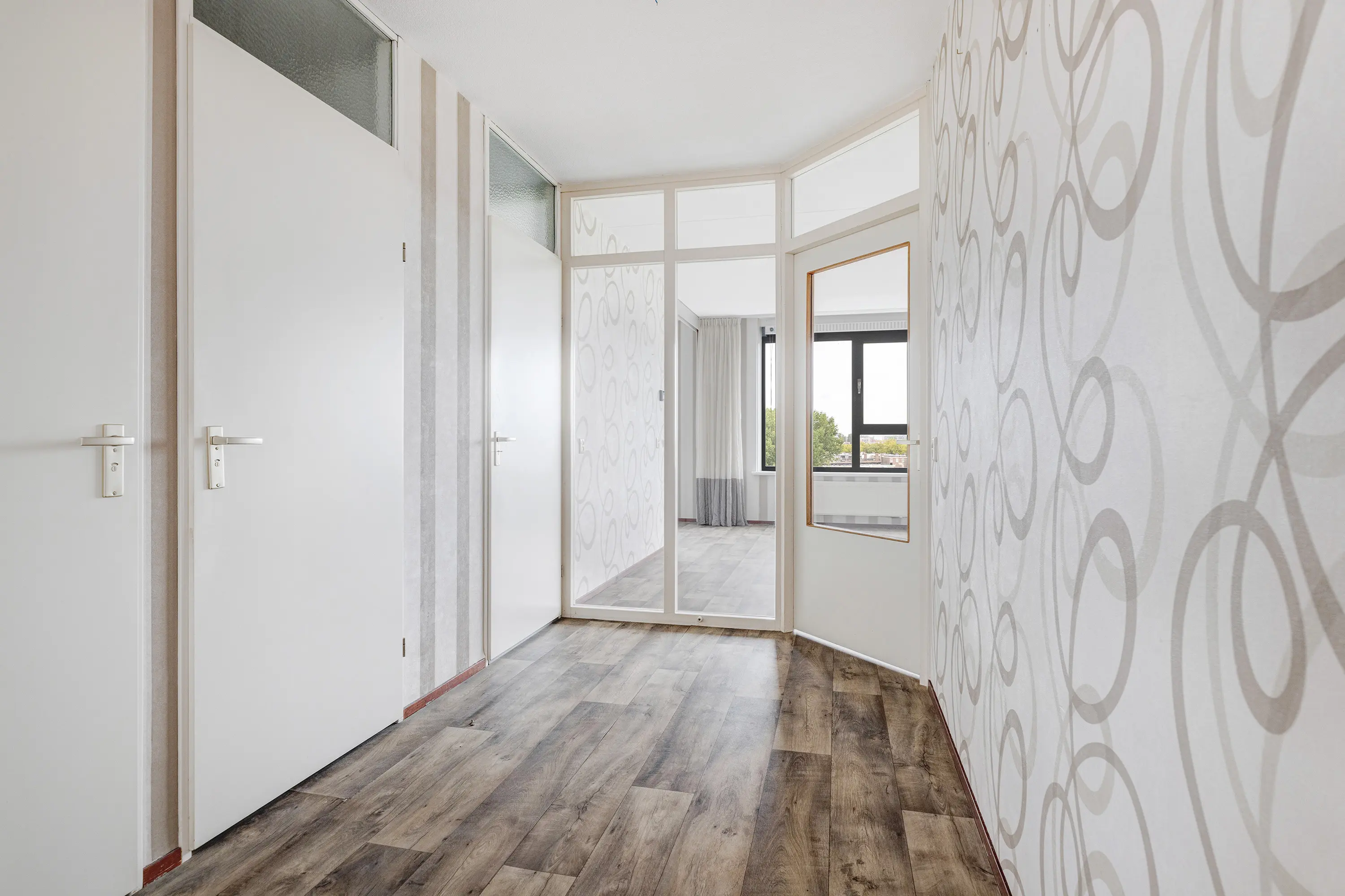 Naast de woonkamer bevinden zich twee slaapkamers aan de galerijzijde, beide afgewerkt met een laminaatvloer en ideale ruimtes voor slaap- of studeervertrekken.