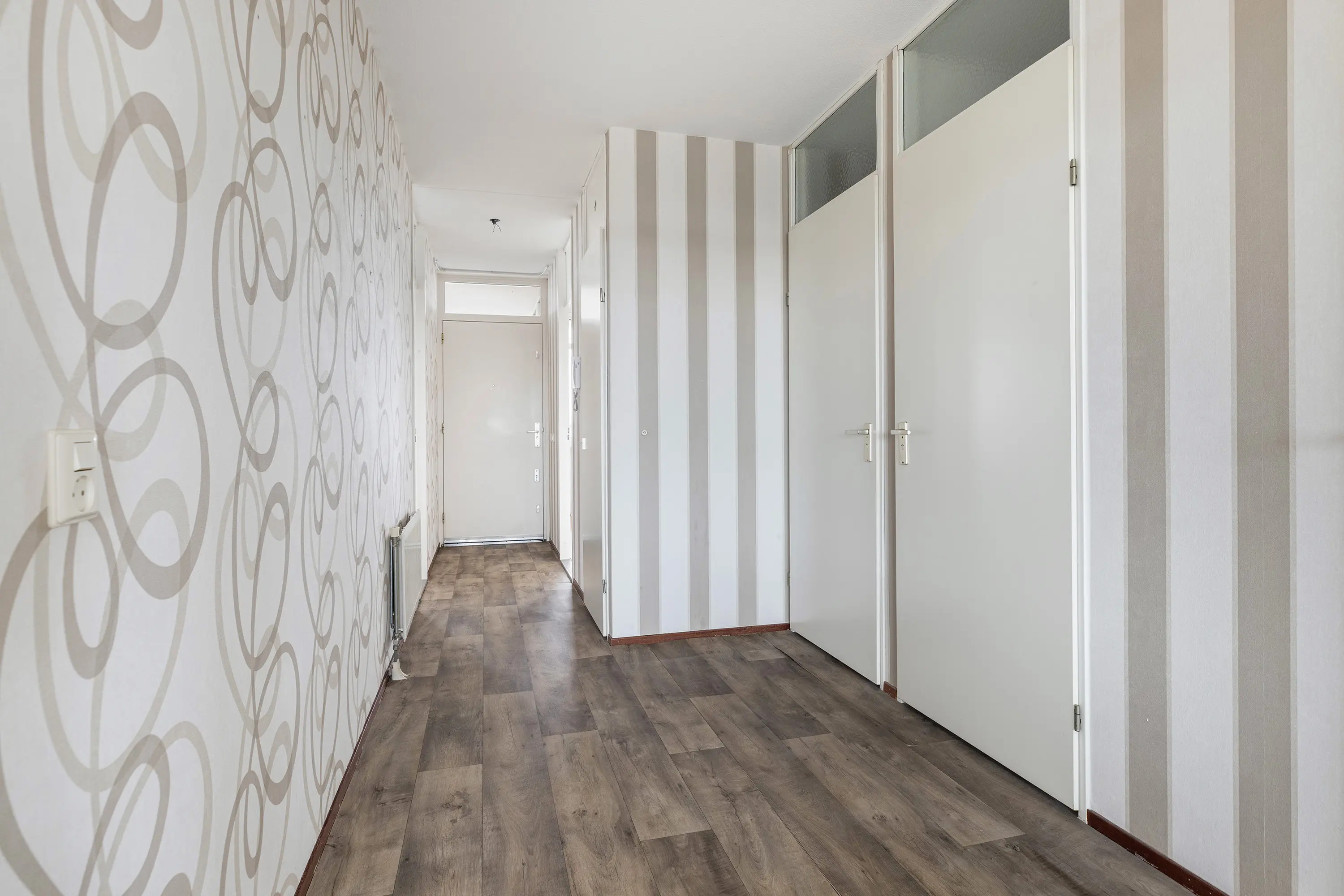 Binnenkomst in de centrale hal met brievenbussen, lift, trappenhuis en intercom. Een ideale ingang voor bewoners en bezoekers.