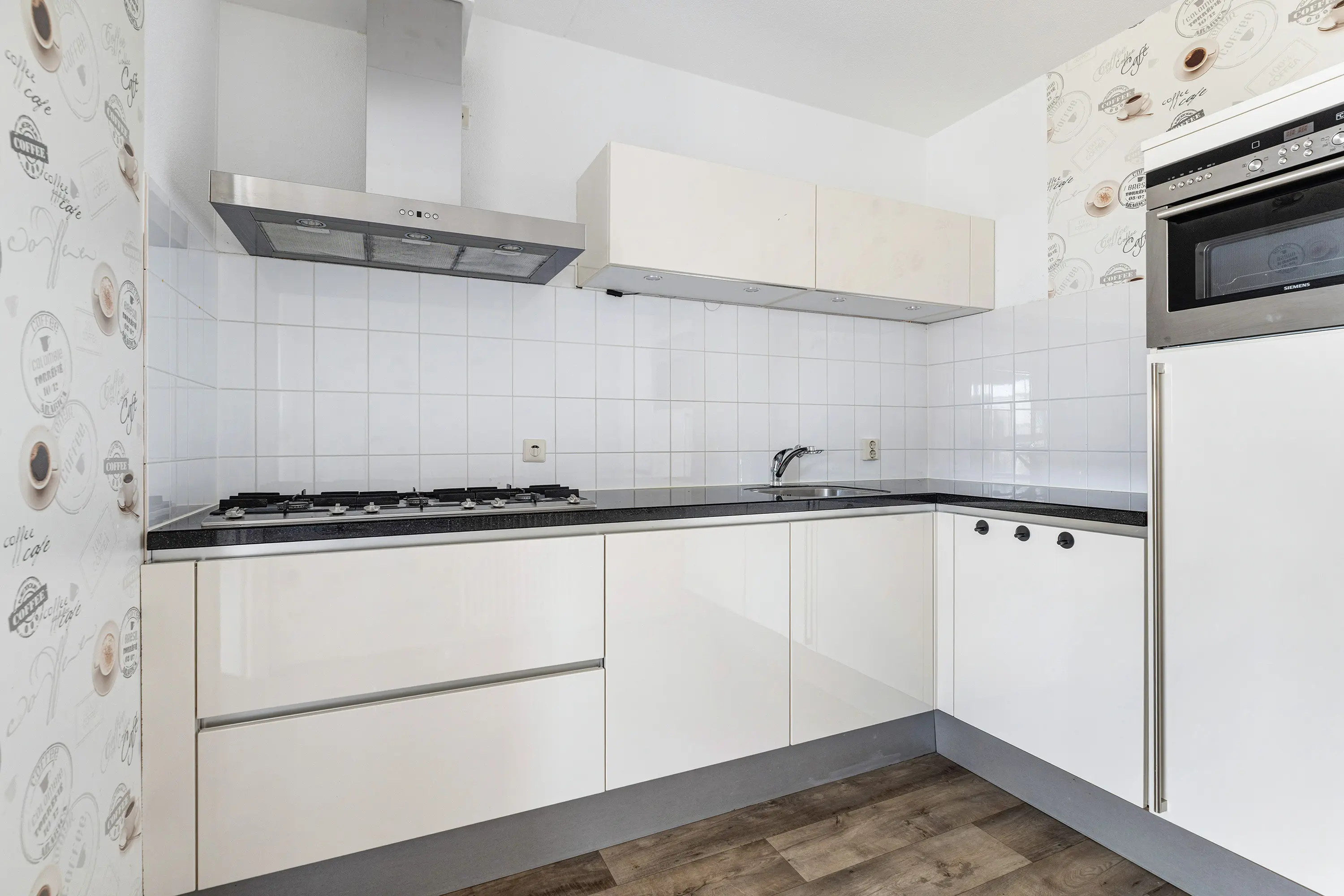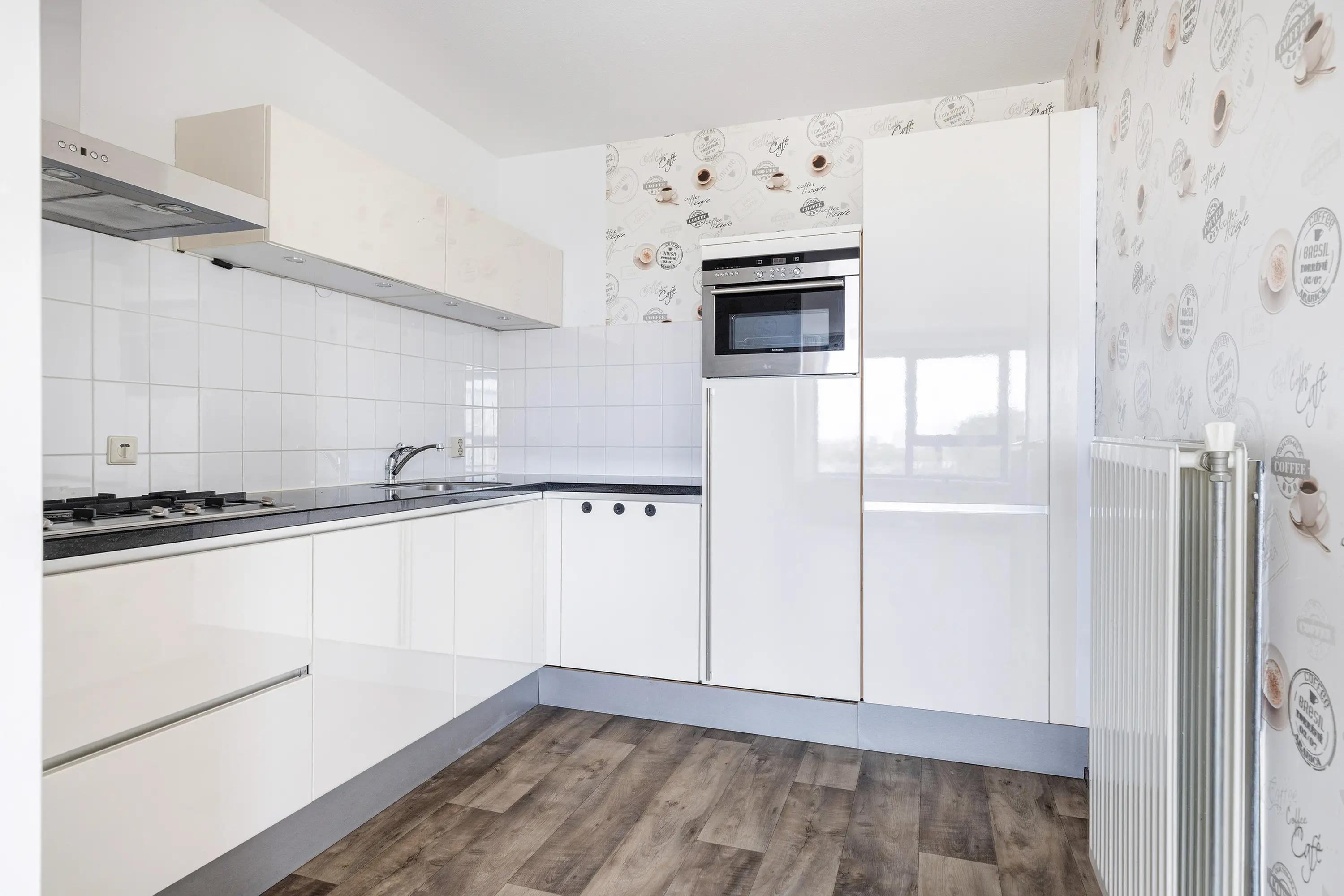De open keuken, in een elegante creme hoogglans kleur, beschikt over diverse inbouwapparatuur: een vaatwasser, twee koelkasten, een 6-pits gaskookplaat, combi oven en een lemans carrousselkast. De keuken nodigt uit tot koken en genieten.